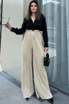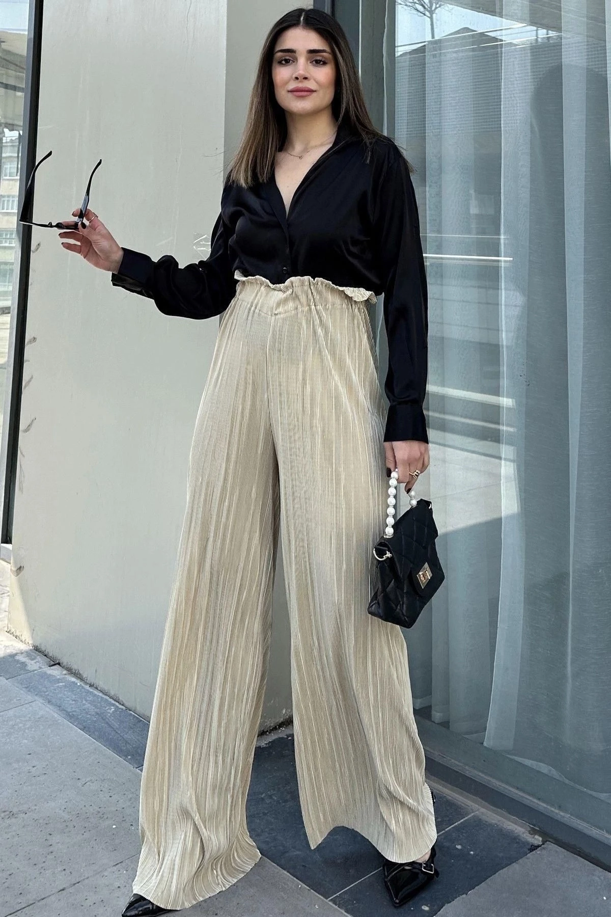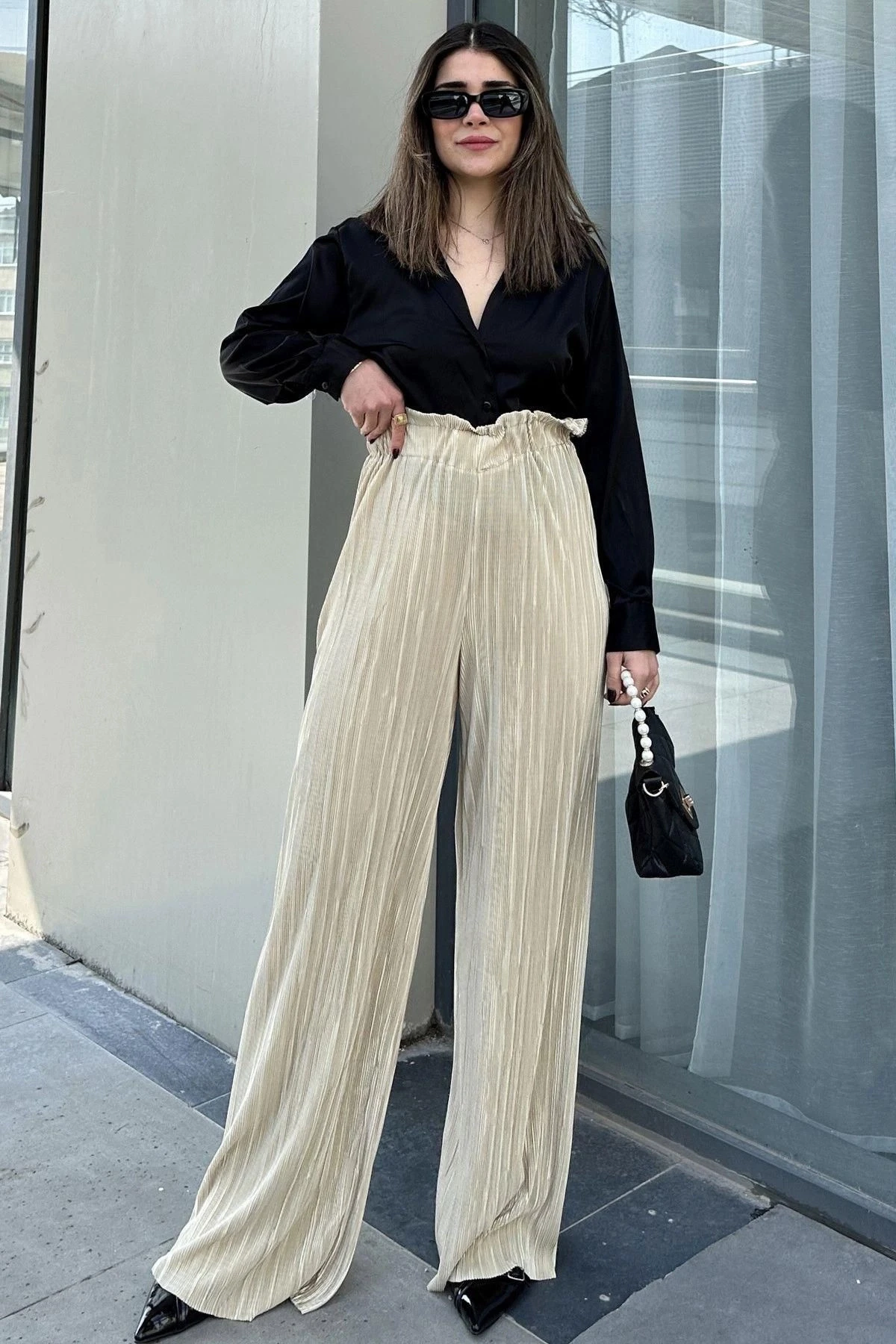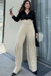 Kadın Sarı Beli Lastikli, Yüksel Bel, Salaş Kesim, Bol Paça Bürümcük Pantolon