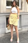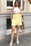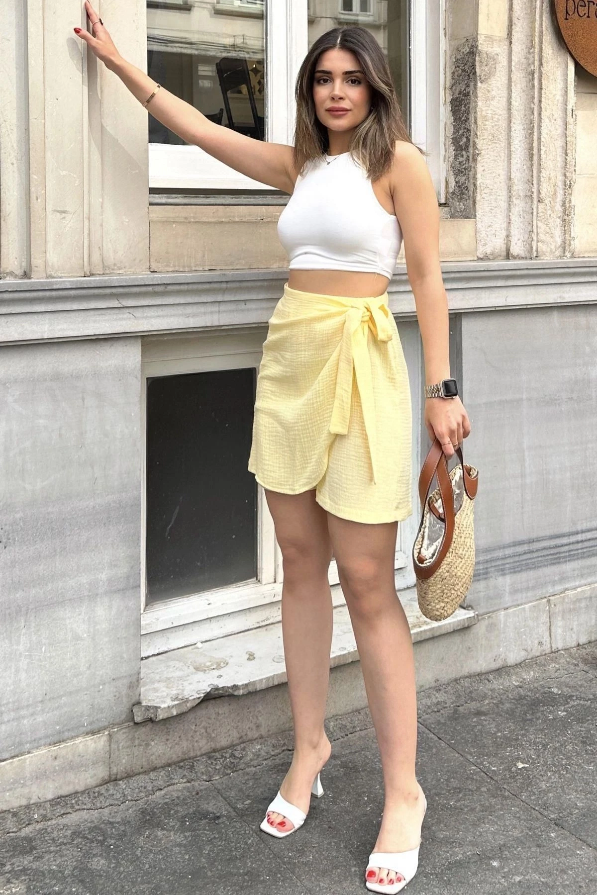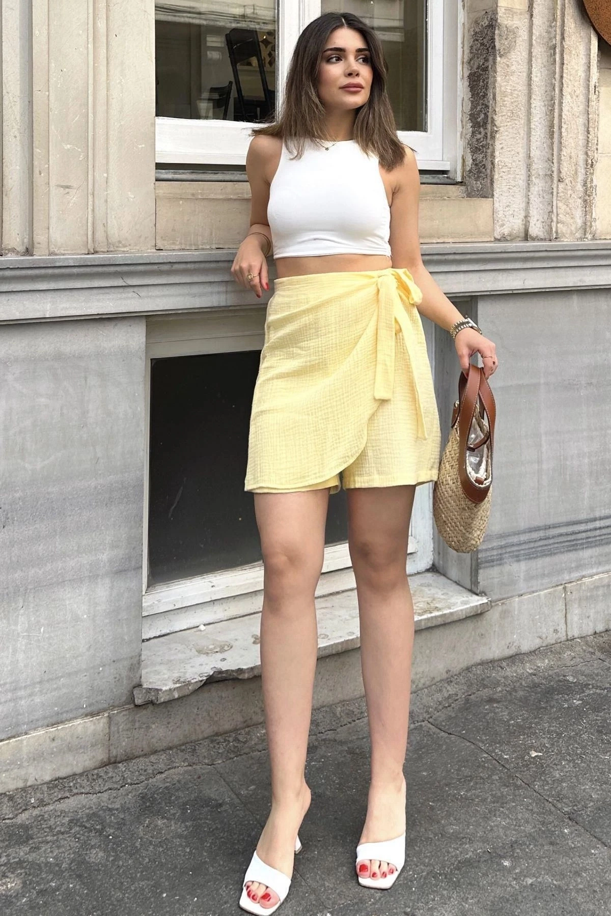 Kadın Sarı Çapraz Bağlama Detaylı, Terletmez Pamuklu, İthal Müslin Kumaş Etek Şort