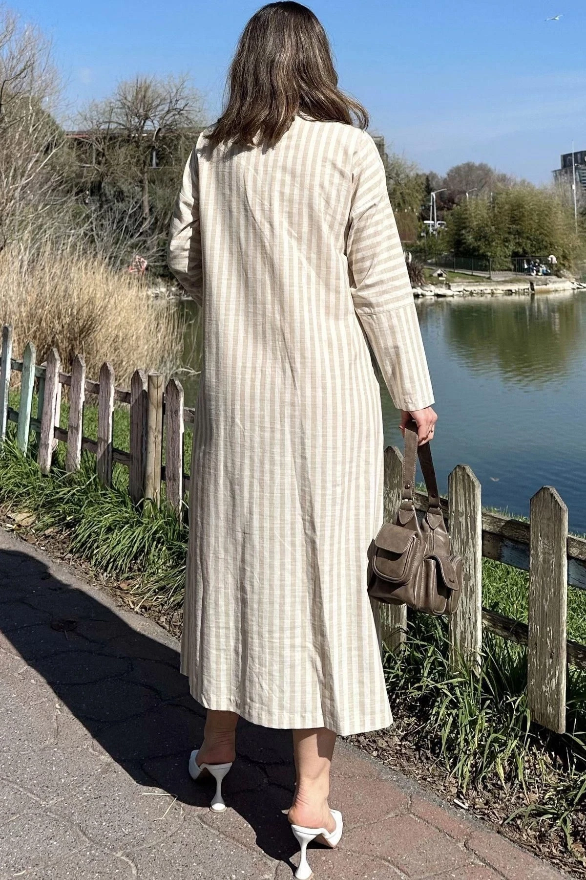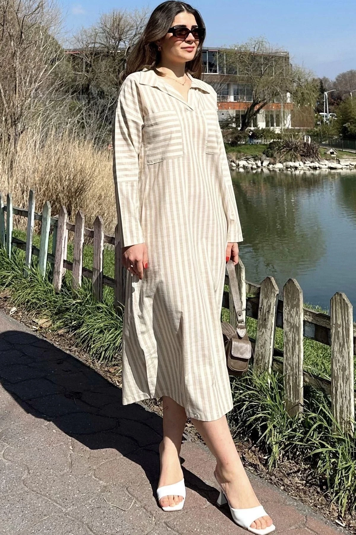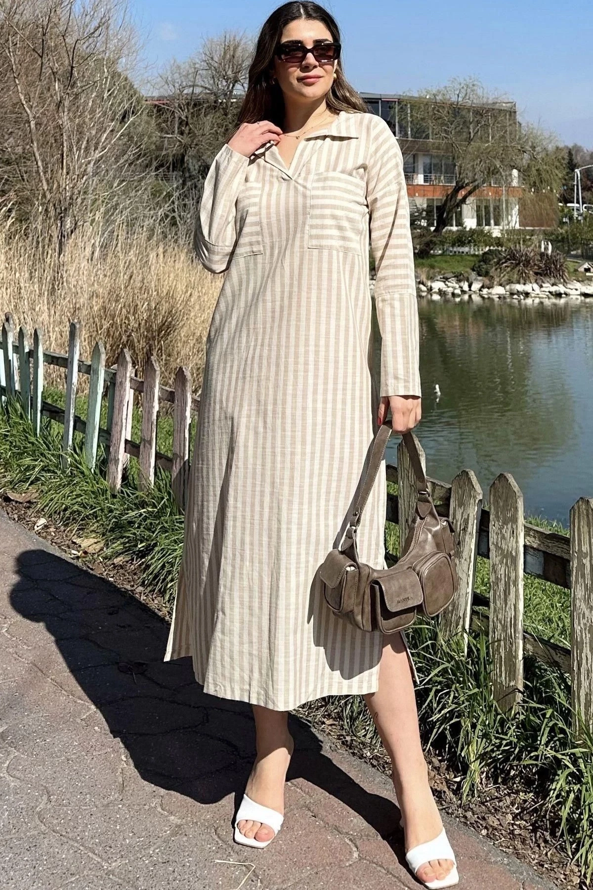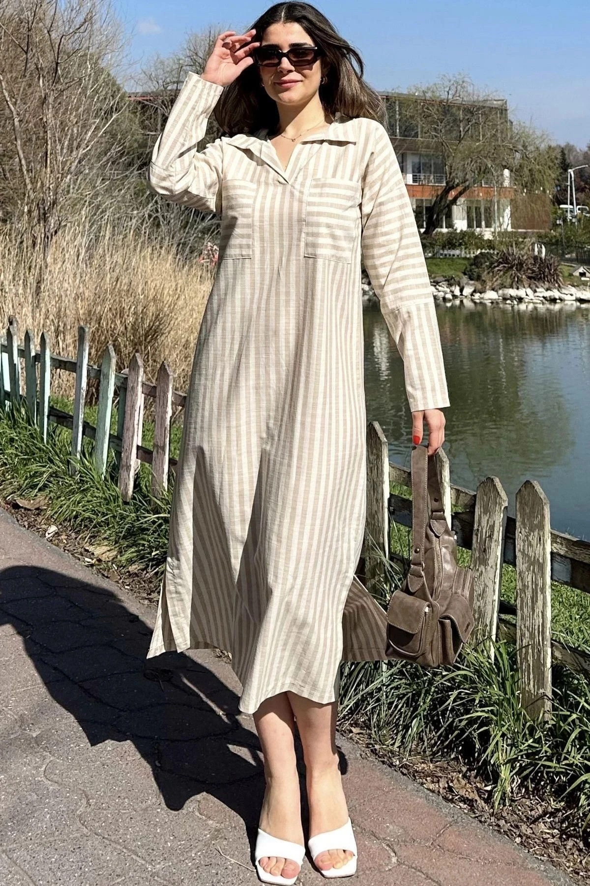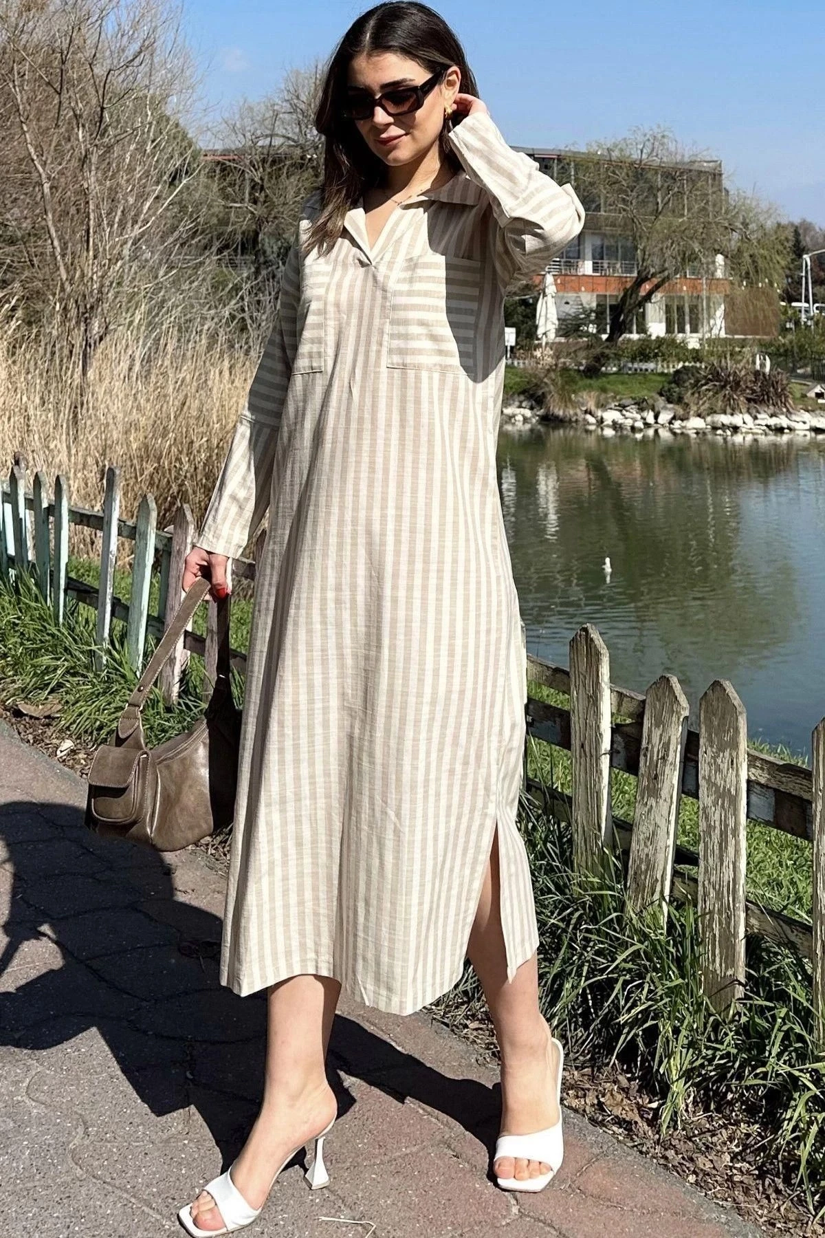 Kadın Sarı Çizgili, Polo Yaka, Yırtmaçlı, Çift Cepli, Salaş Keten Elbise