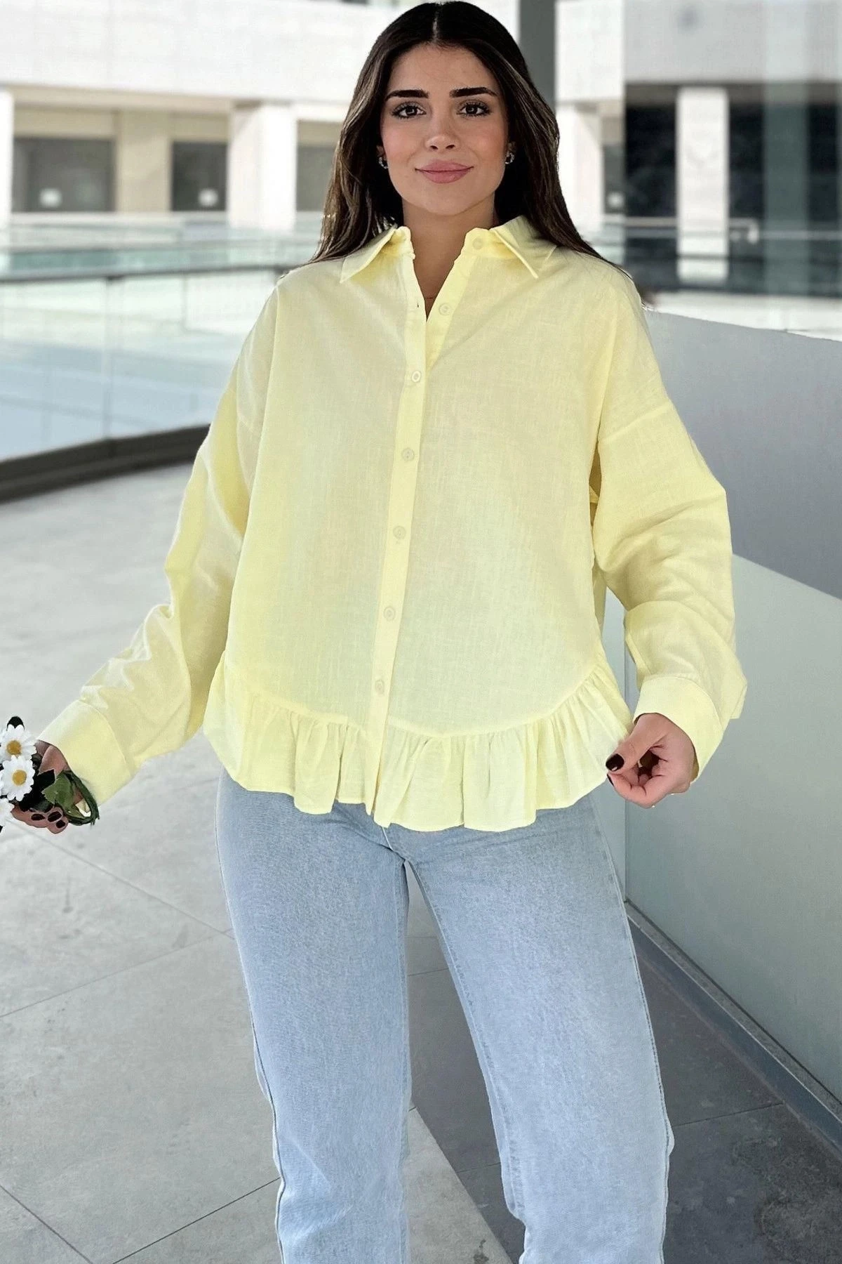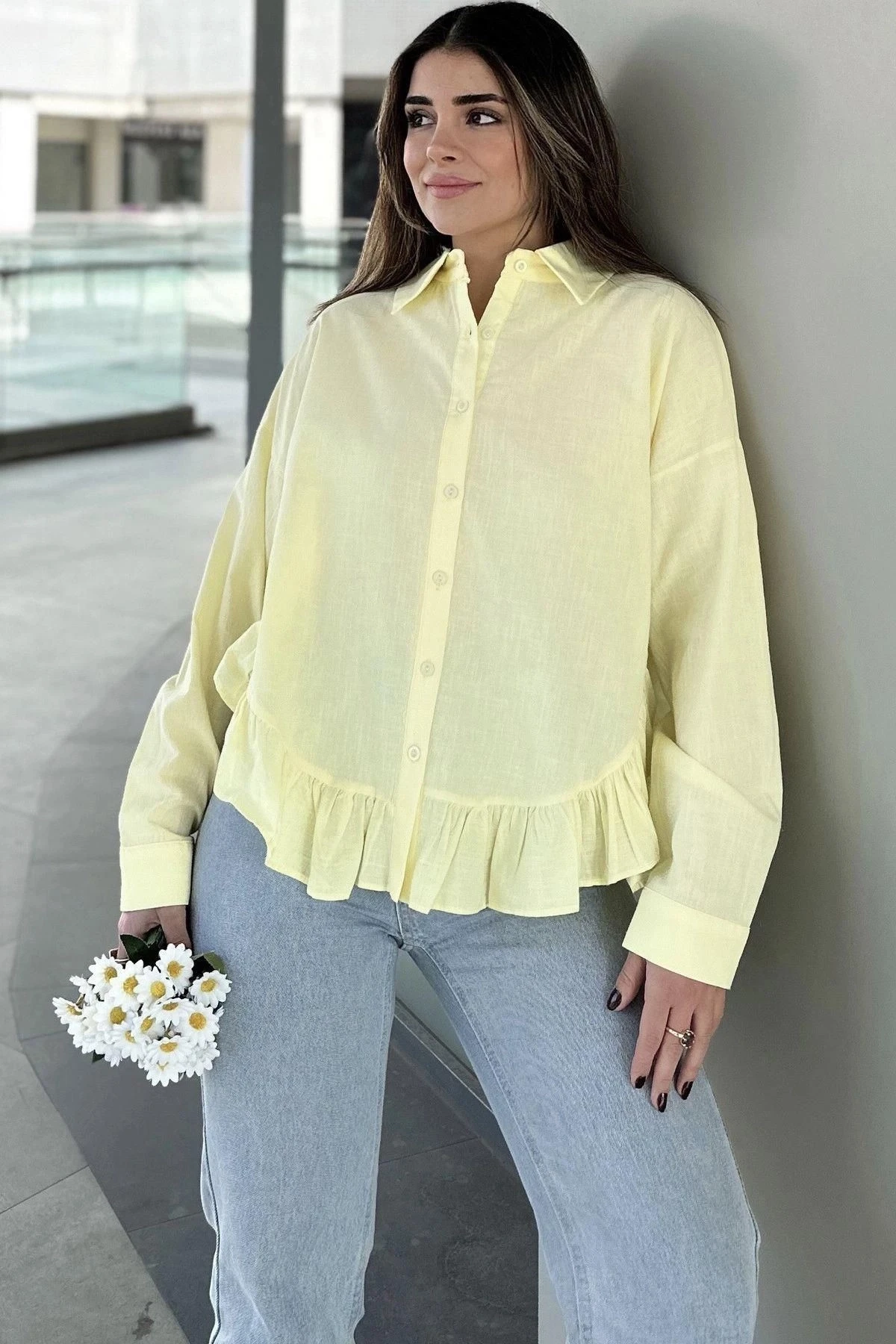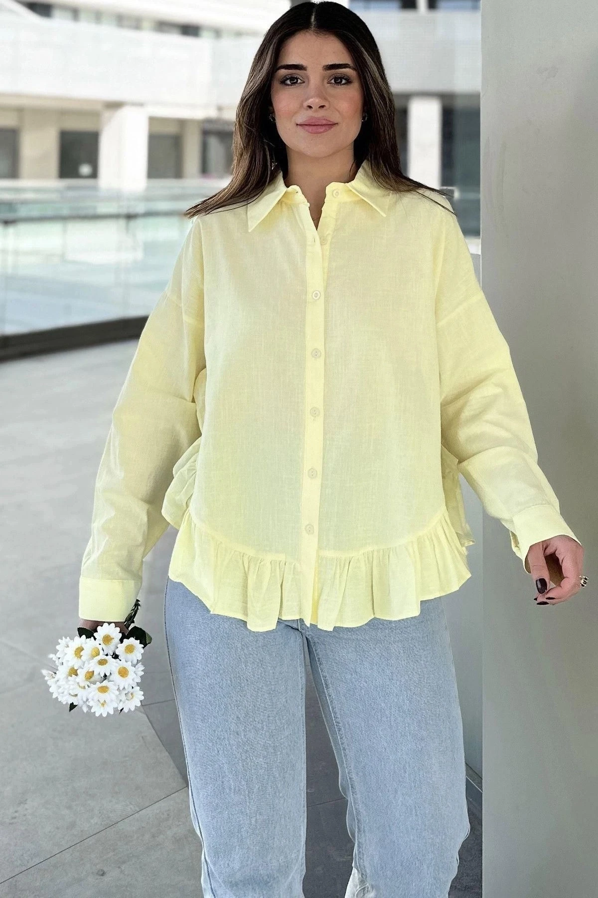 Kadın Sarı Eteği Fırfır Ve Yırtmaç Detaylı, Terletmez Rahat Kumaş, Salaş Gömlek ( Pamuklu Keten)