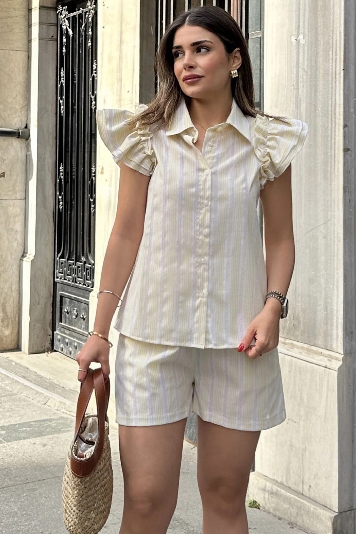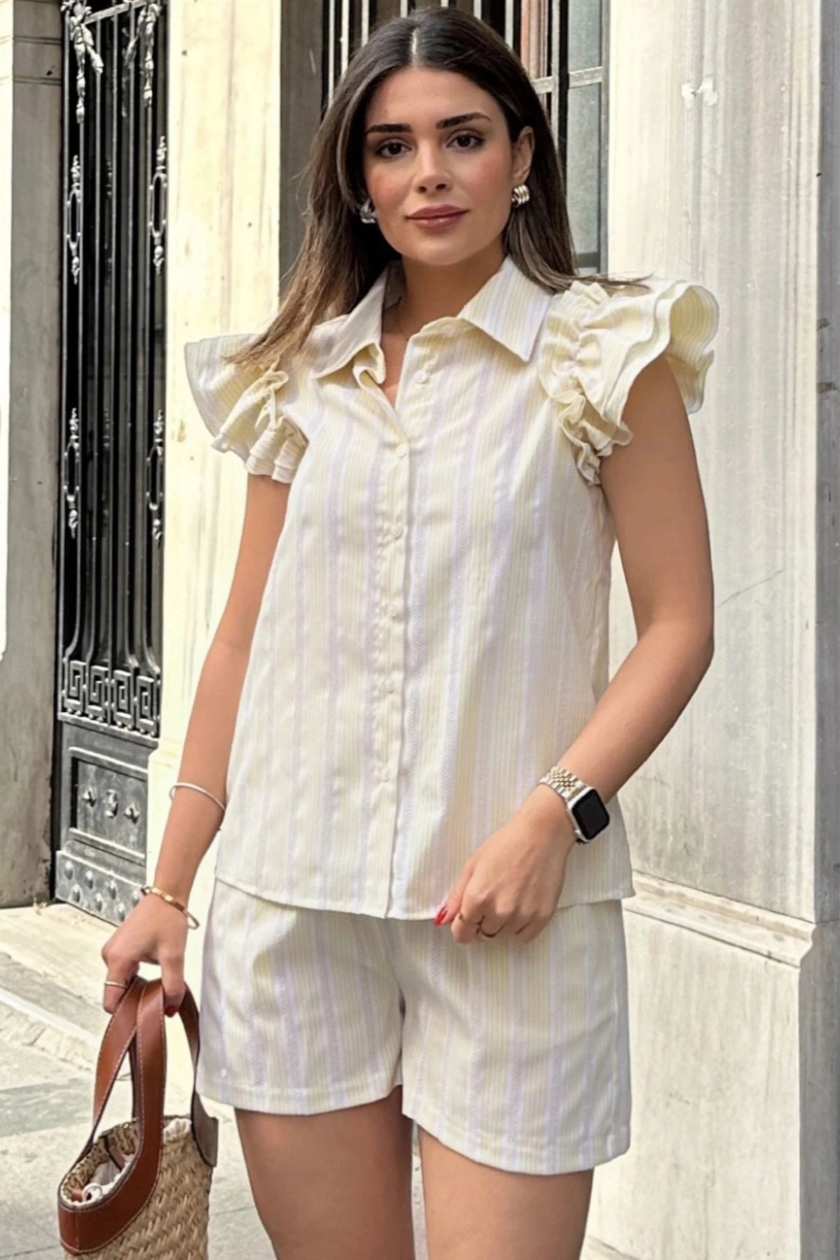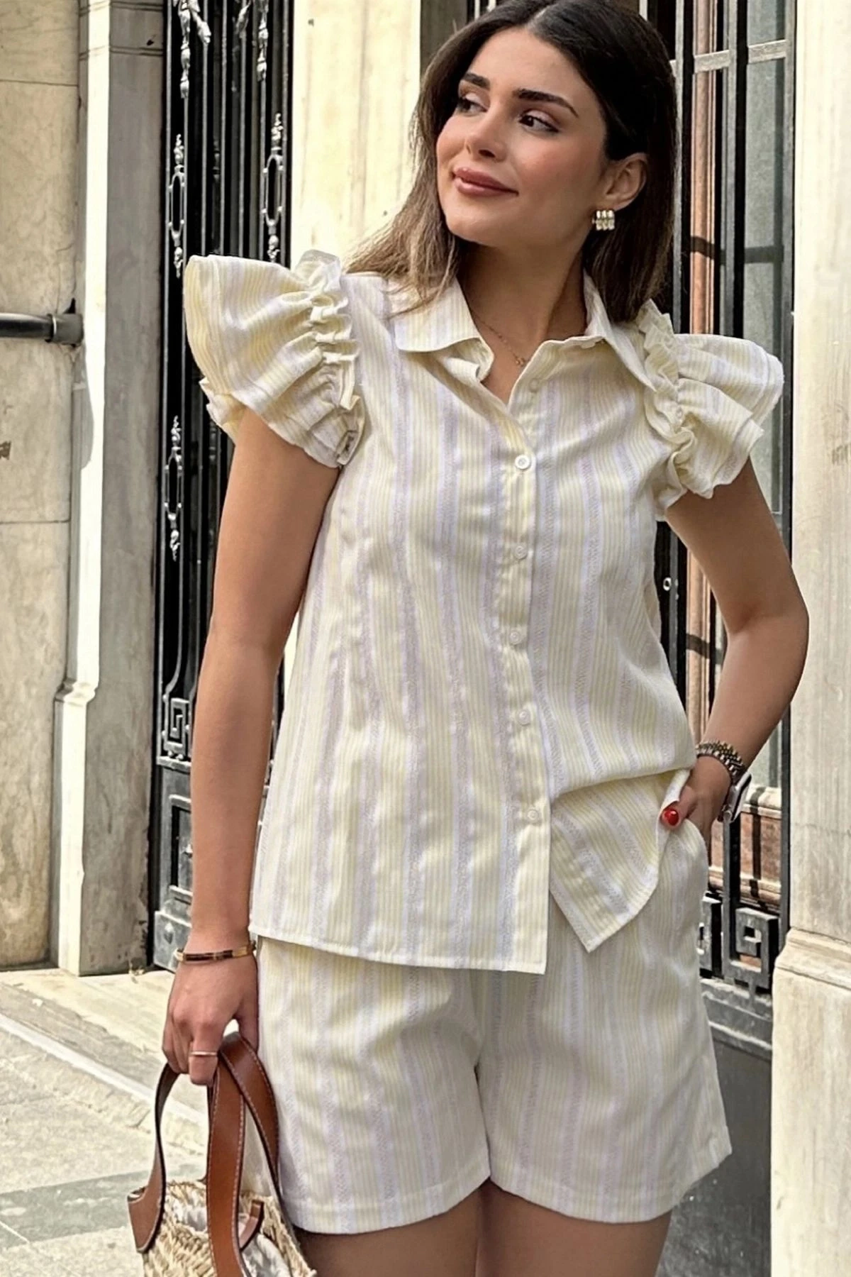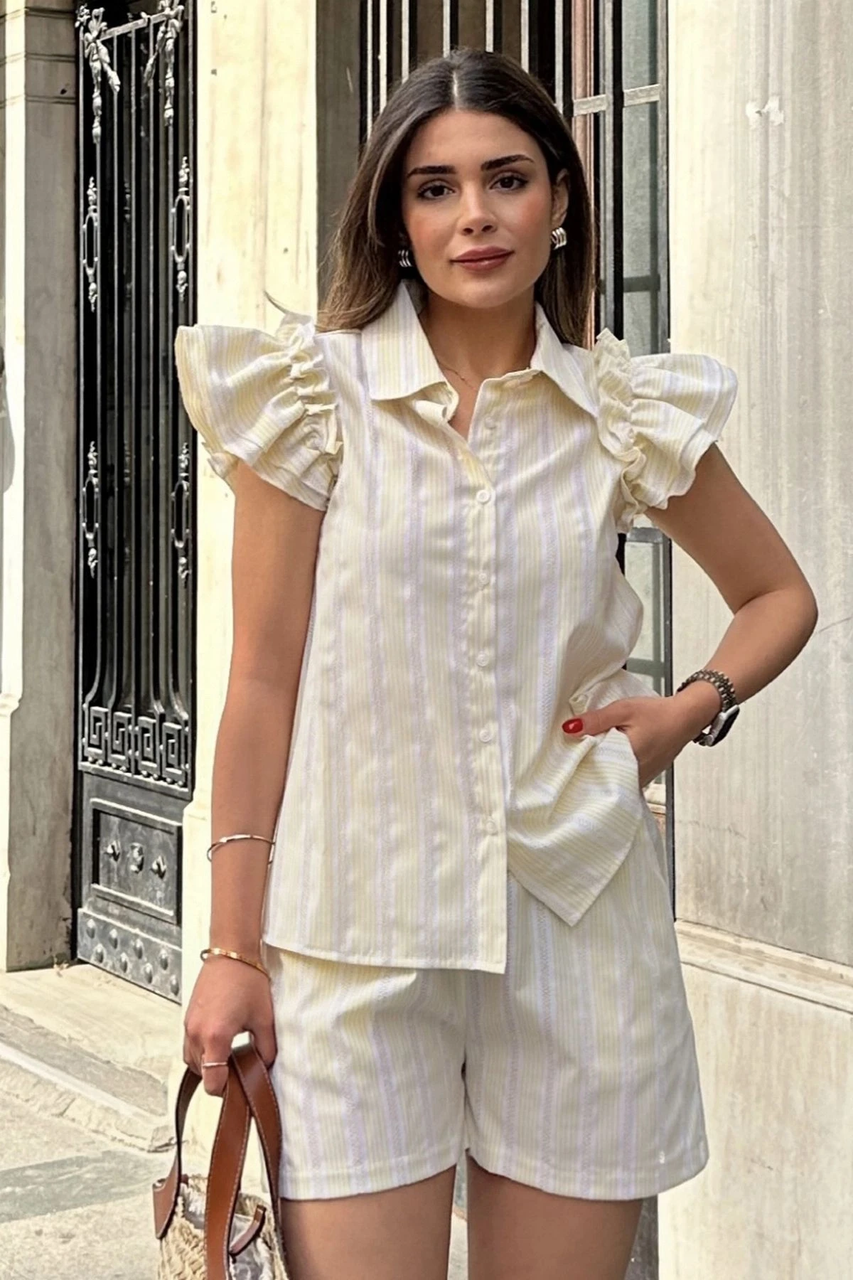 Kadın Sarı Kısa Kol, Omuzları Flare Fırfır Tasarımlı, Terletmez, Çizgi Desenli Fisto Gömlek