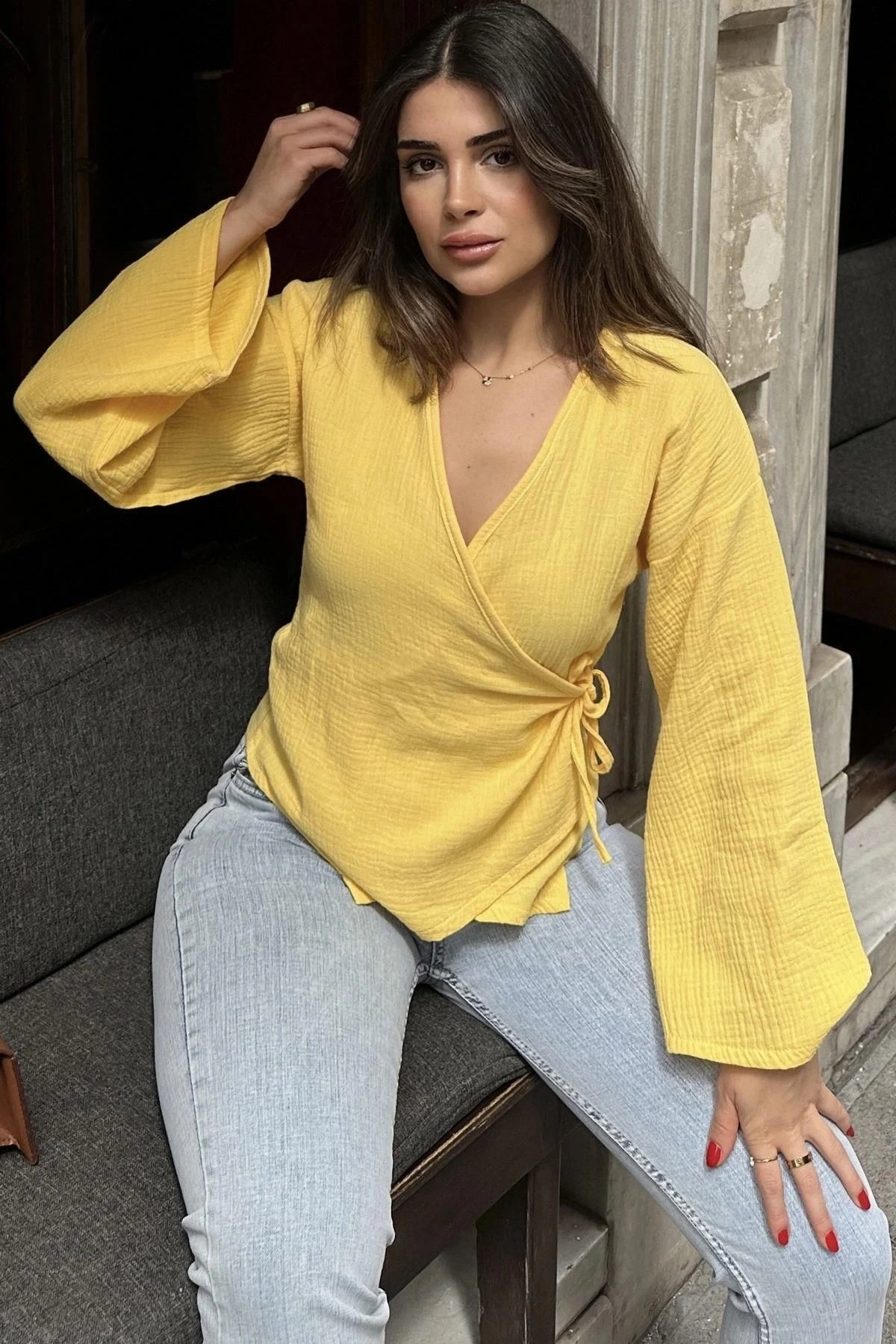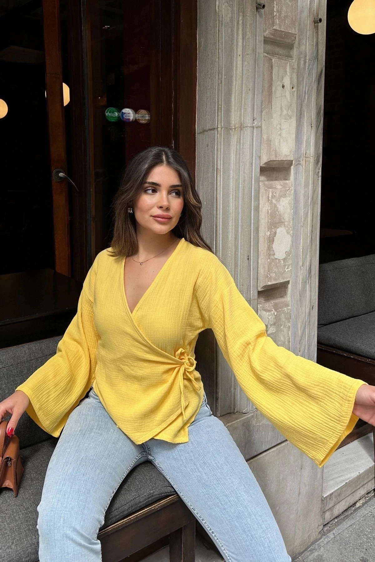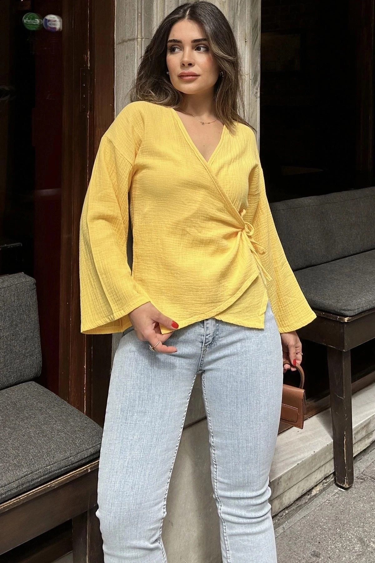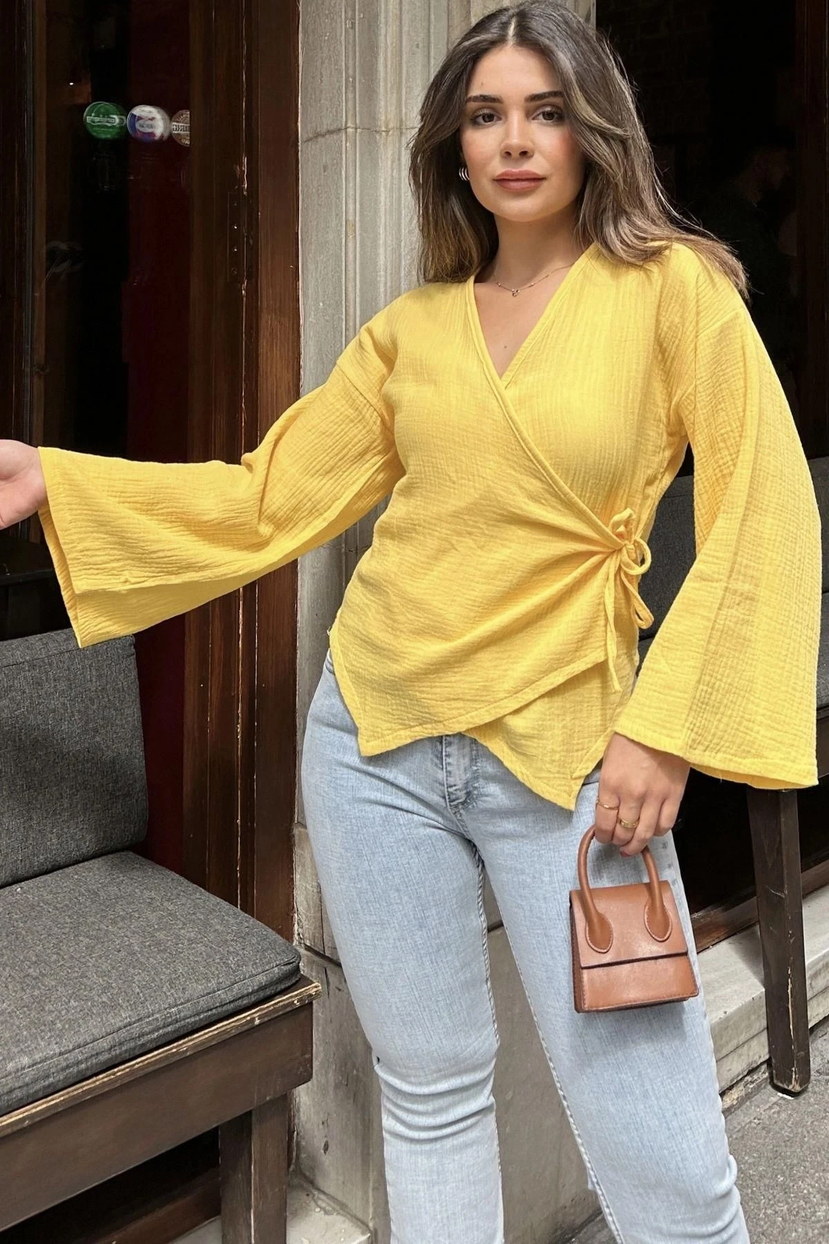 Kadın Sarı Kruvaze Yaka, Çapraz Bağlamalı, Flare Kollu, Salaş Müslin Bluz