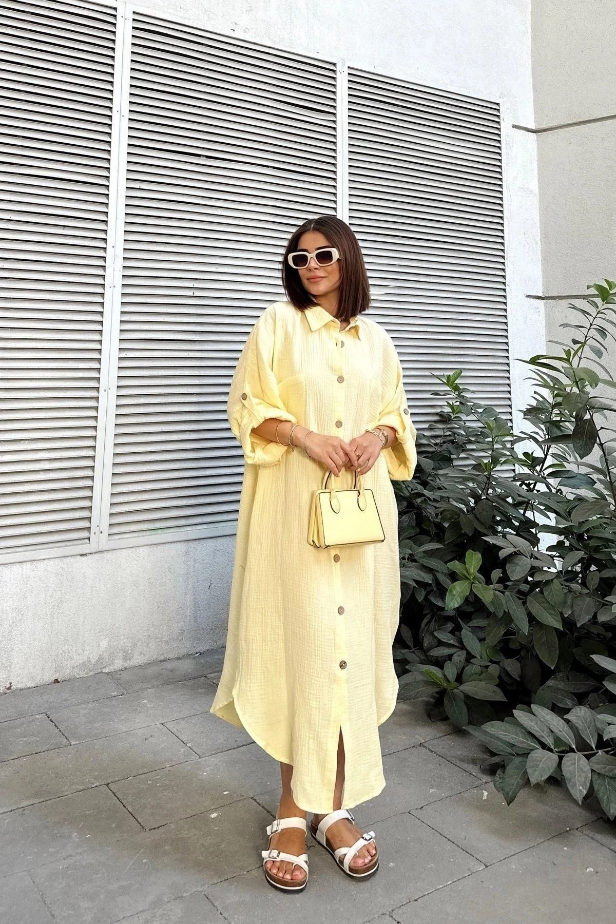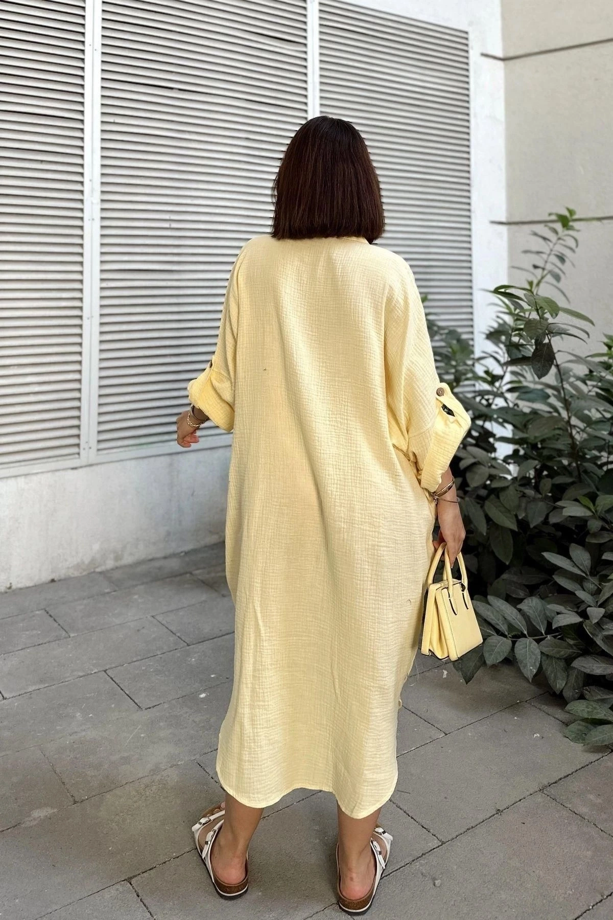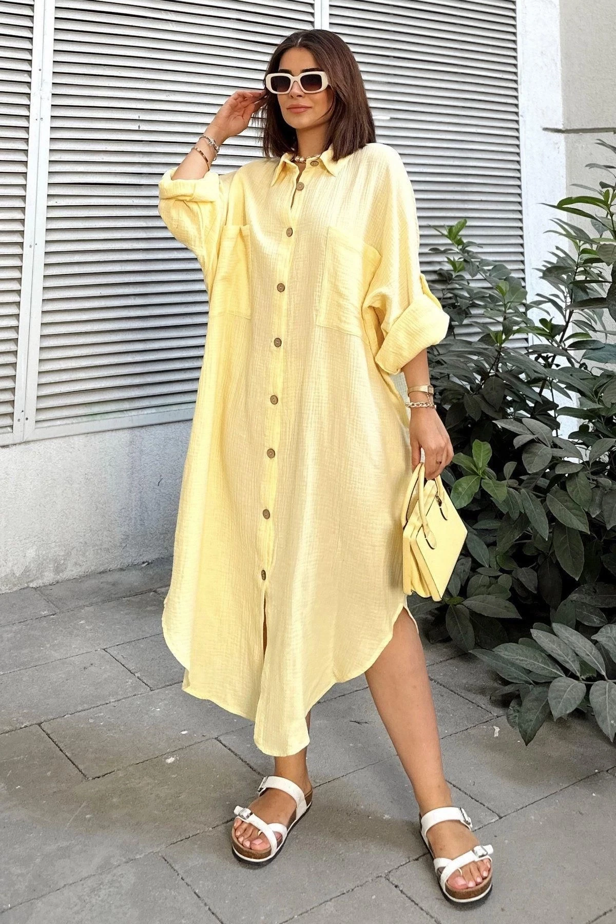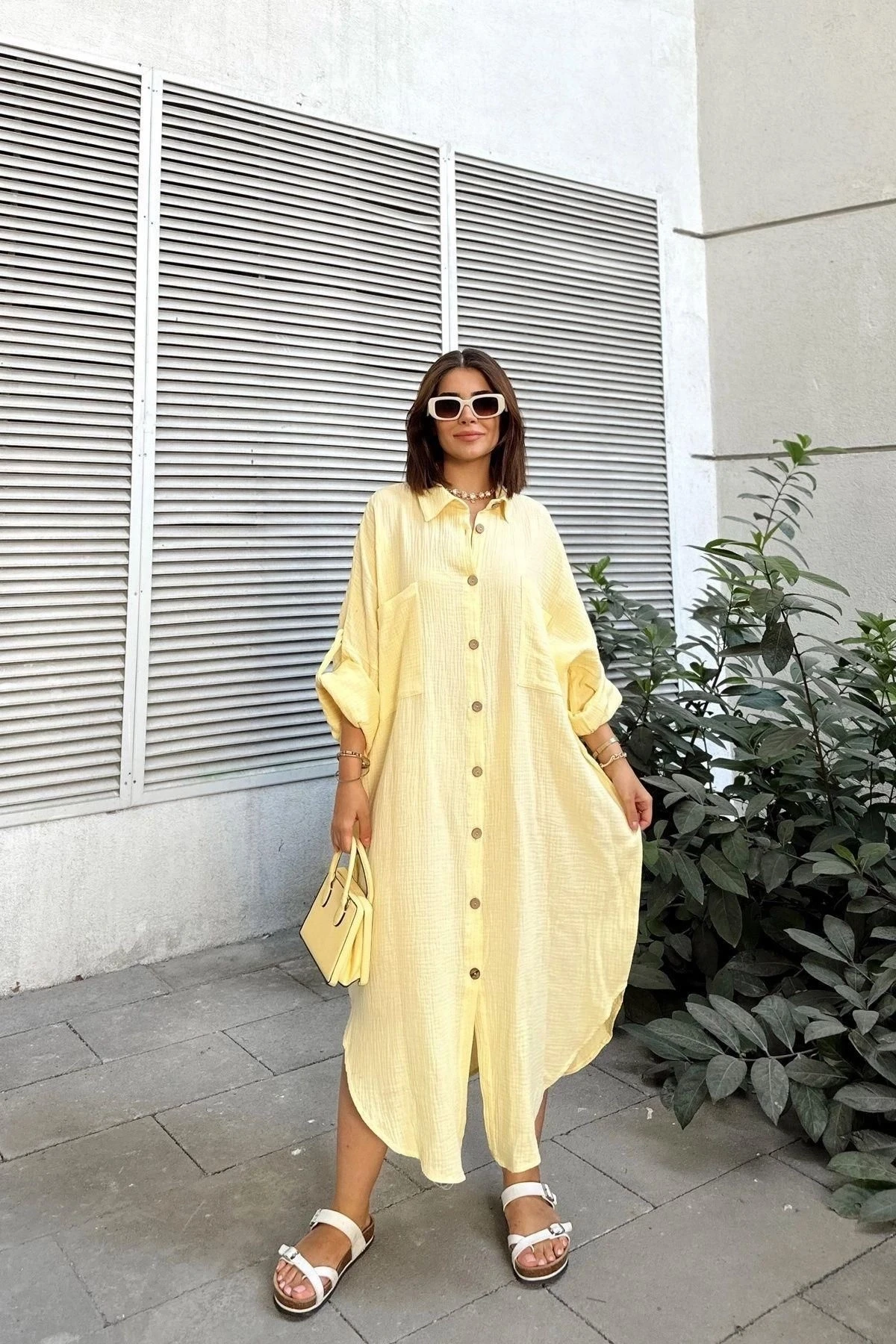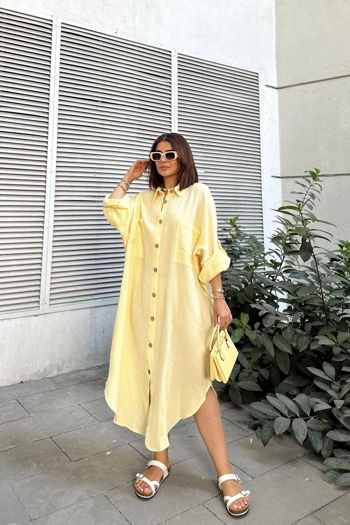Kadın Sarı Muslin Kumaş, Yarasa Kol, Eteği Oval, Çift Cepli, Uzun Oversize Salaş Gömlek Elbise