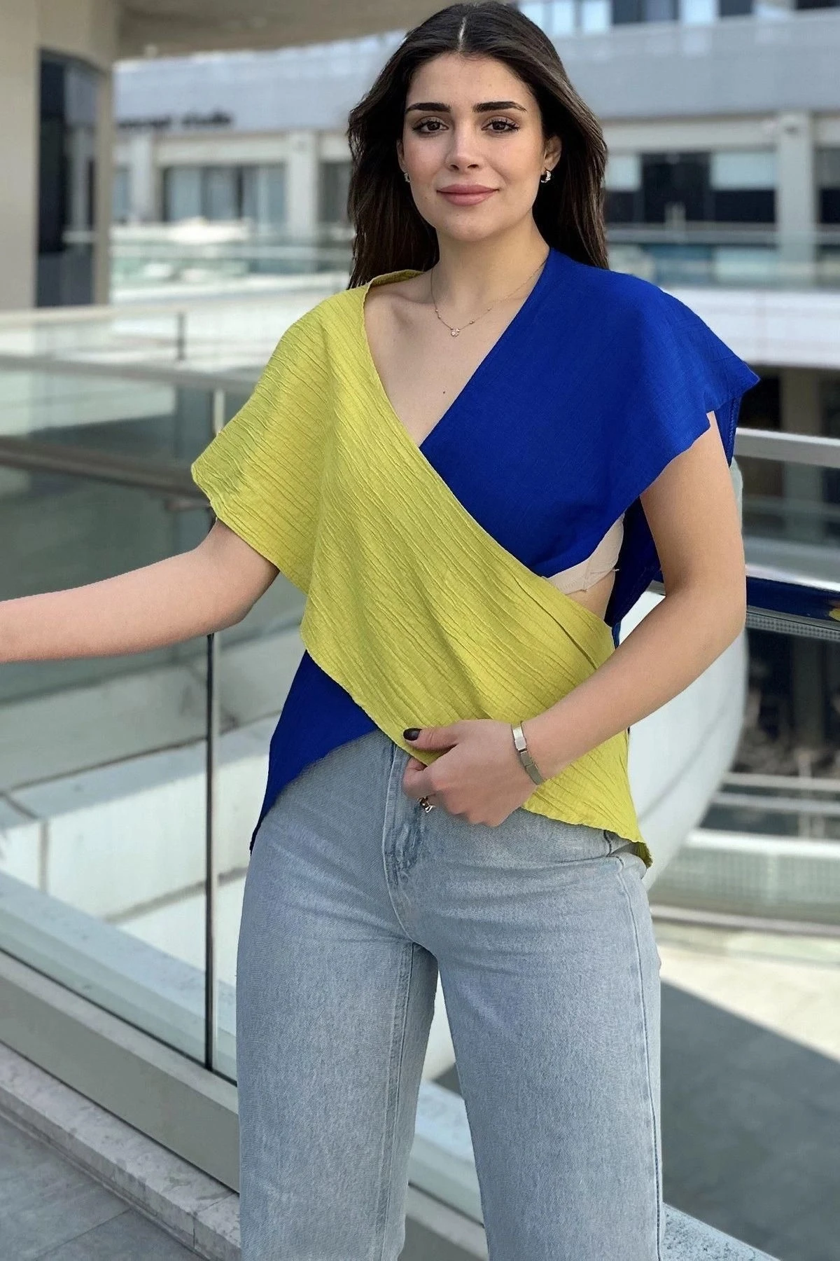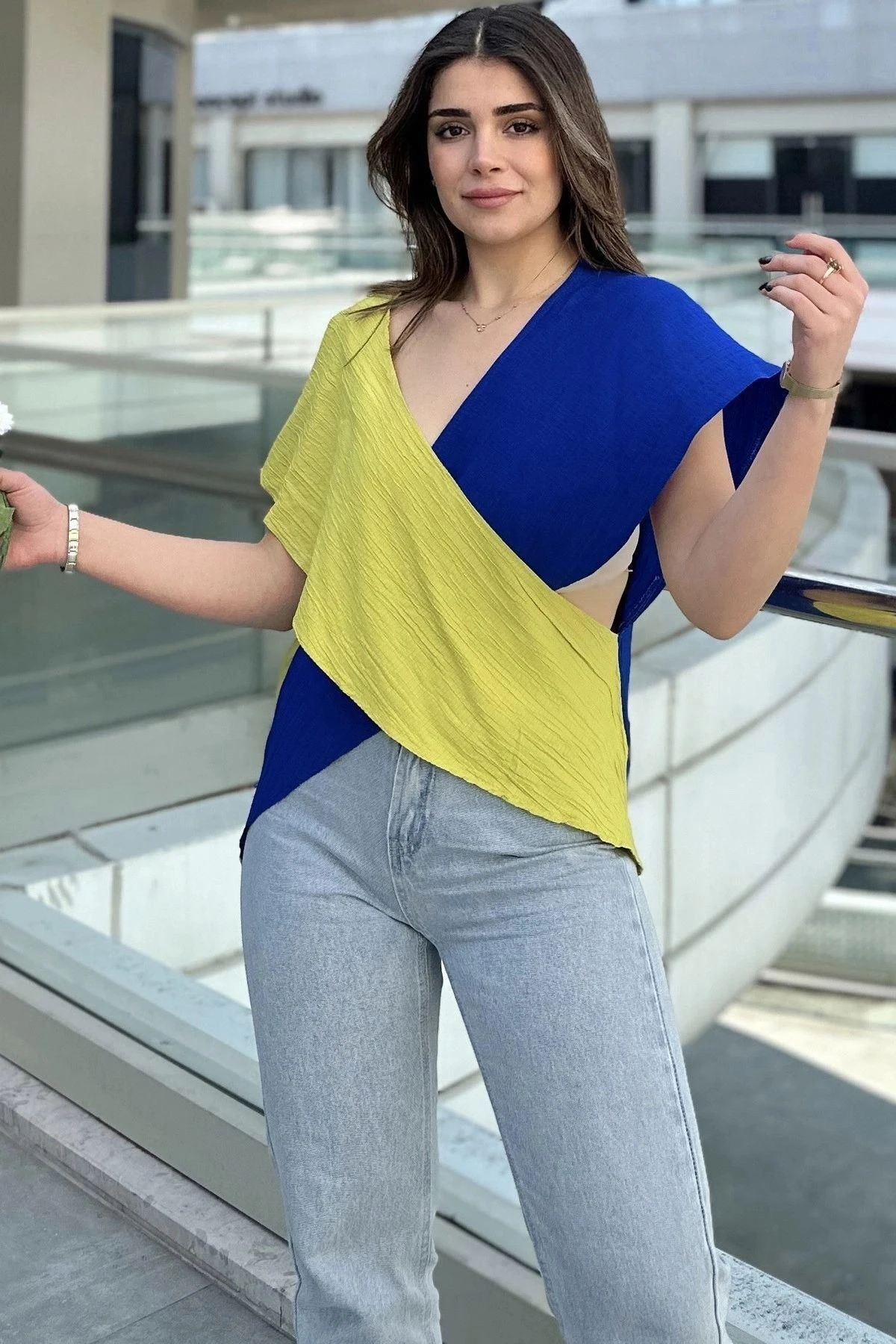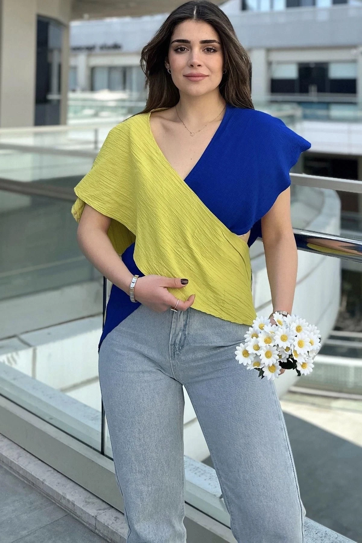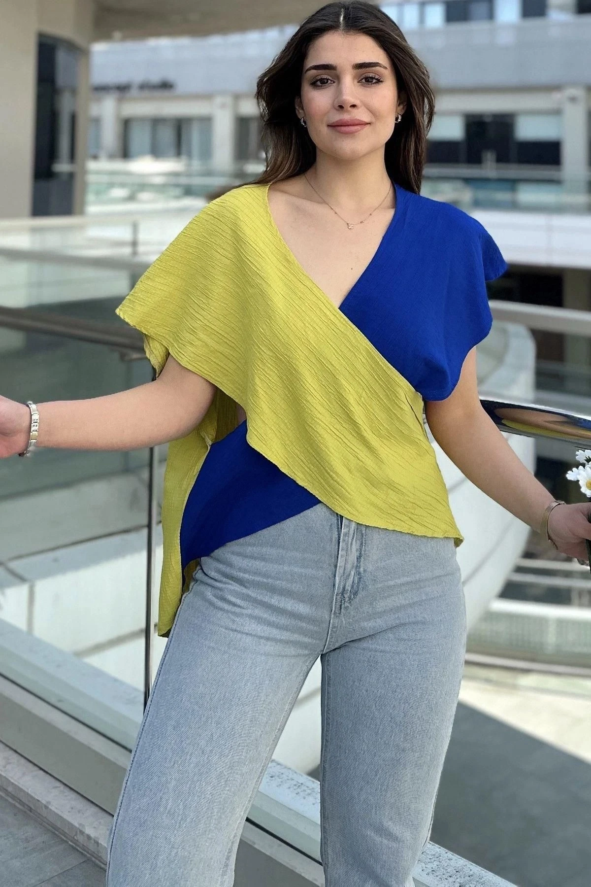 Kadın Sarı & Saks İki Renkli, Derin V Yaka, Kolsuz, Çapraz Bloklu, Salaş Bluz