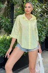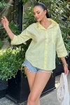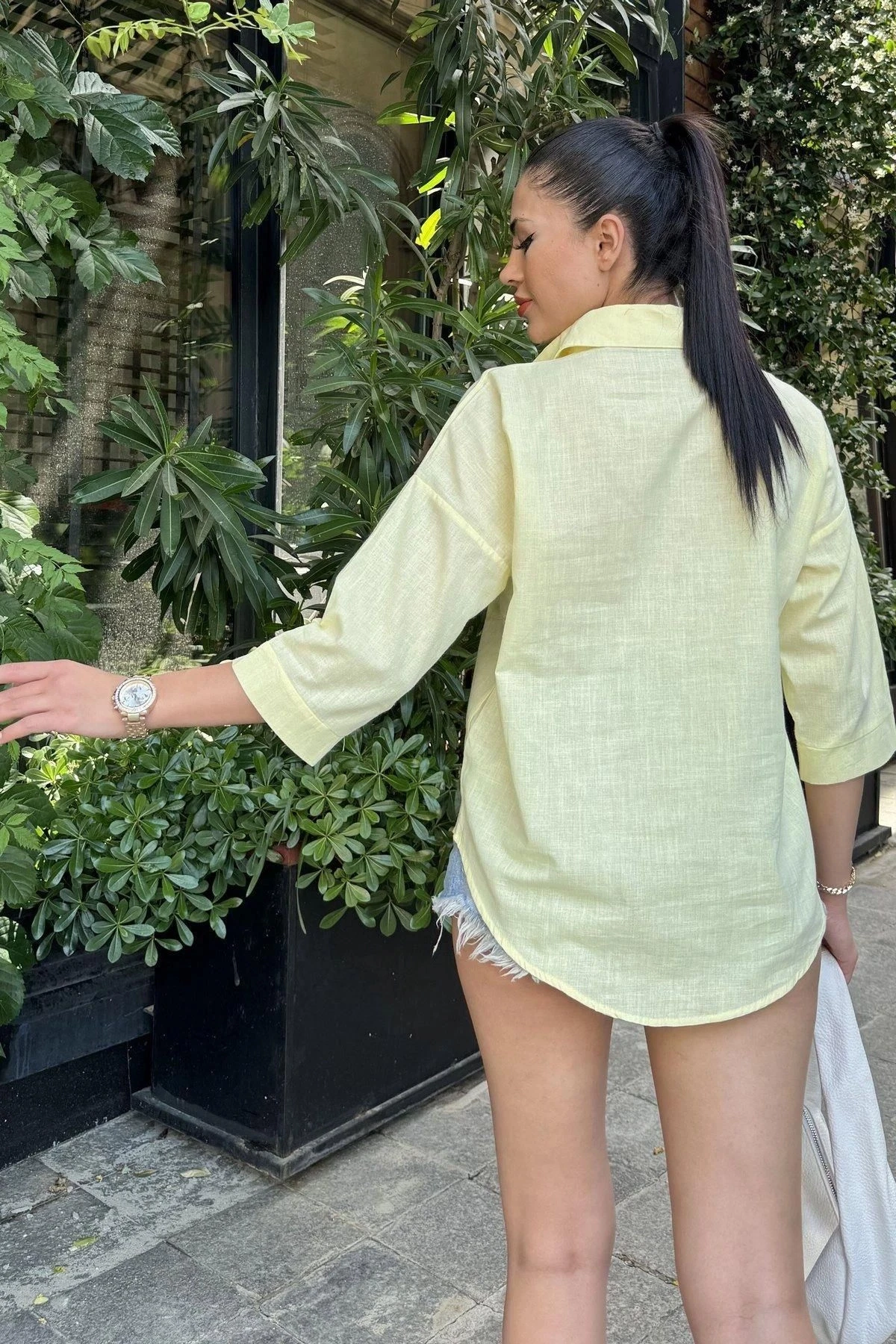 Kadın Sarı Truvakar Kol, Oval Kesim, Terletmez, Flamlı Keten Salaş Gömlek