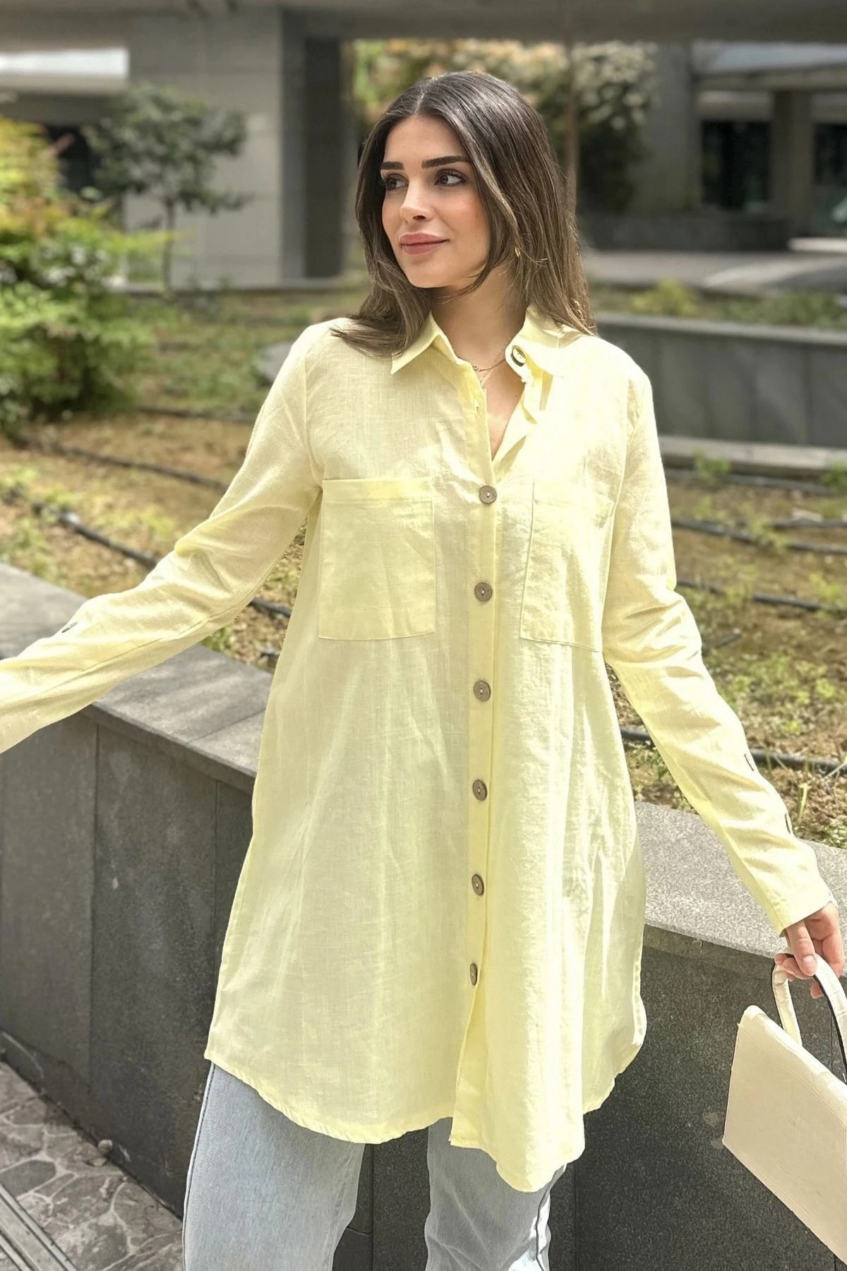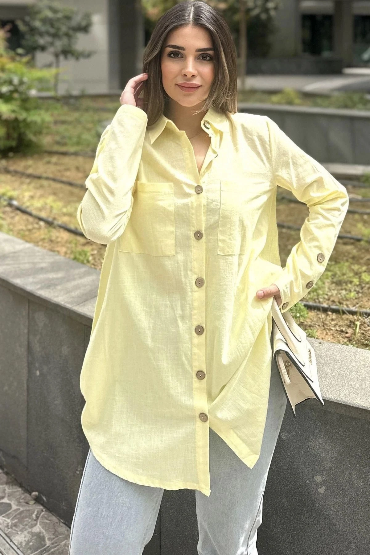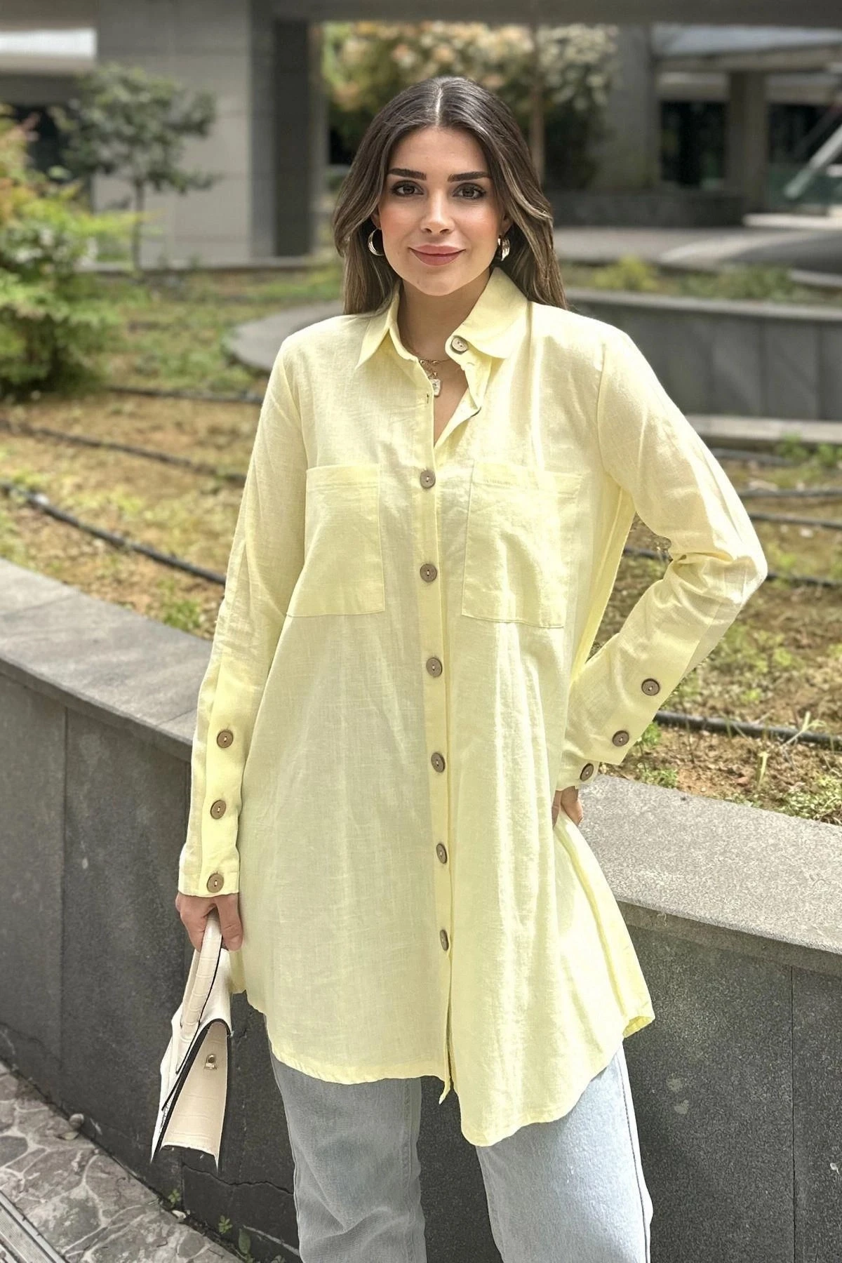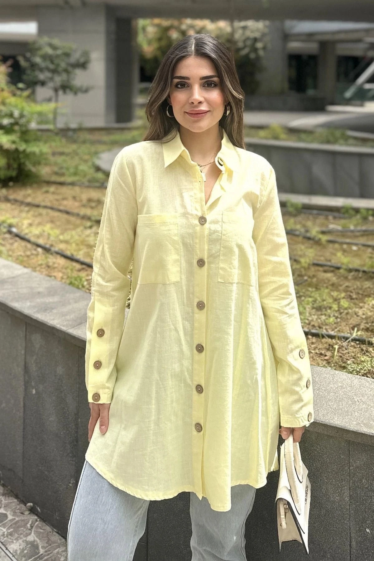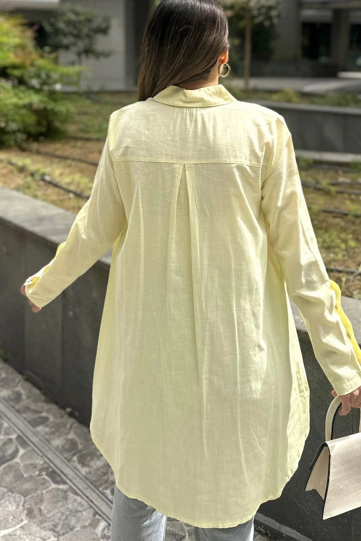 Kadın Sarı Uzun Kol, Ahşap Düğme Detaylı, Arkası Pliseli, Salaş Ve Uzun, Pamuklu Tunik Gömlek