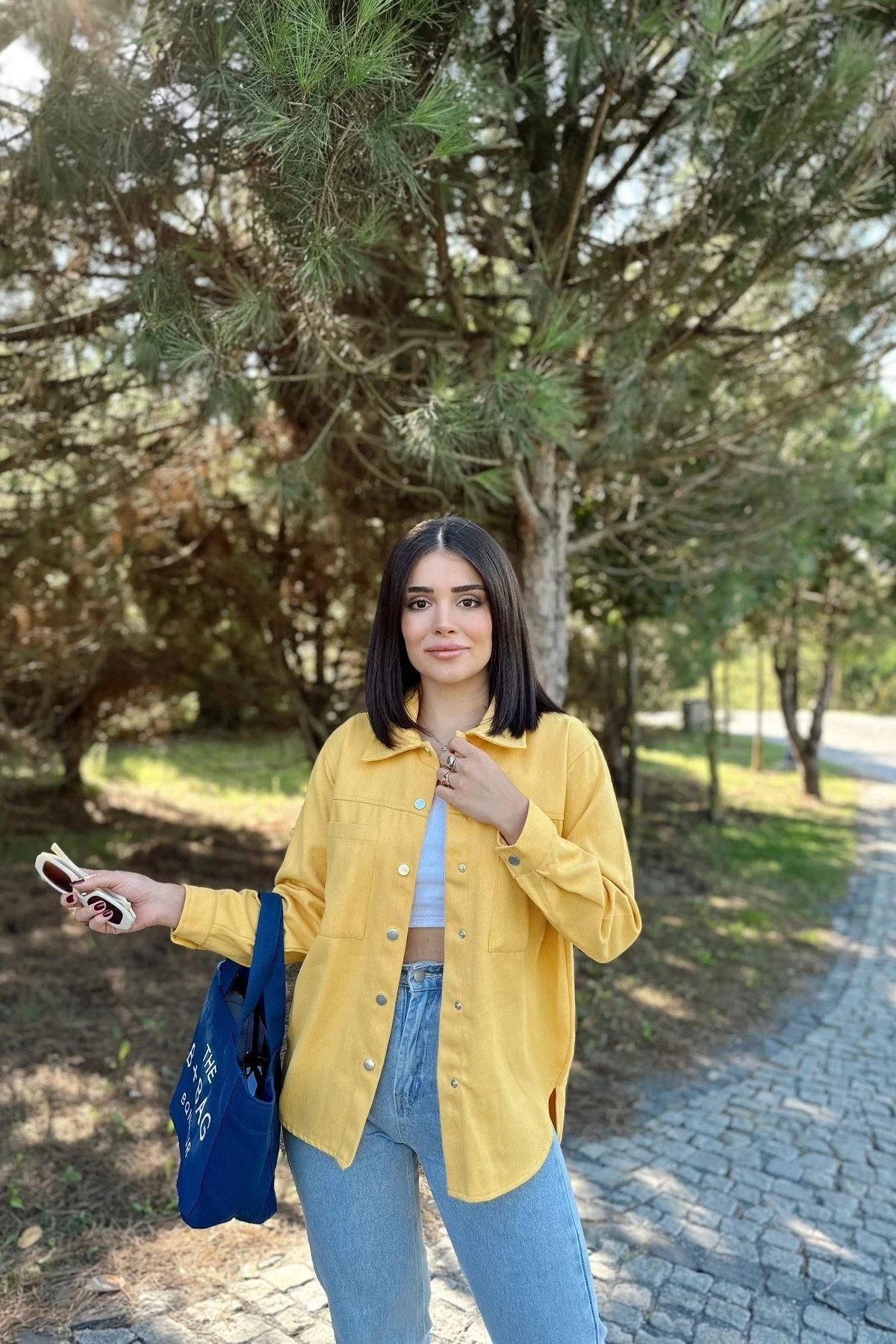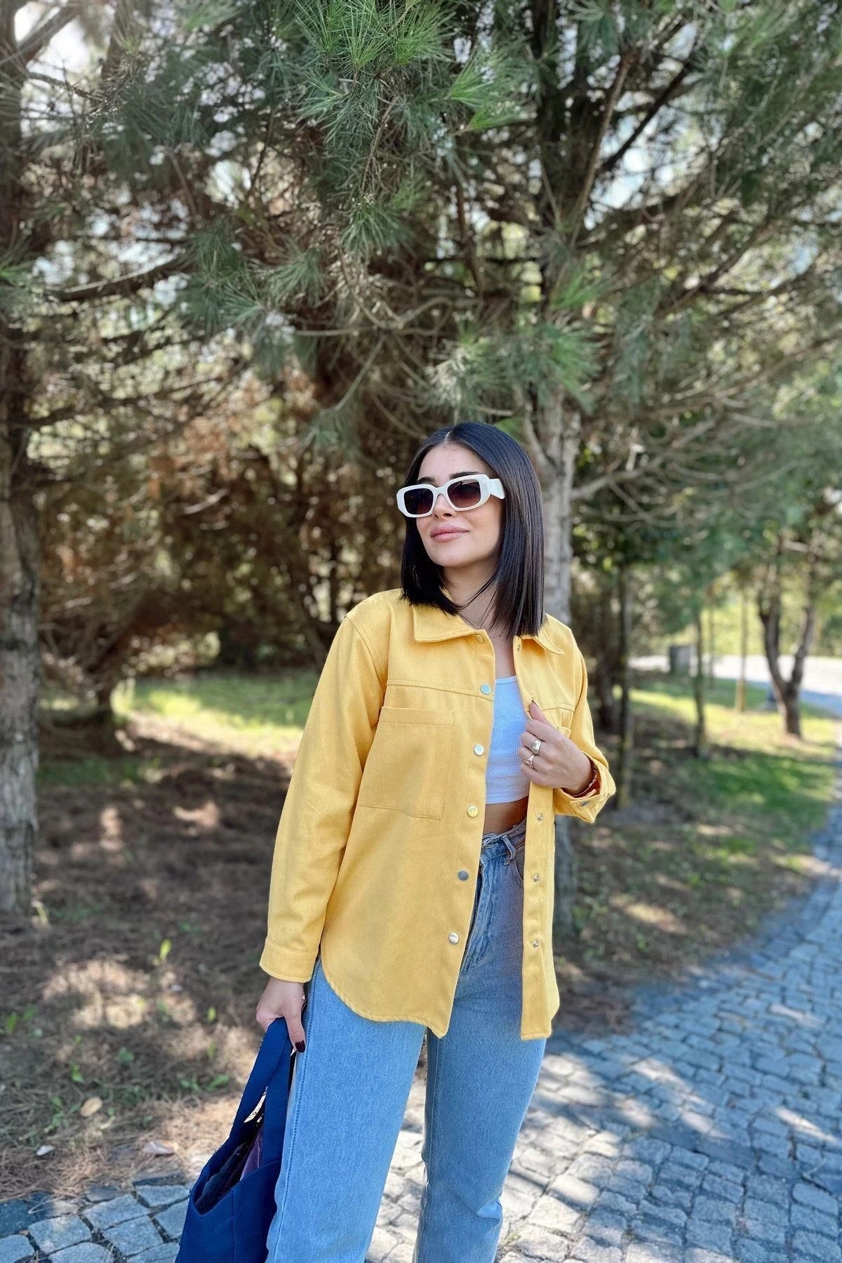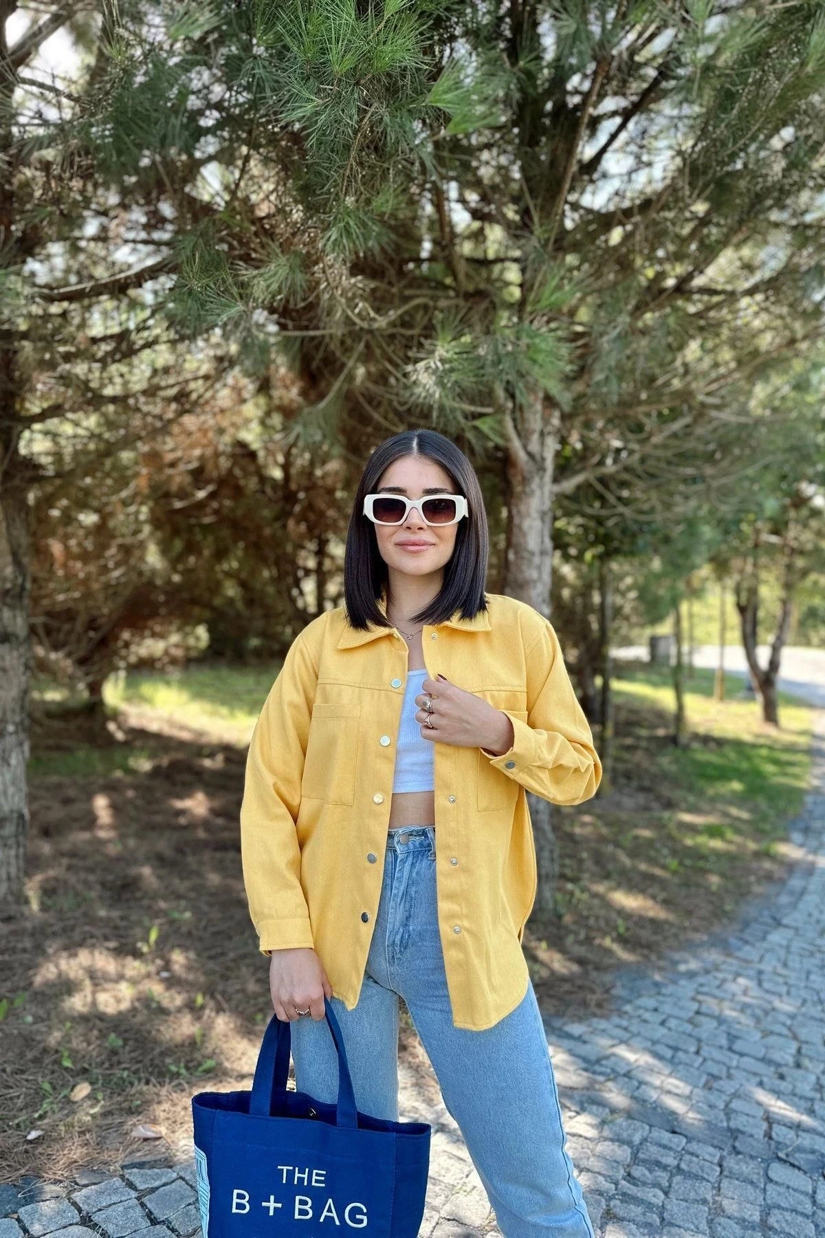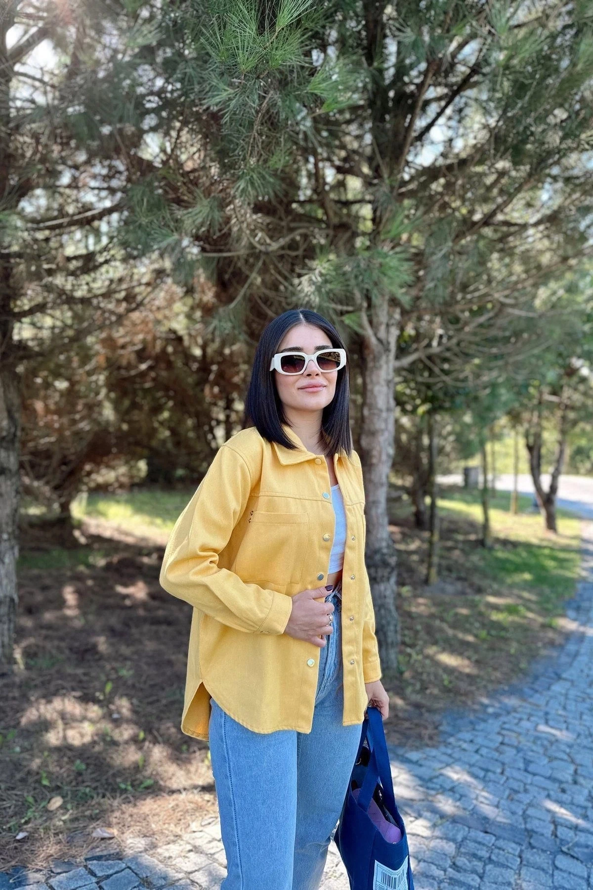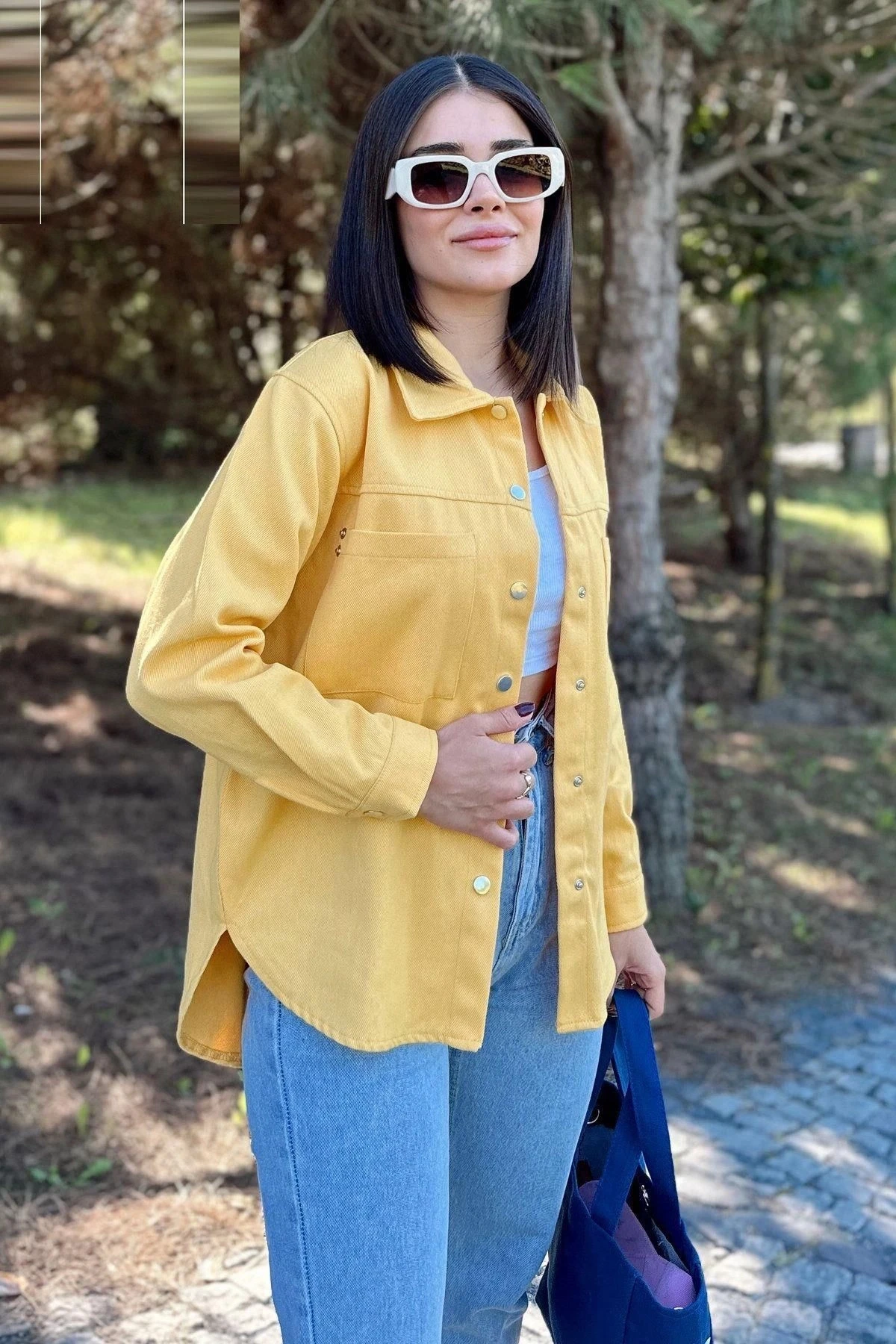 Kadın Sarı Uzun Kol, Çift Cep, Arkası Pliseli, Eteği Oval Kesim, Yırtmaçlı, Gabardin Gömlek Ceket