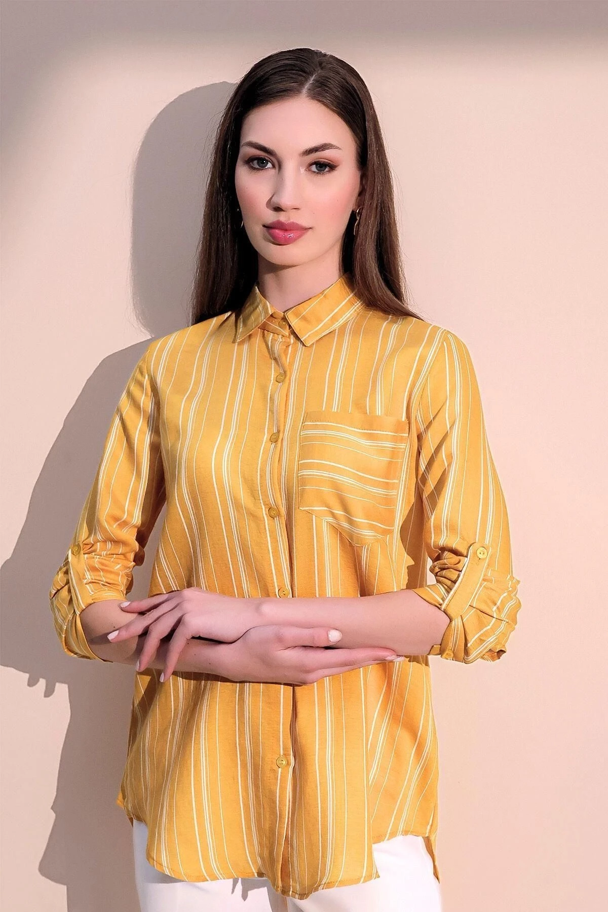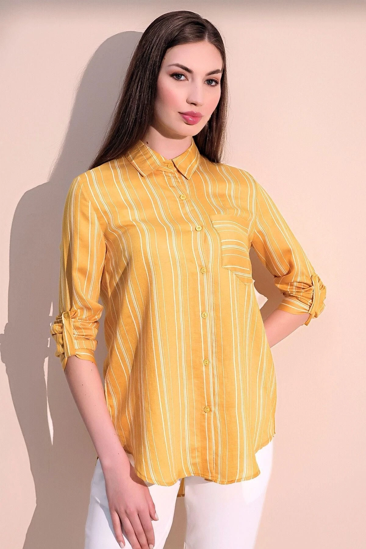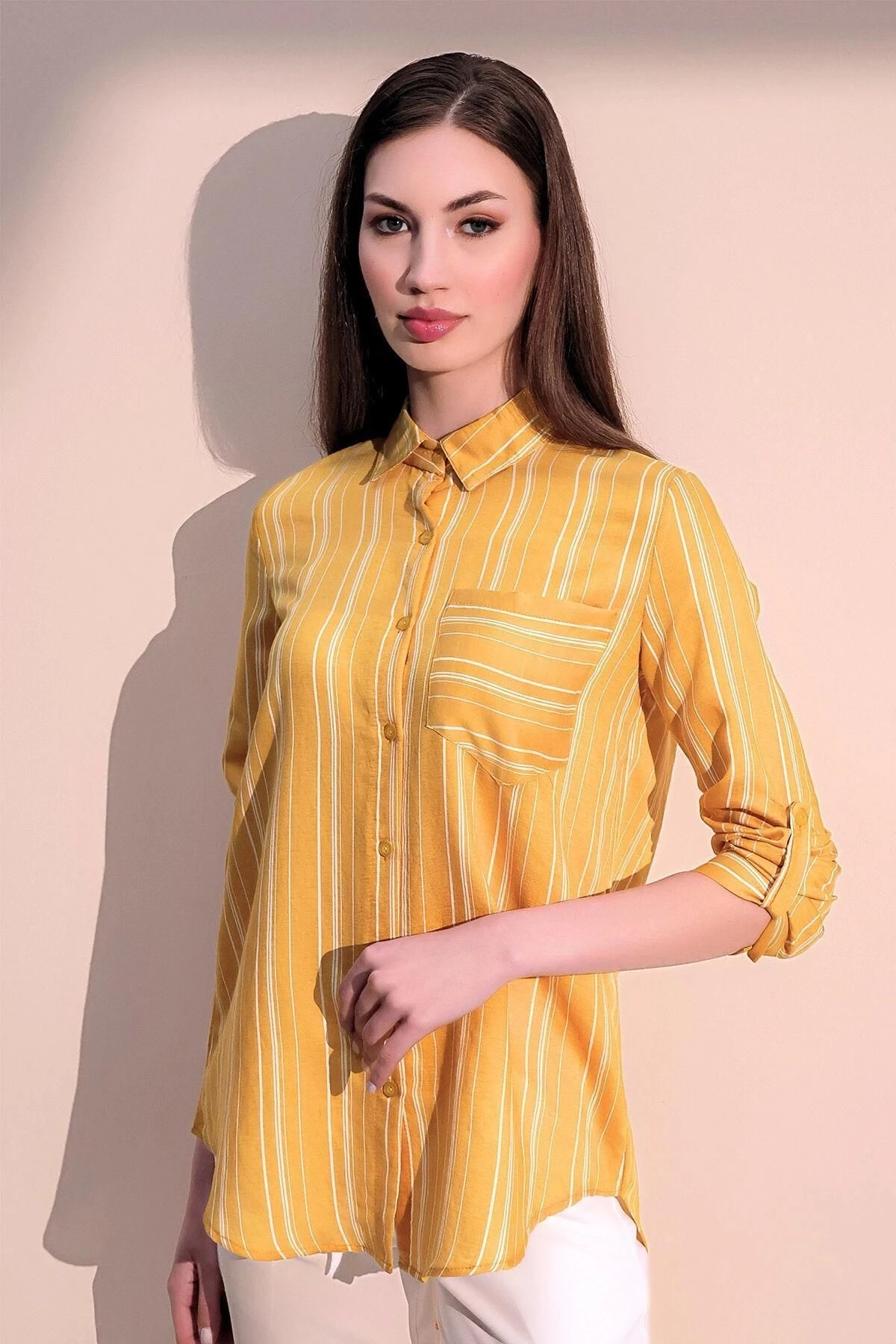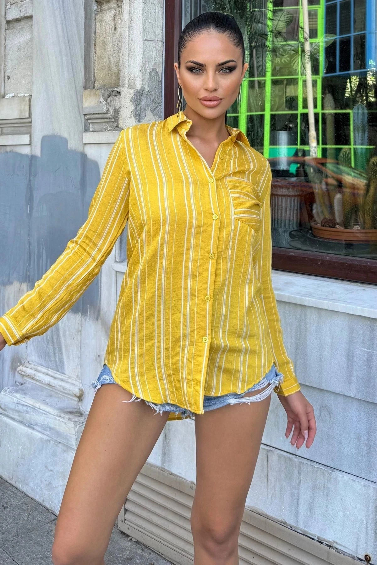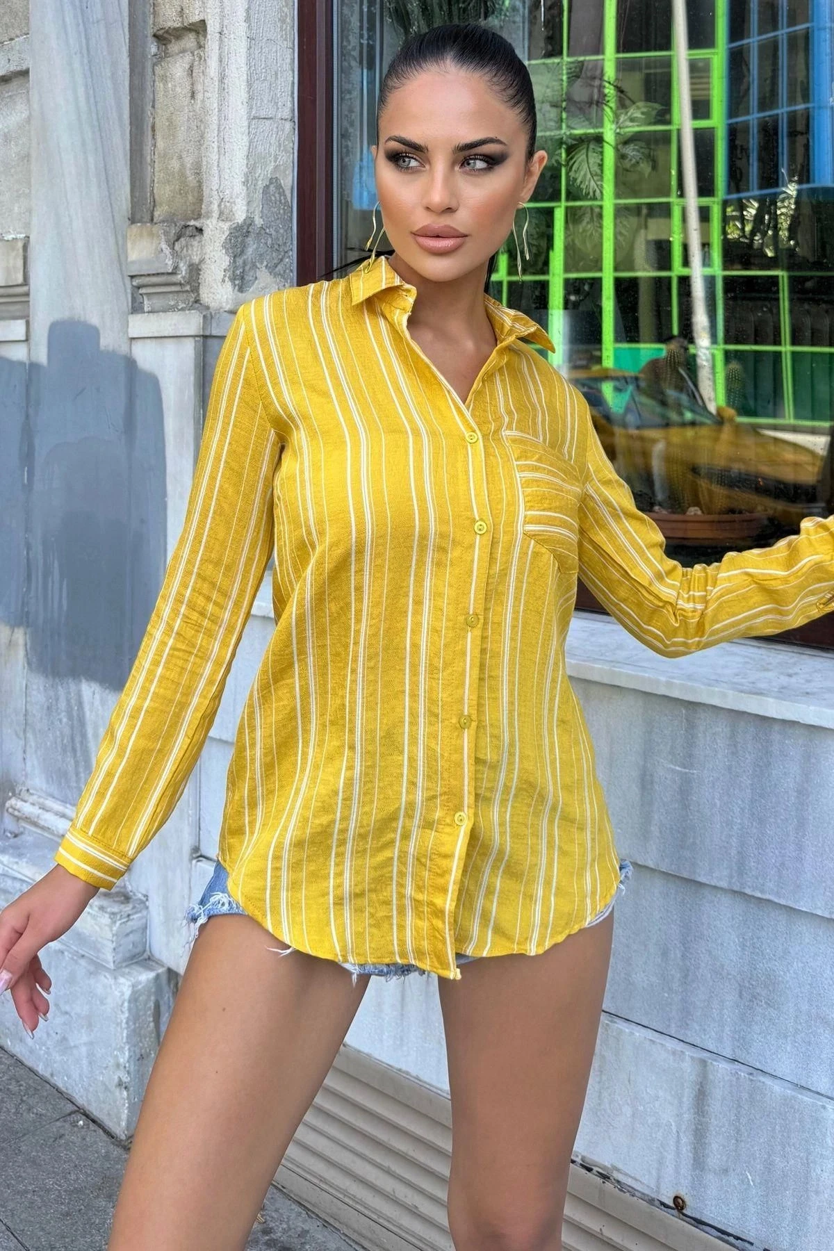 Bu özel kumaşlı sarı renkli uzun kollu gömlek, şıklığın ve rahatlığın mükemmel bir kombinasyonunu sunuyor.; Gömleğin kumaşı, %60 polyester ve %40 pamuk içeriğiyle, dayanıklılığı ve nefes alabilirliği bir araya getiriyor.; Bu gömleğin dik çizgili tasarımı, modern ve şık bir görünüm yaratırken, arkası uzun kesimi ise özgün bir tarz sunuyor.; Gömleğin tek cep detayı, kullanışlı bir özelliğe sahip olmasının yanı sıra, tasarıma zarif bir dokunuş katıyor.; Sarı renk, enerji dolu ve canlı bir ifadeyle, herhangi bir kombini canlandırırken, aynı zamanda neşeli bir görünüm sunuyor.; Bu gömlek, gardırobunuzdaki diğer parçalarla mükemmel şekilde uyum sağlayacak ve her mevsimde giymek için ideal bir seçenek olacaktır.; Temel kesim, her vücut şekline uyum sağlayan bir stile sahiptir.; Bu, her yaş ve beden tipindeki kullanıcılara mükemmel bir uyum ve konfor sağlar.; Hem gündelik giyimde hem de özel durumlarda kullanabileceğiniz çok yönlü bir seçenektir.; Bu gömleği giydiğinizde, hem tarzınızı yansıtacak hem de rahat bir his yaşayacaksınız.; Kaliteli kumaş yapısı ve özenli tasarım detayları ile uzun süre kullanabileceğiniz bir üründür.