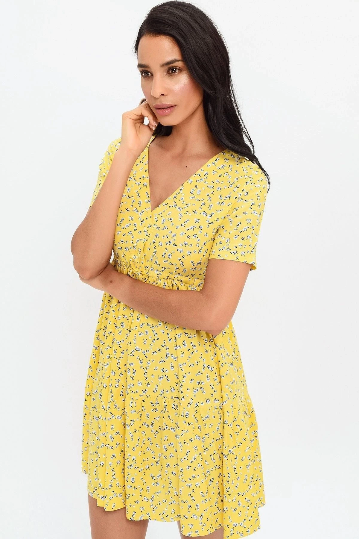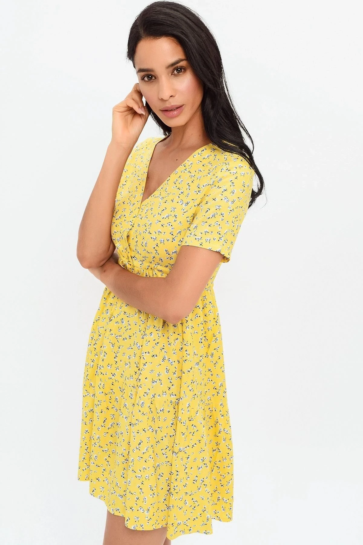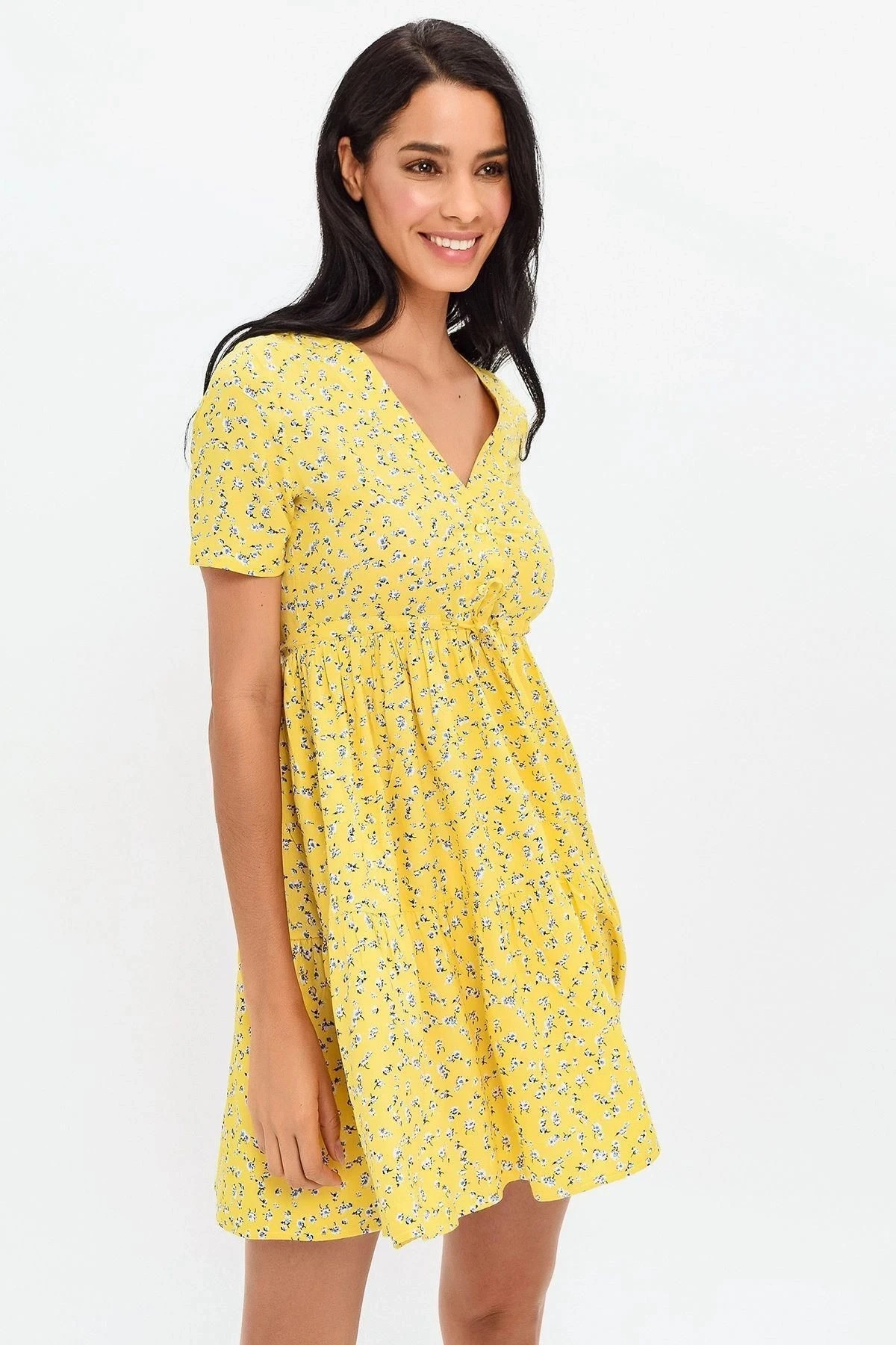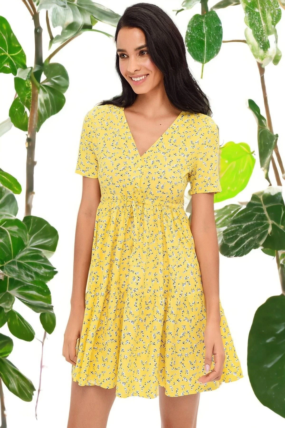 Kadın Sarı V Yaka Belden Bağcıklı Volanlı A Kesim Elbise Yarım Kol Desenli Mini Kısa Günlük Elbise