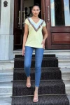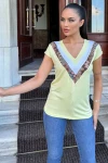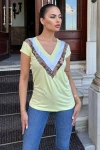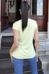 Kadın Sarı V Yaka, Kısa Kol, Color Block Detaylı, Terletmez Dokulu Kumaş, Salaş Bluz, Tshirt