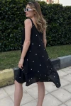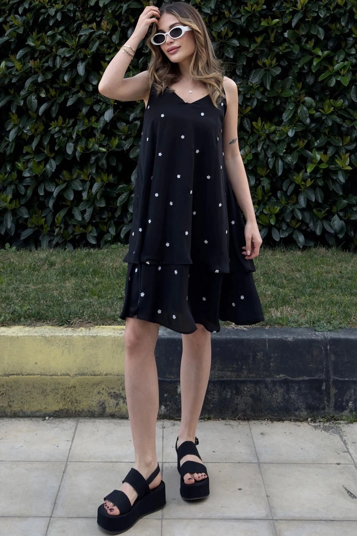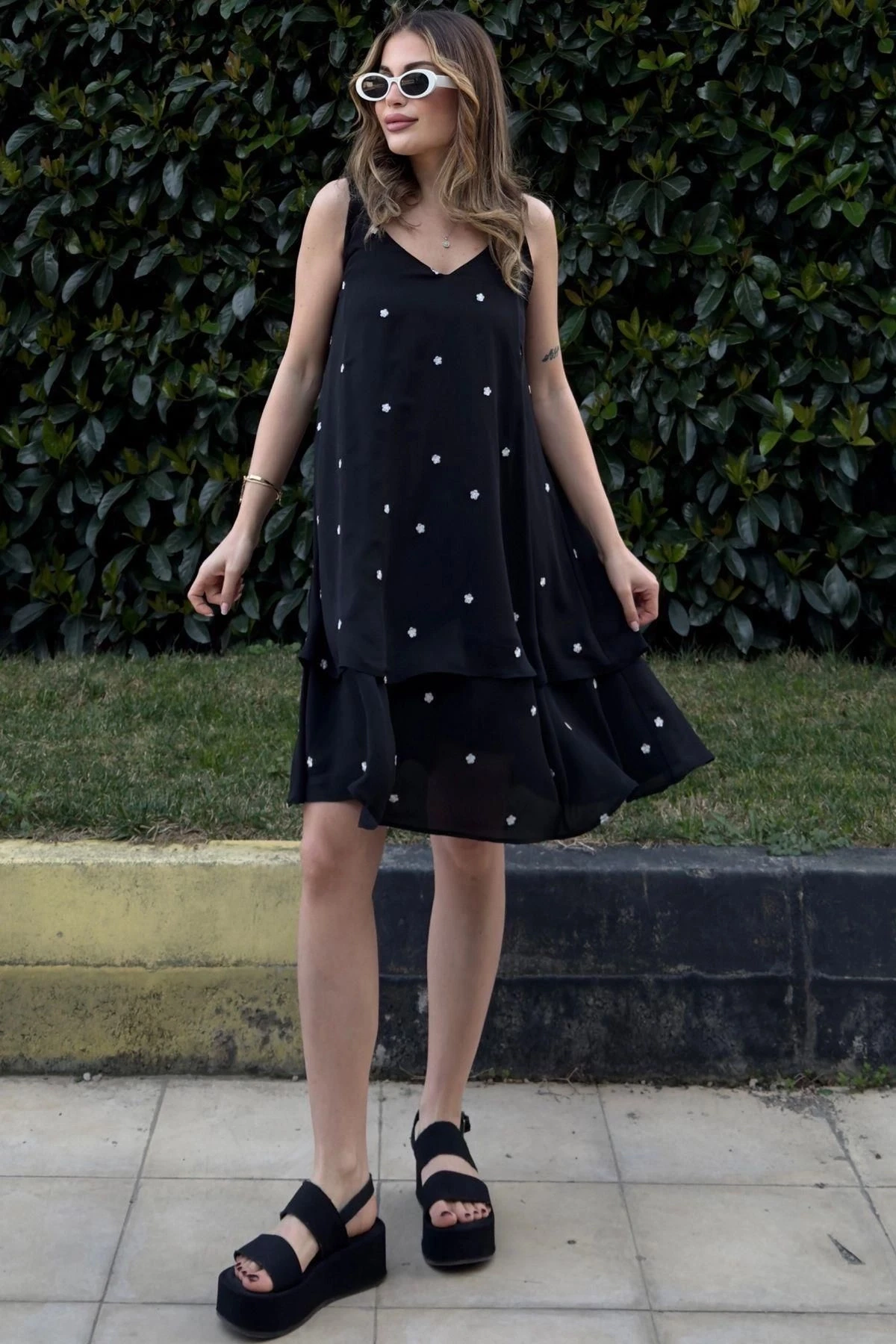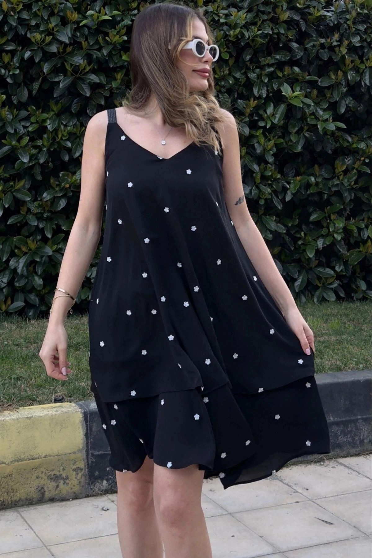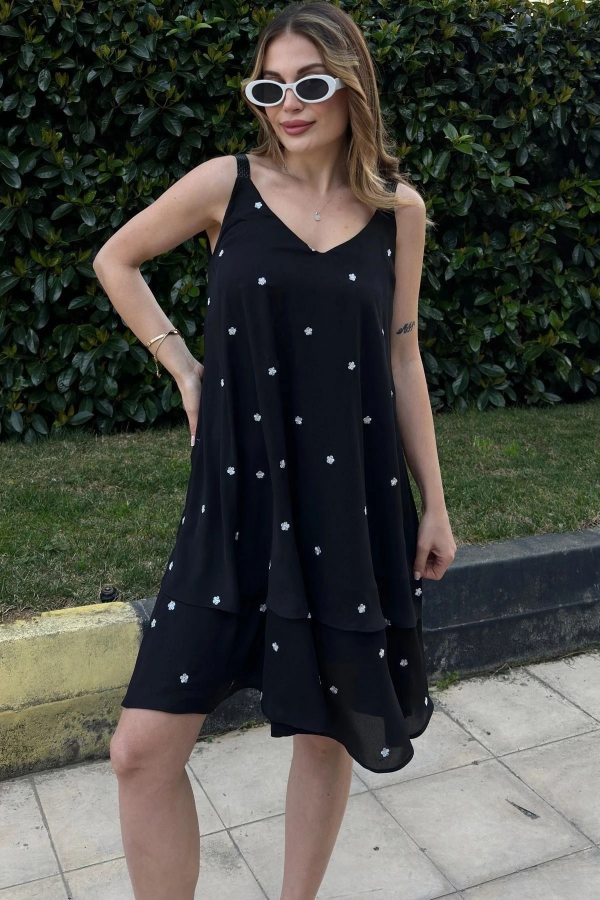 Kadın Siyah A Kesim, Deri Askı Ve Çiçek Nakış Detaylı, Şifon Kumaş, Midi Kiloş Elbise
