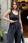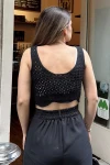 Kadın Siyah Ajurlu Merserize Triko Örme, Terletmez, Askılı Crop Bluz