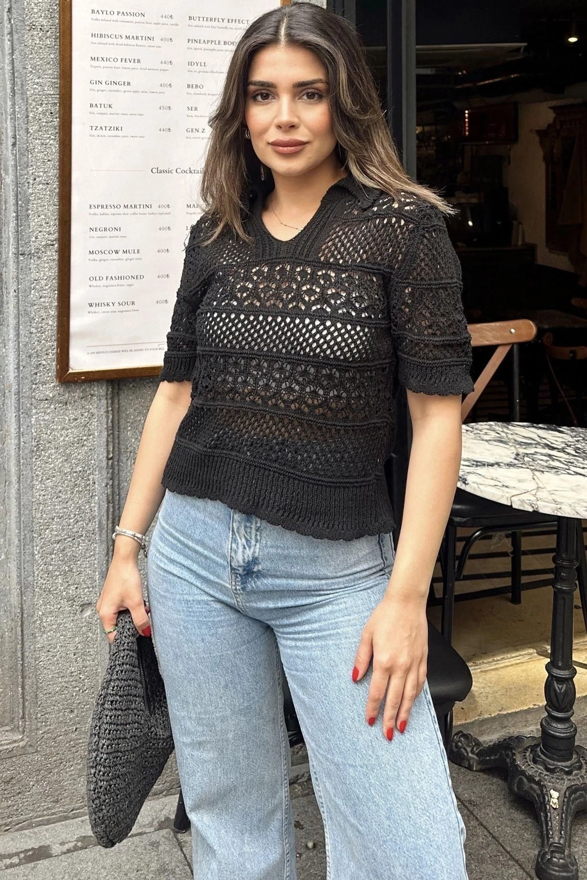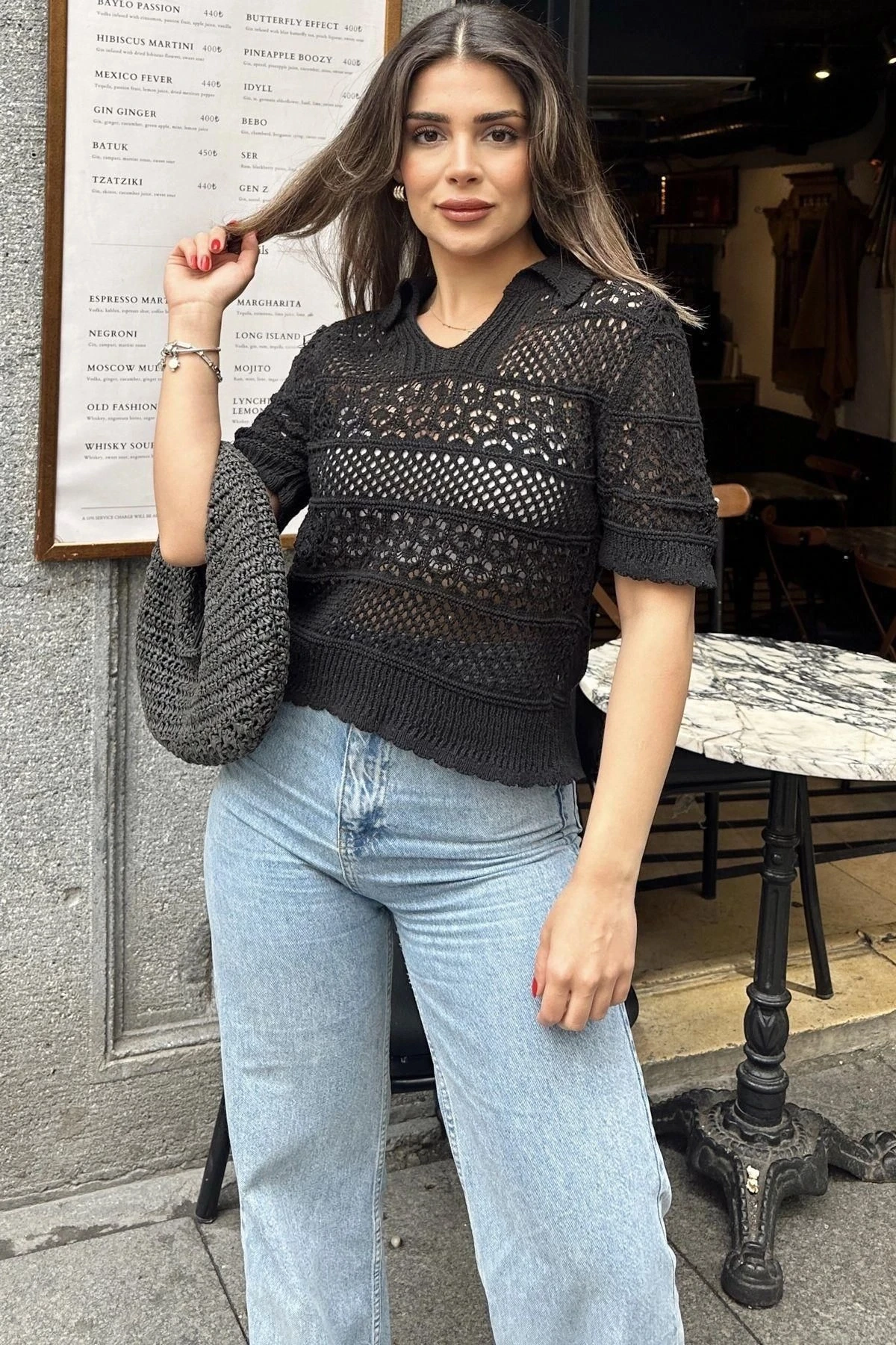 Kadın Siyah Ajurlu Merserize Triko Örme, Terletmez, Salaş Kalıp, Polo Yaka Bluz