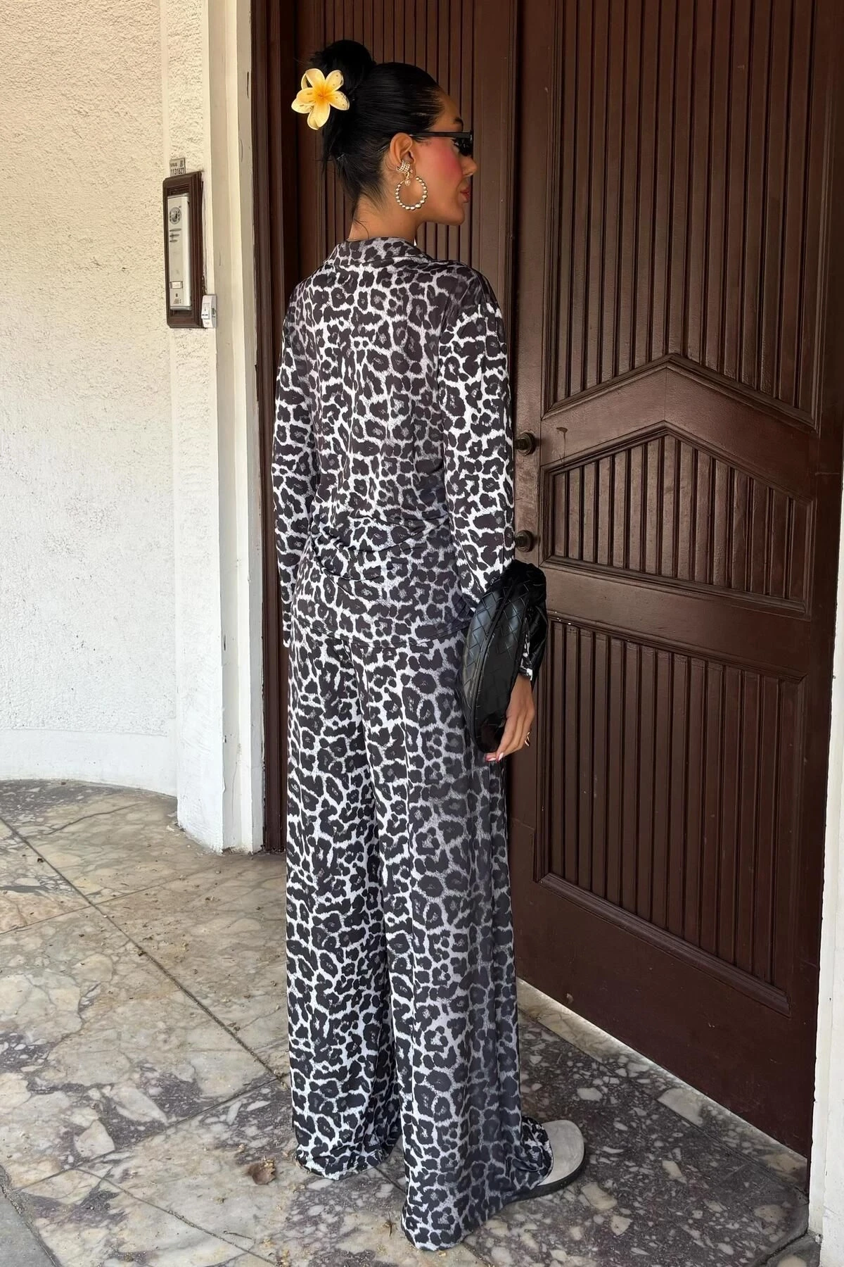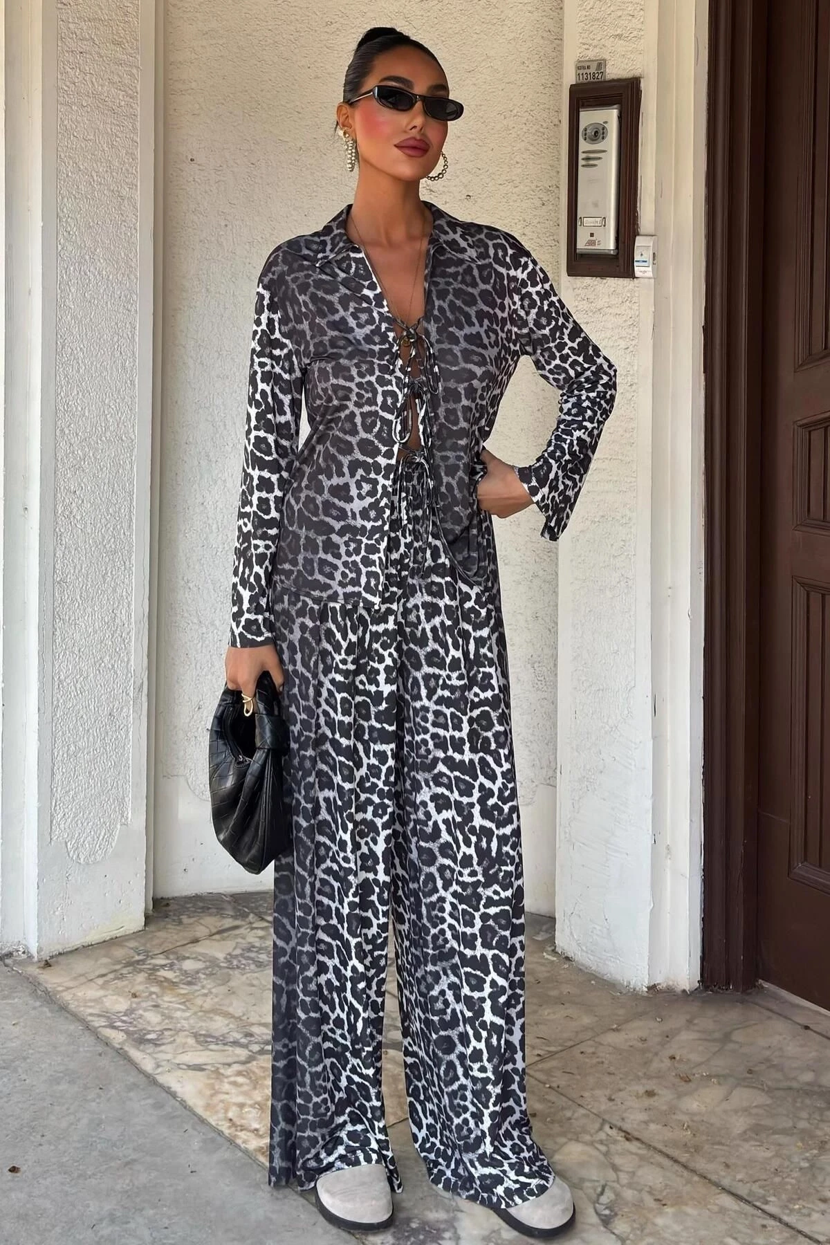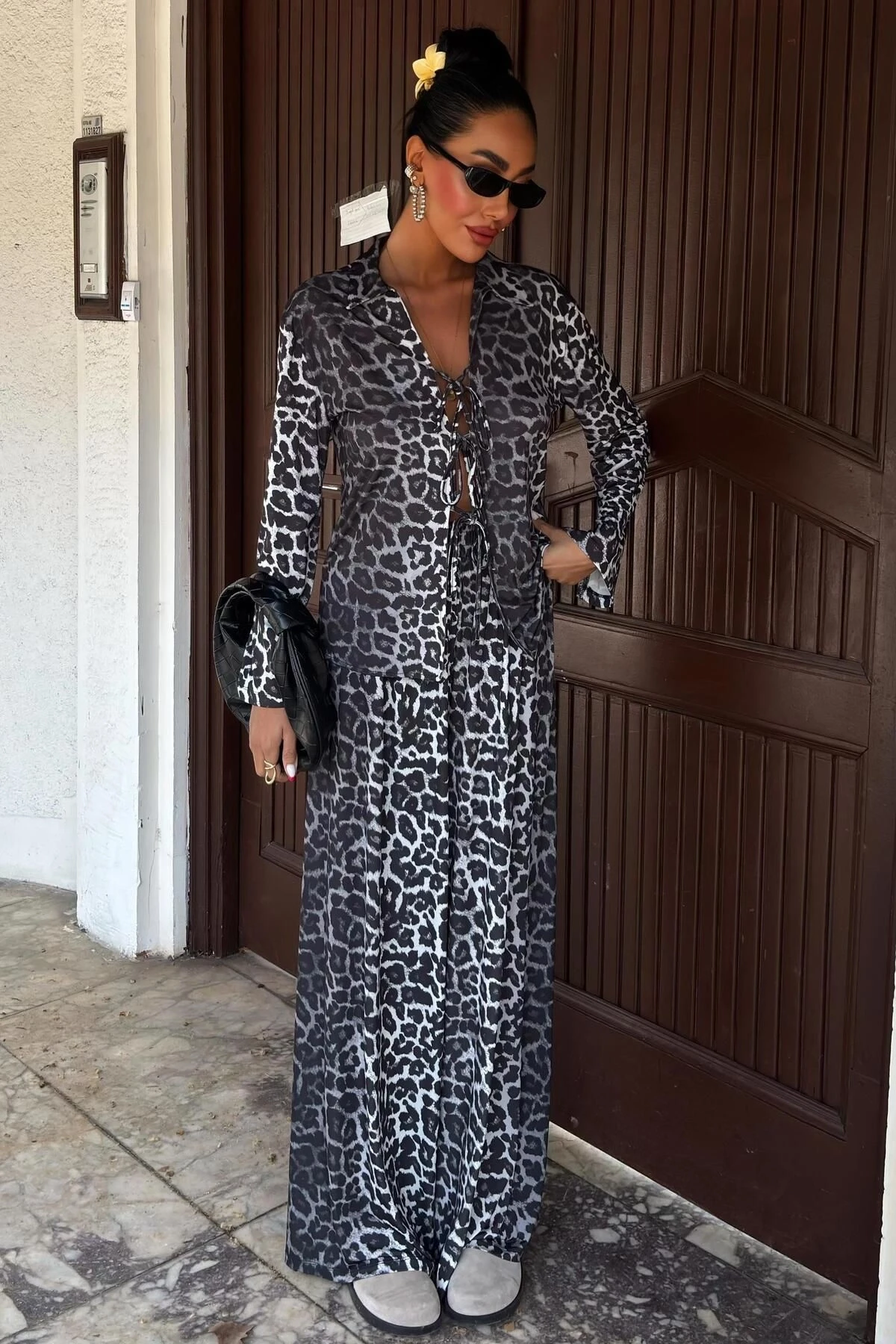 Kadın Siyah Animal Desenli Uzun Dokuma Polo Yaka Takım
