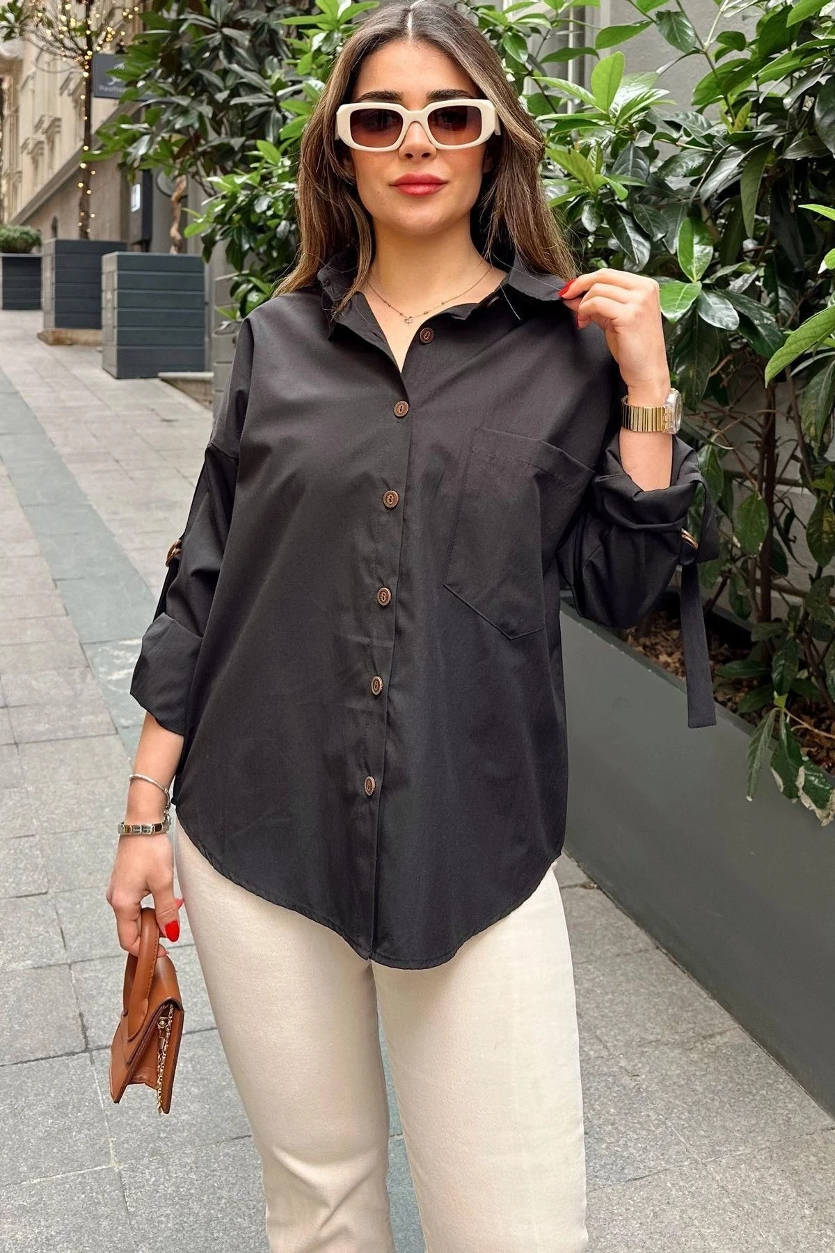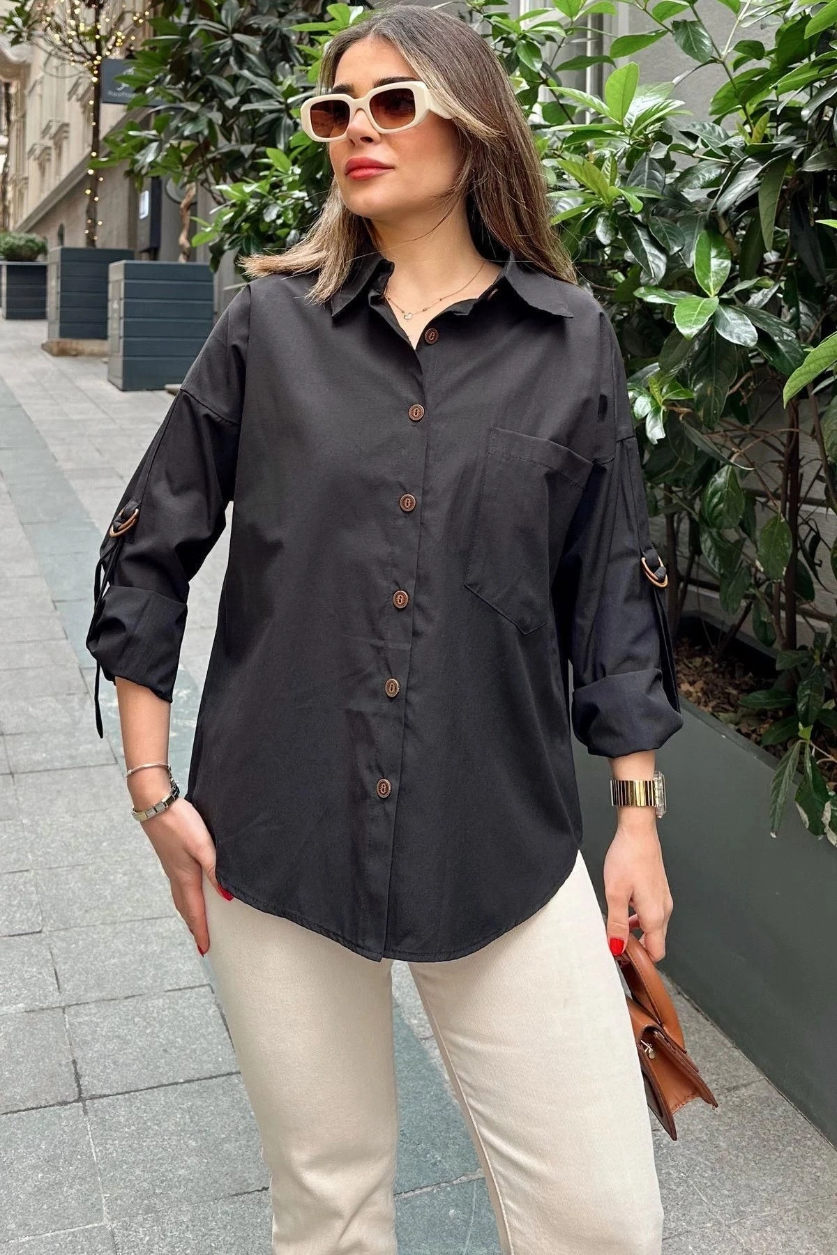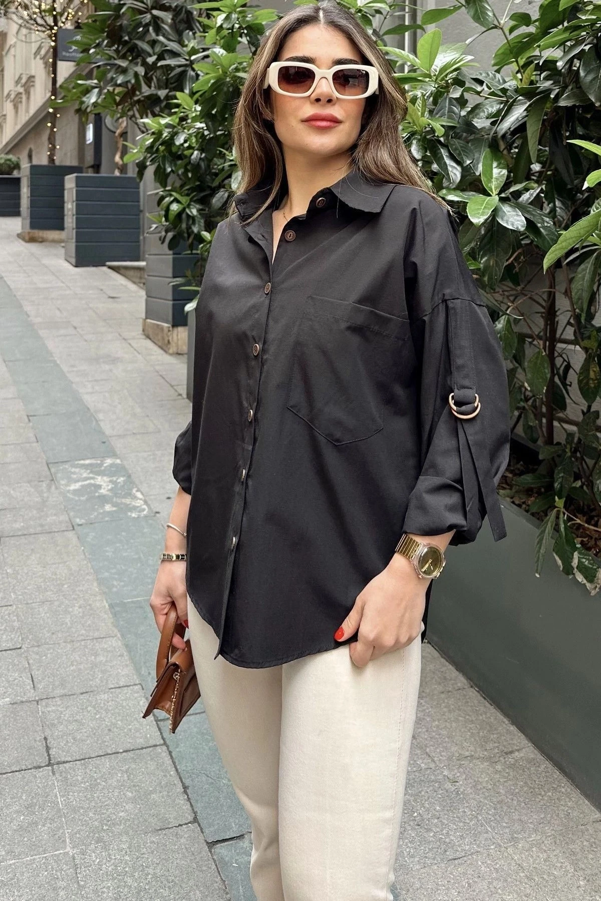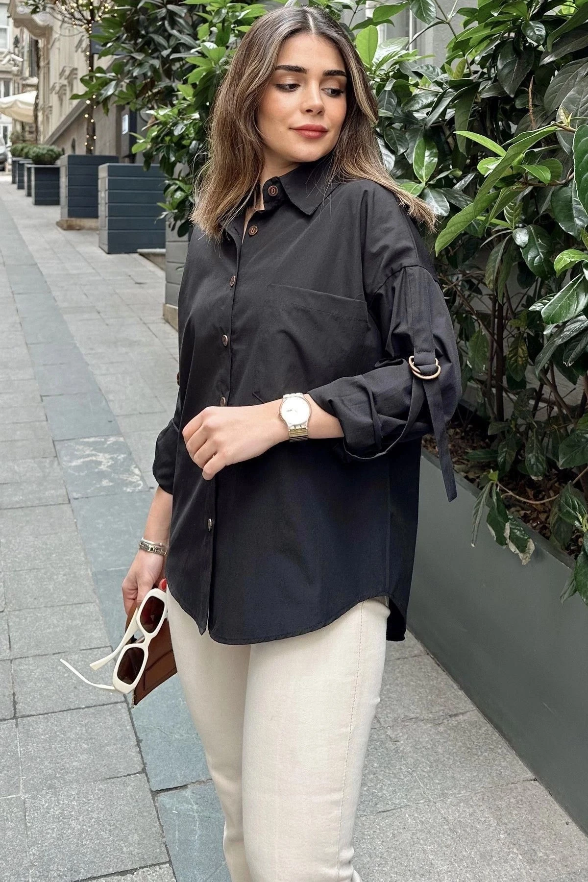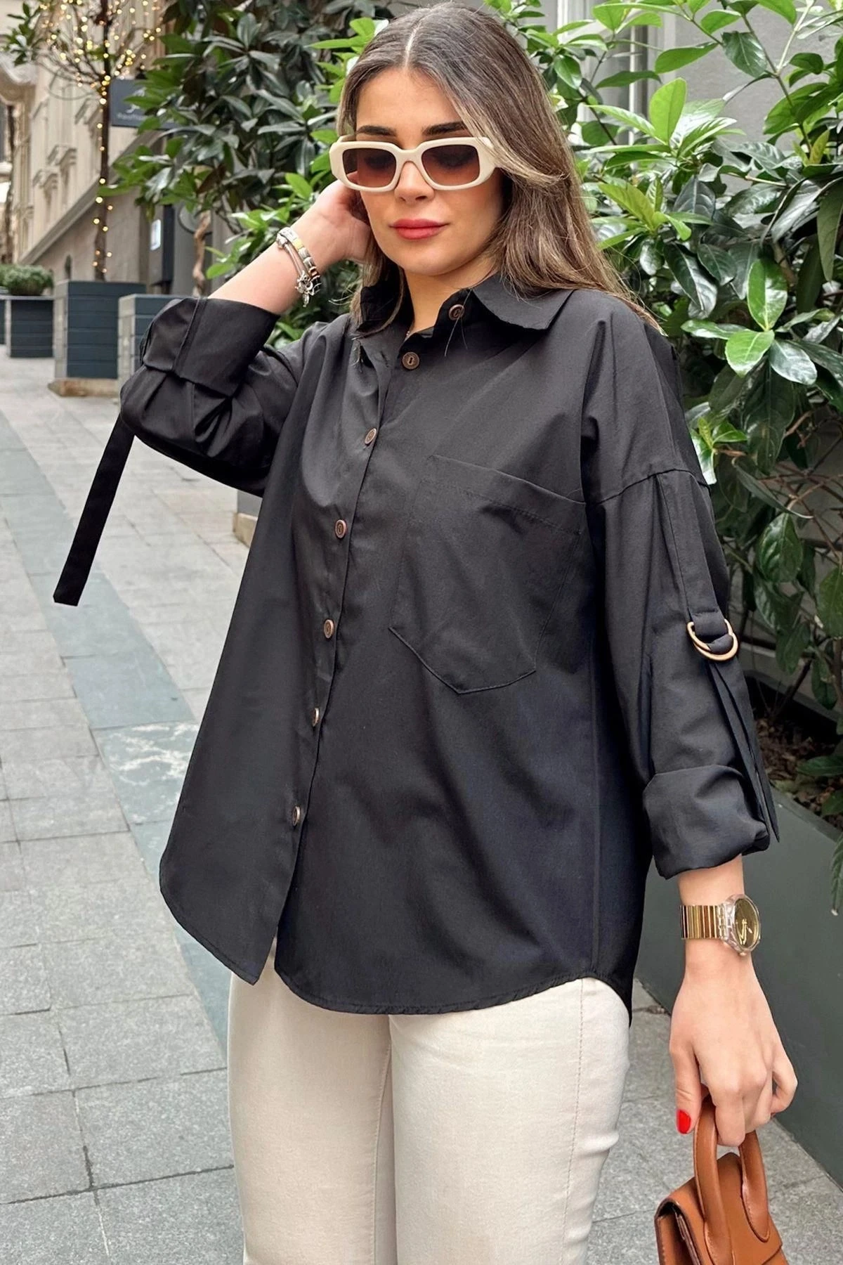Kadın Siyah Apoletli, Kolları Tokalı, Geniş Cepli, Eteği Oval, Salaş Gömlek