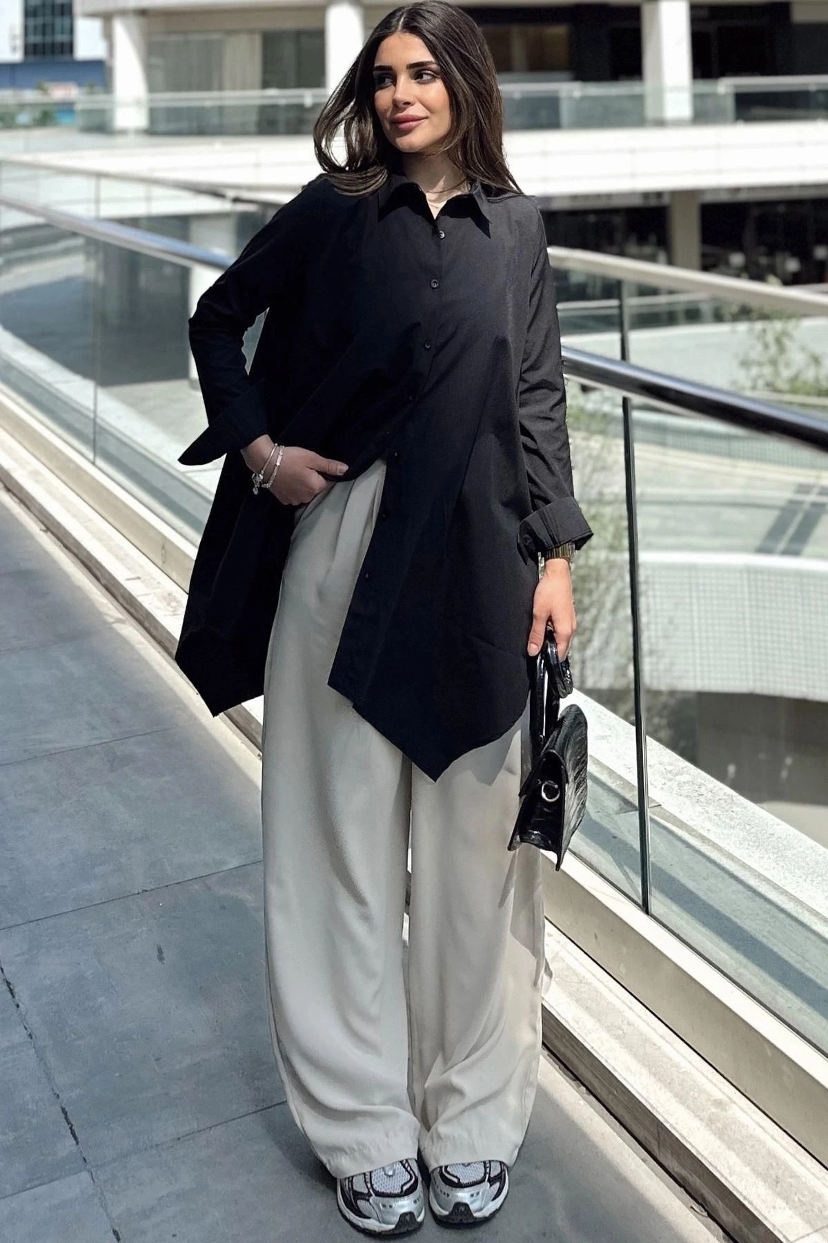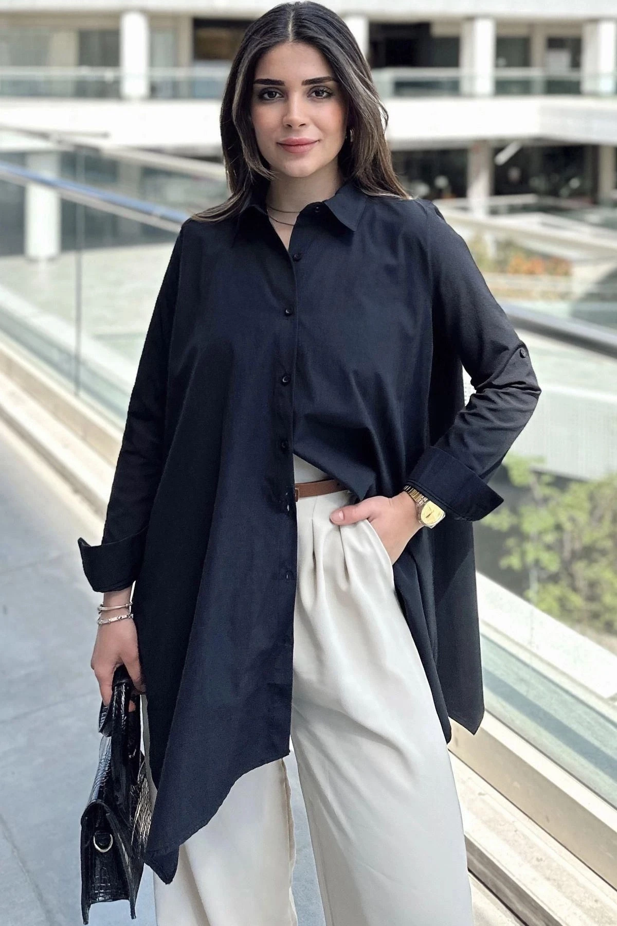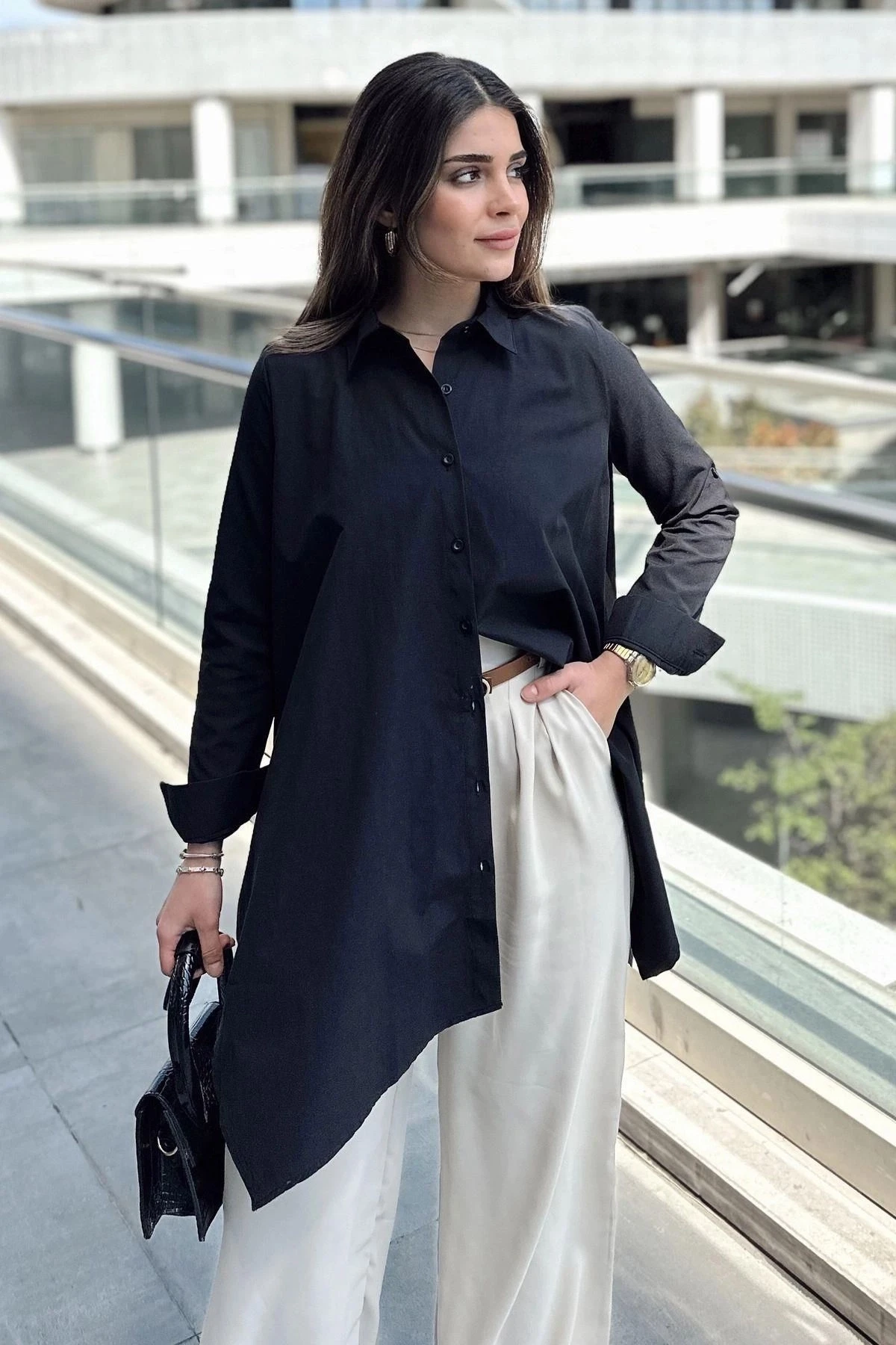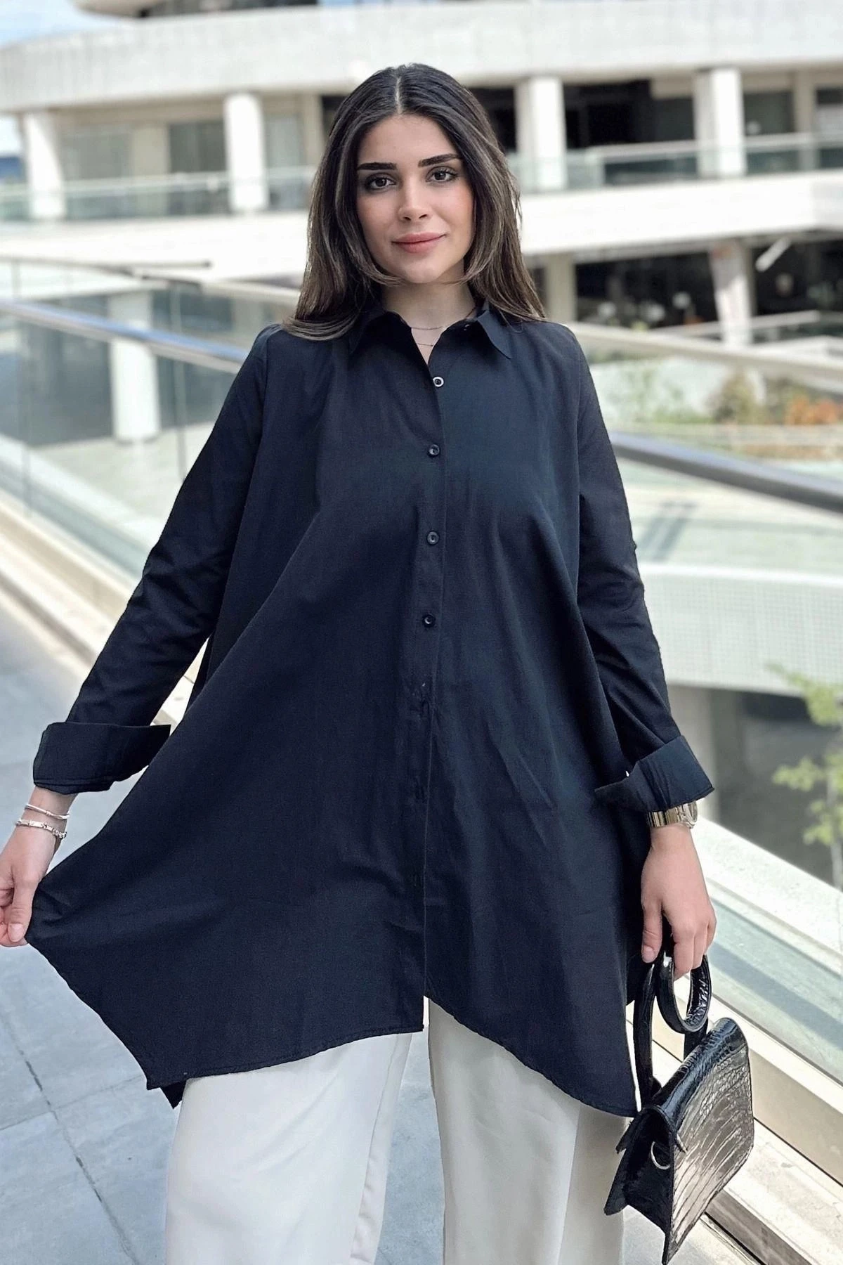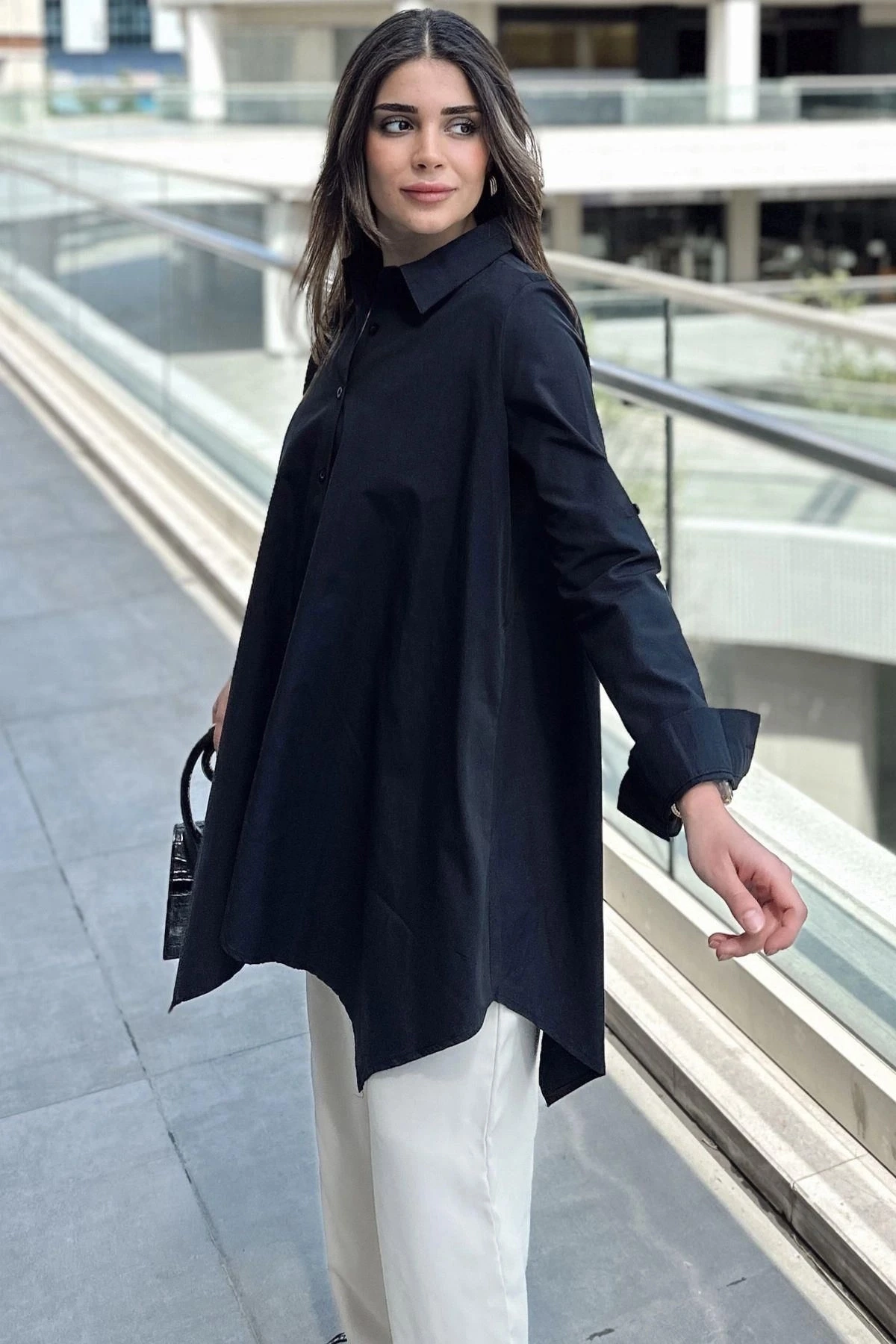 Kadın Siyah Asimetrik Kesim, Uzun Kollu, Pamuklu Salaş Tunik Gömlek