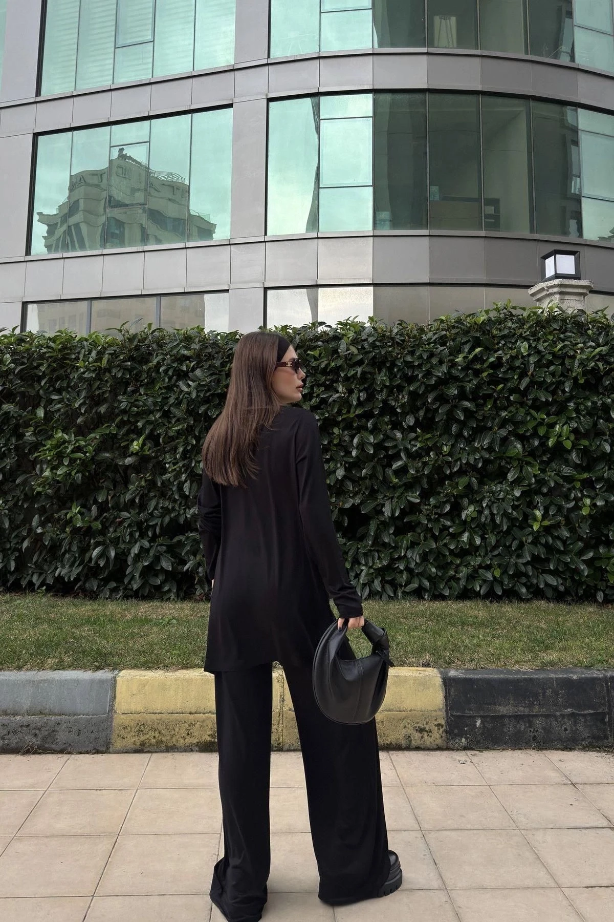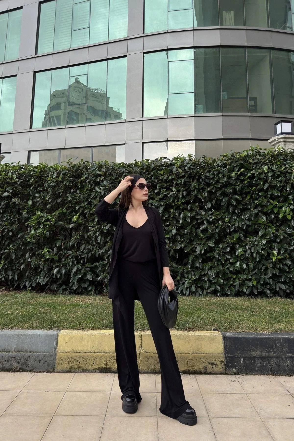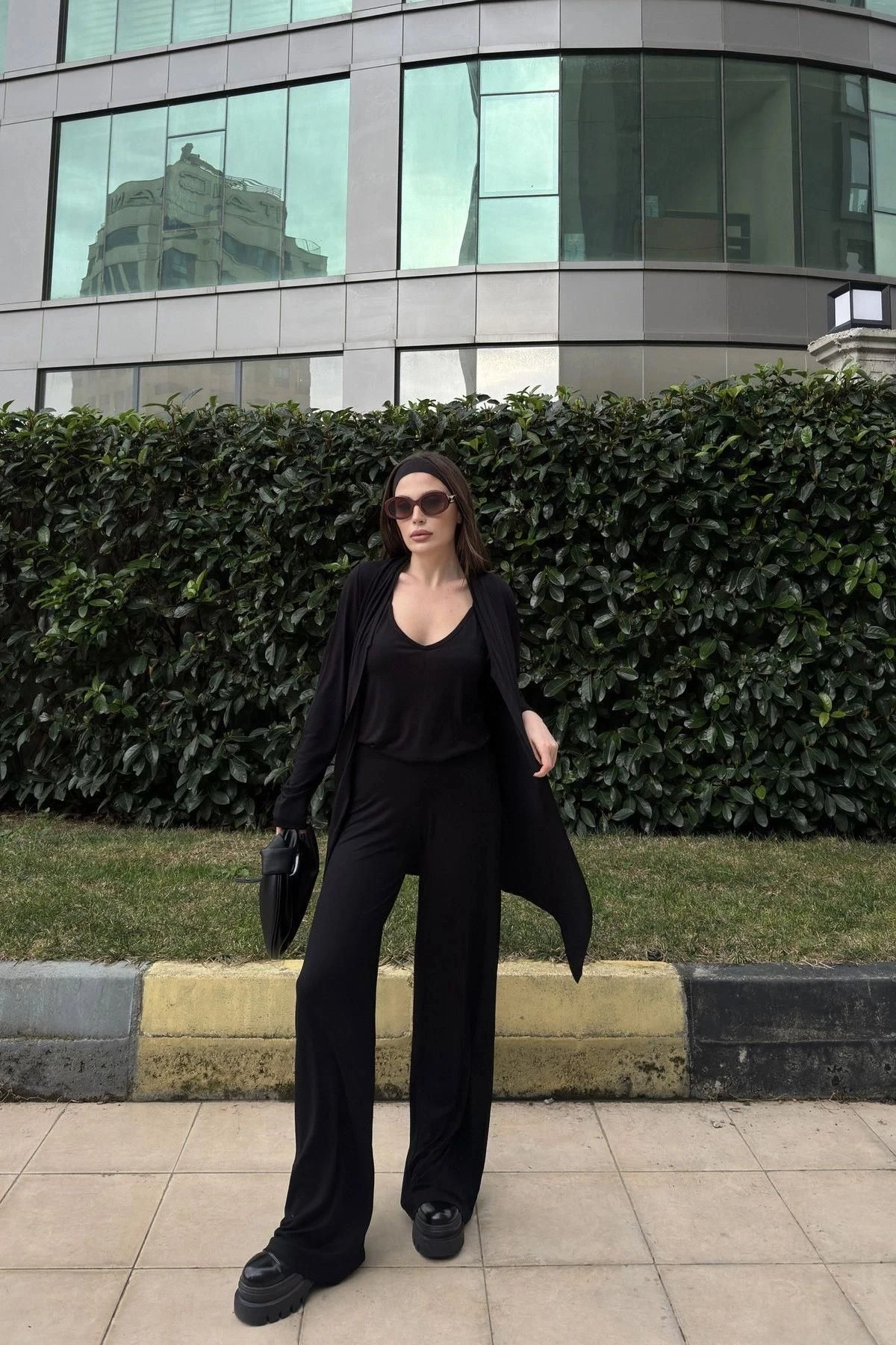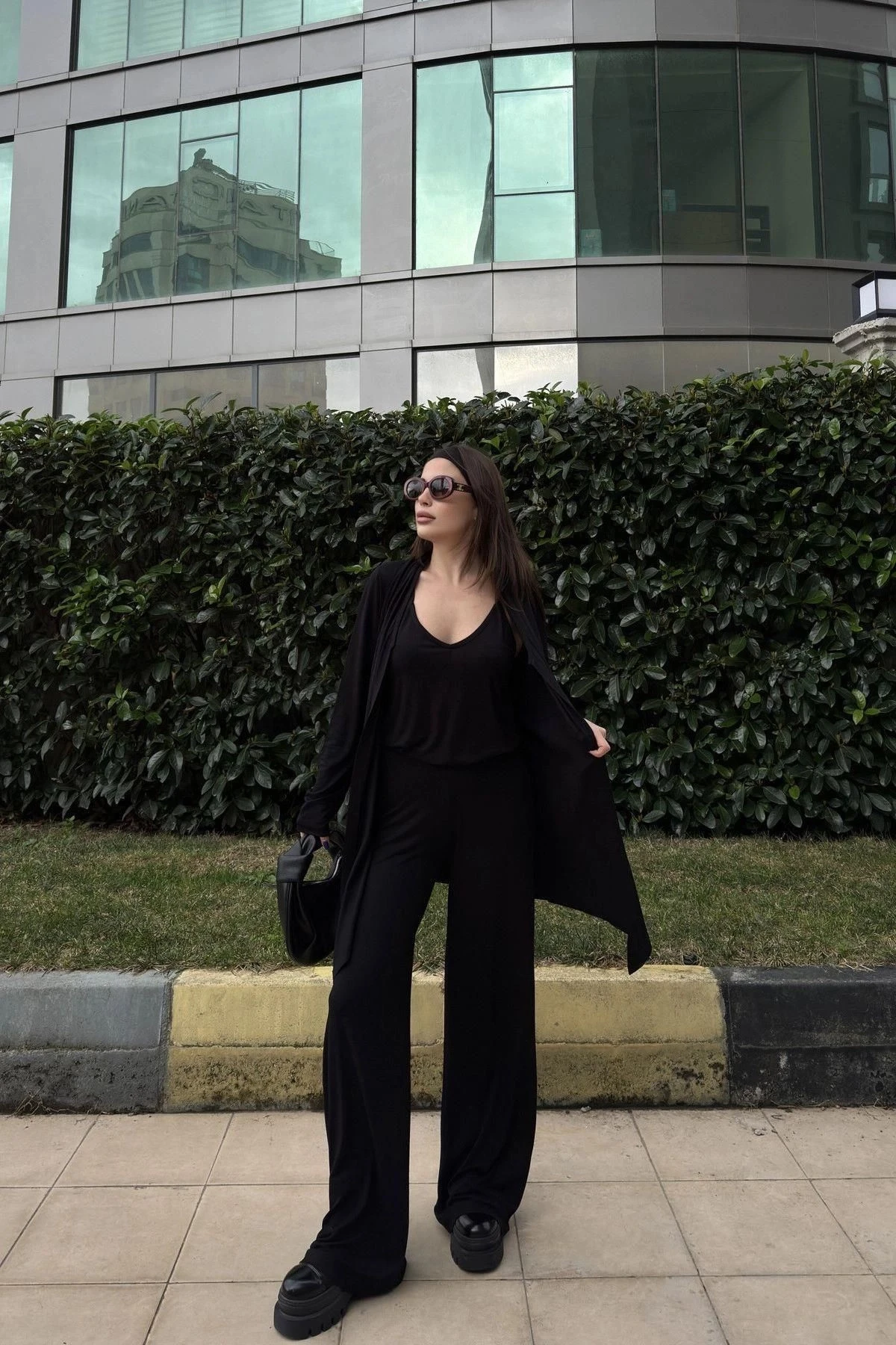 Kadın Siyah Askılı Bluz, Düğmesiz Uzun Hırka & Bol Paça Pantolon - Salaş Takım