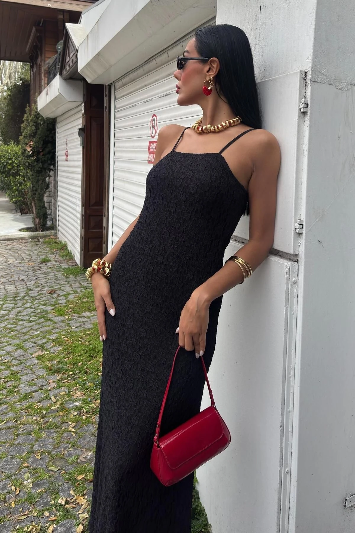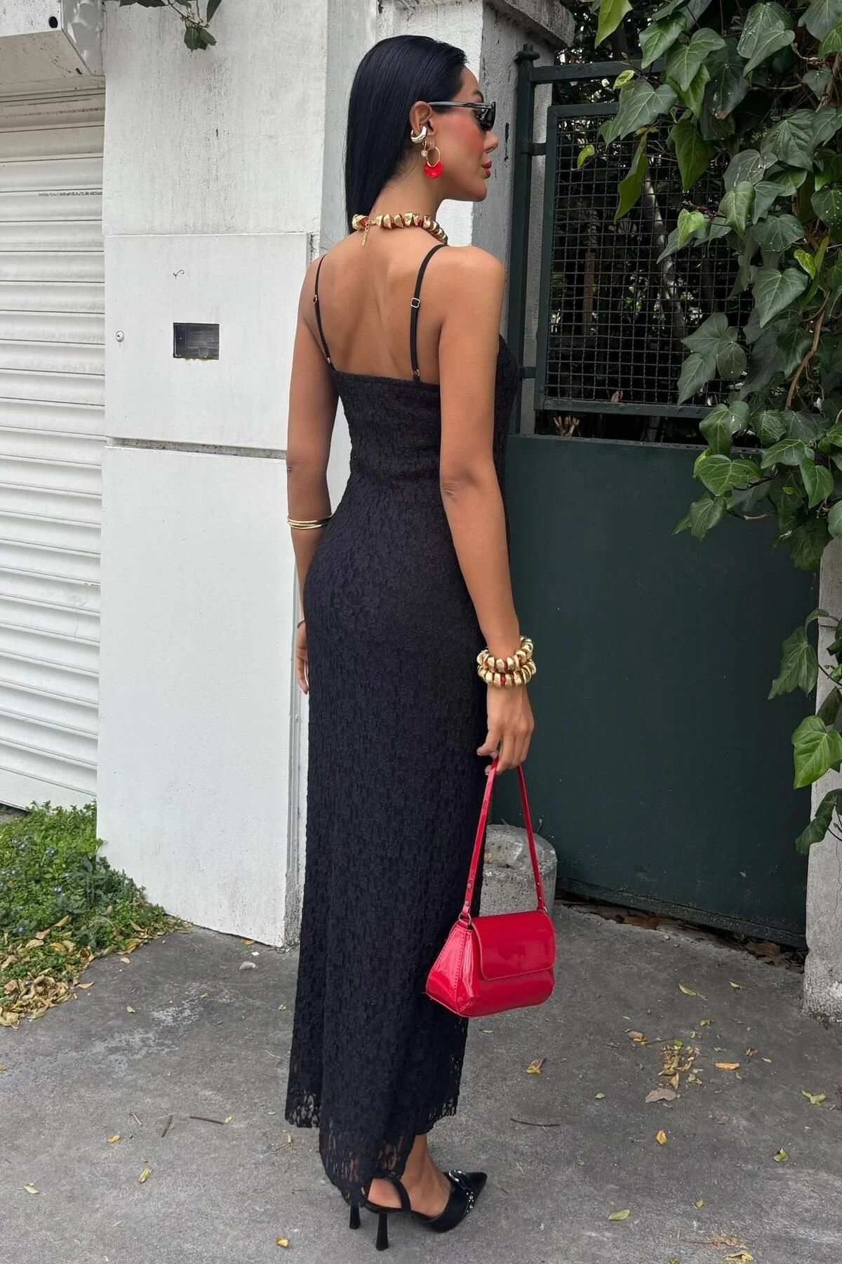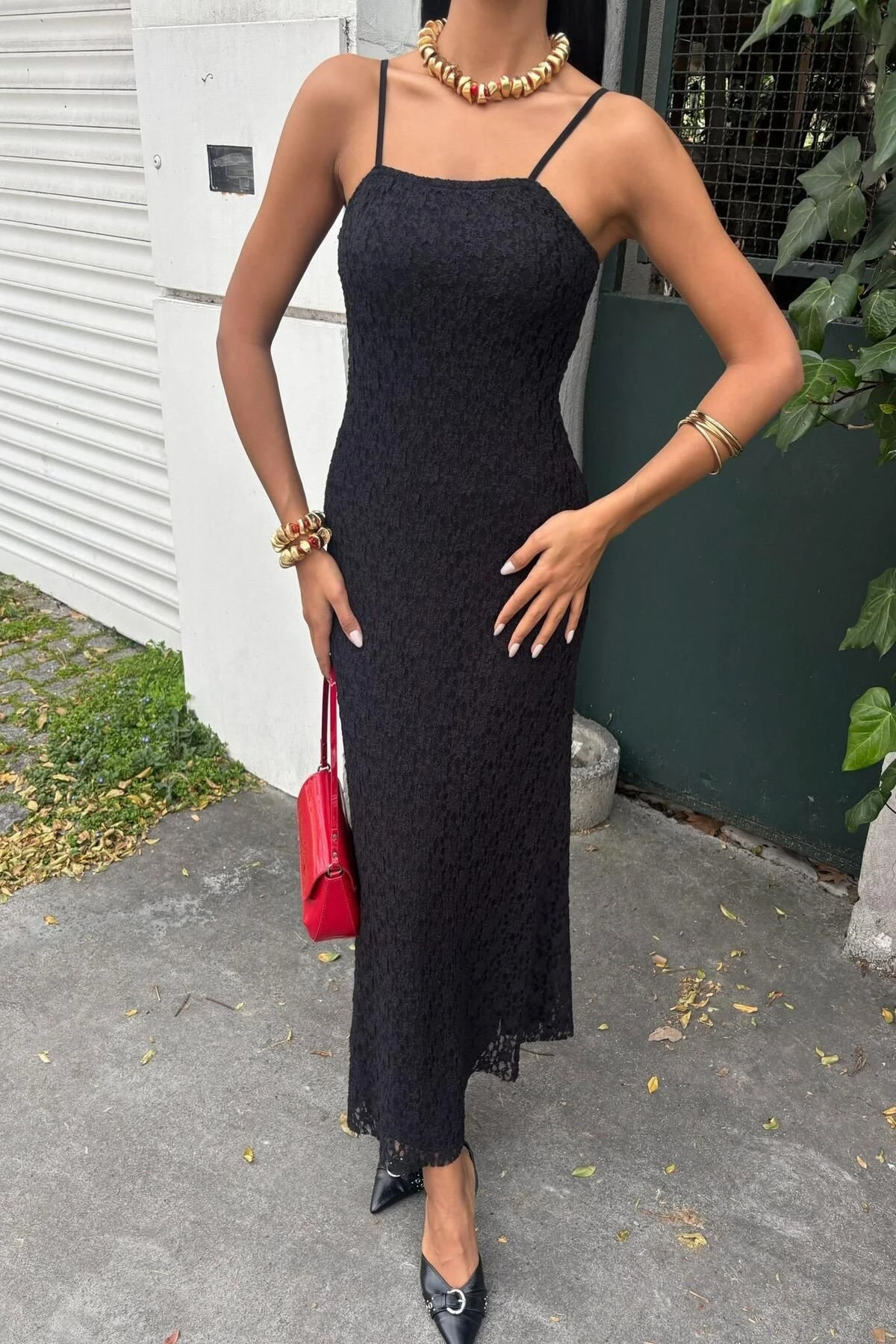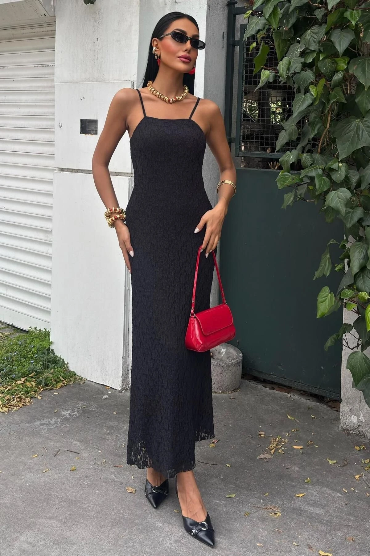 Kadın Siyah Askılı Dantel Maxi Elbise