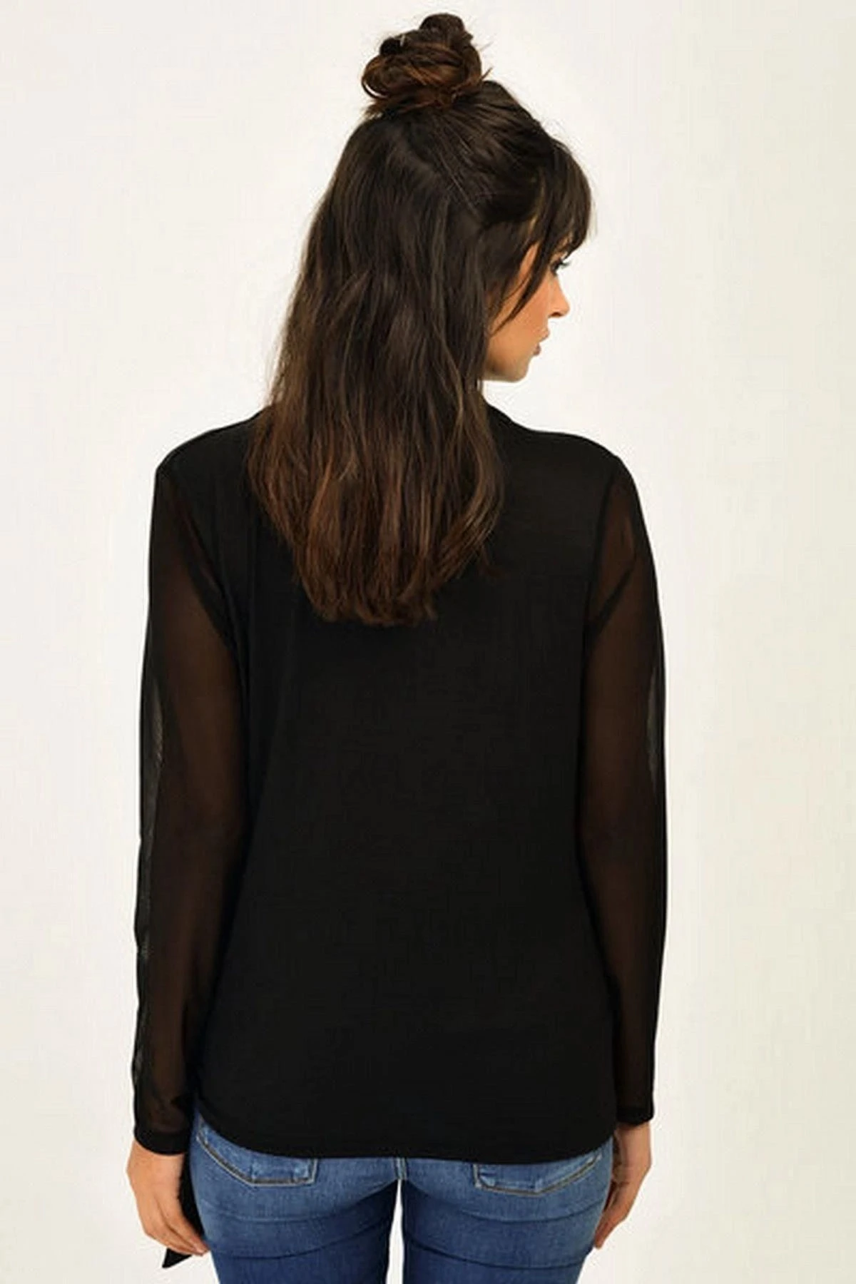 Bu Siyah Renk Bağlama Detaylı Kruvaze Yaka Uzun Kol Bluz, şıklığı ve zarafeti bir araya getiren özel bir tasarıma sahiptir.; Kumaş içeriği %95 Polyester ve %5 Elastan'dan oluşur, bu da bluzun hem dayanıklı hem de esnek bir yapıya sahip olduğu anlamına gelir.; Bu bluzun rengi siyahtır, klasik ve zamansız bir seçenektir.; Siyah, her türlü stil ve kombinle uyum sağlar, böylece gardırobunuzdaki diğer parçalarla kolayca eşleştirebilirsiniz.; Bu bluz, sizin için herhangi bir renkte veya desende uygun olabilecek birçok seçeneği sunar.; Kruvaze yaka detayı, bluza sofistike bir görünüm katar.; Bu detay, boyun bölgenizi vurgulayarak zarif bir siluet oluşturmanıza yardımcı olur.; Ayrıca, bu tasarım, bluzunuzun diğer standart modellere göre bir adım önde olmasını sağlar.; Uzun kollu bir kesime sahip olan bu bluz, klasik bir tarzı modern detaylarla birleştirir.; Uzun kollar, şıklık ve rahatlık arasında mükemmel bir denge sağlar.; Standart boy kesimi ise her vücut tipine uyum sağlar ve herhangi bir figürde harika görünür.; Bu bluz, herhangi bir özel etkinlikten günlük giyime kadar birçok farklı durum için mükemmel bir seçimdir.; Şık bir iş toplantısında veya arkadaşlarınızla buluştuğunuz bir akşam yemeğinde güvenle giyebilirsiniz.; Aynı zamanda rahat bir günlük stil için de idealdir.; Siyah Renk Bağlama Detaylı Kruvaze Yaka Uzun Kol Bluz, kaliteli kumaşı, şık tasarımı ve çeşitli kombin seçenekleriyle gardırobunuza yeni bir soluk getirecektir.; Bu bluzu giyerek tarzınızı yansıtabilir ve herhangi bir ortamda göz kamaştırabilirsiniz.