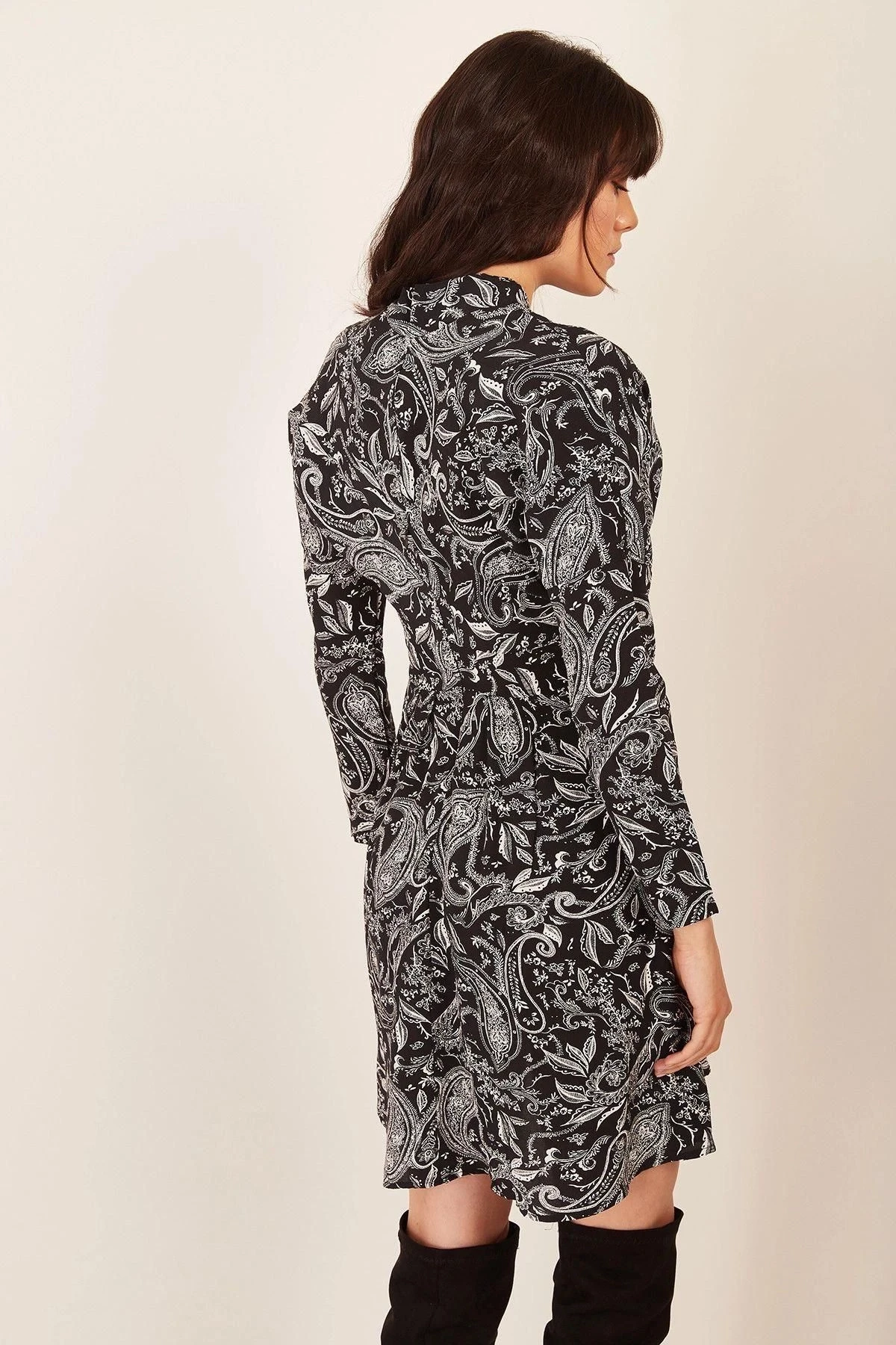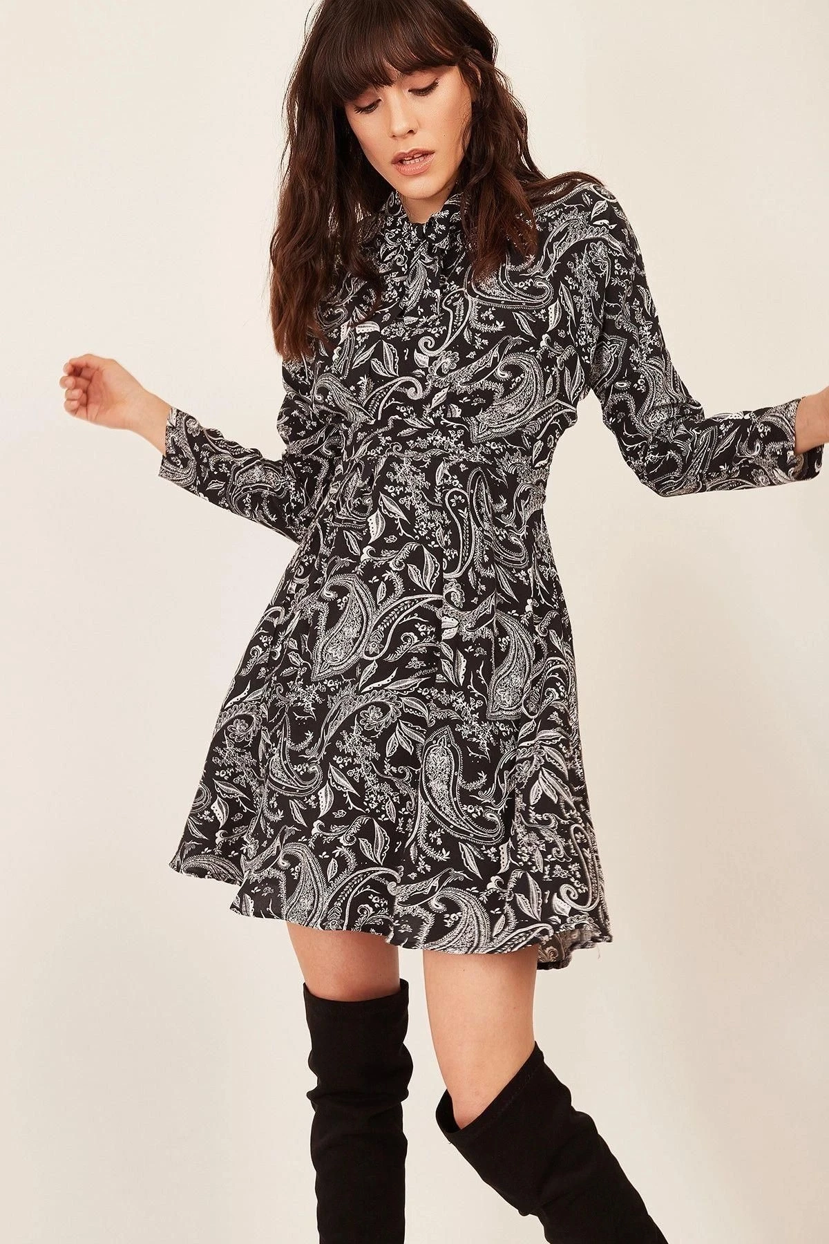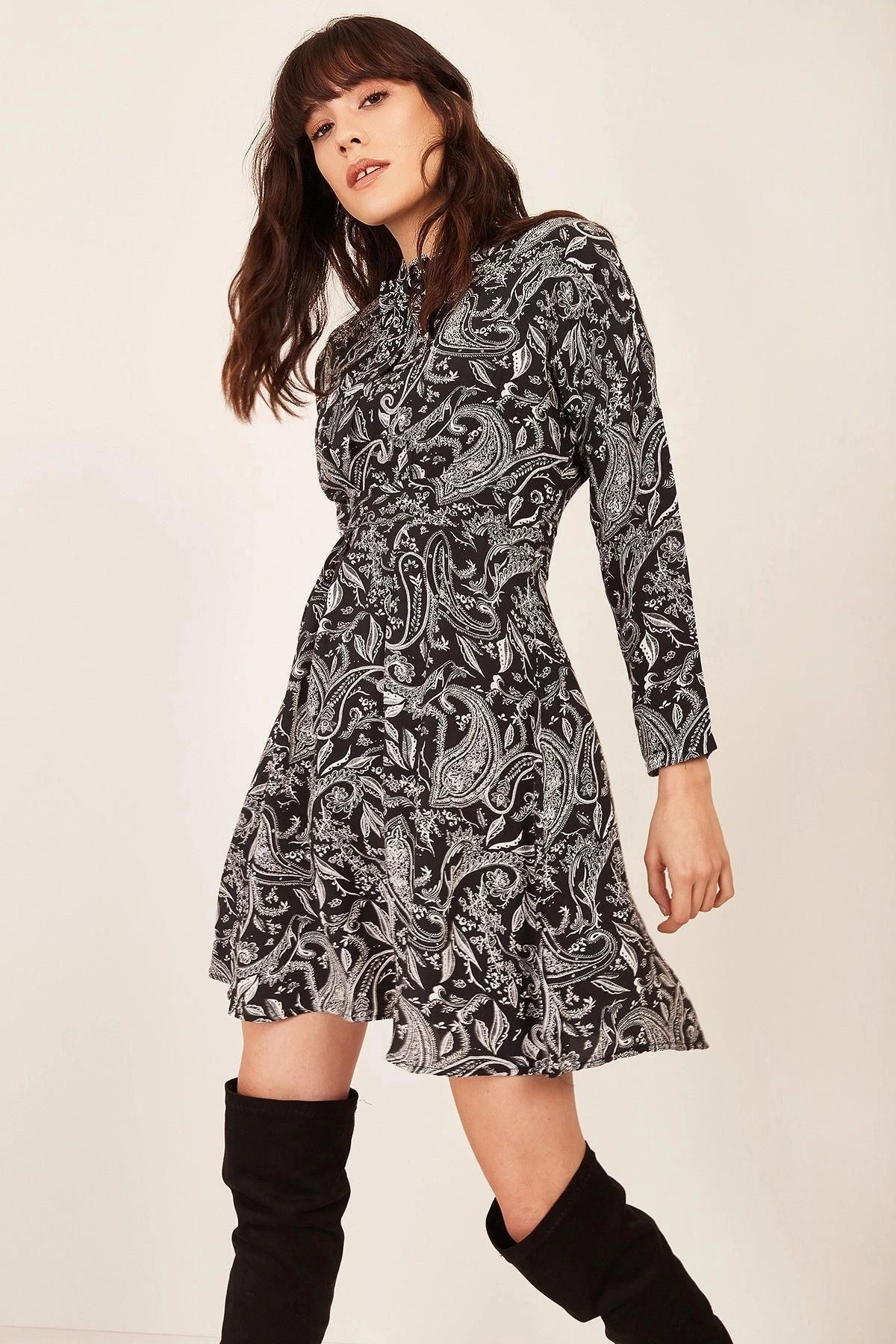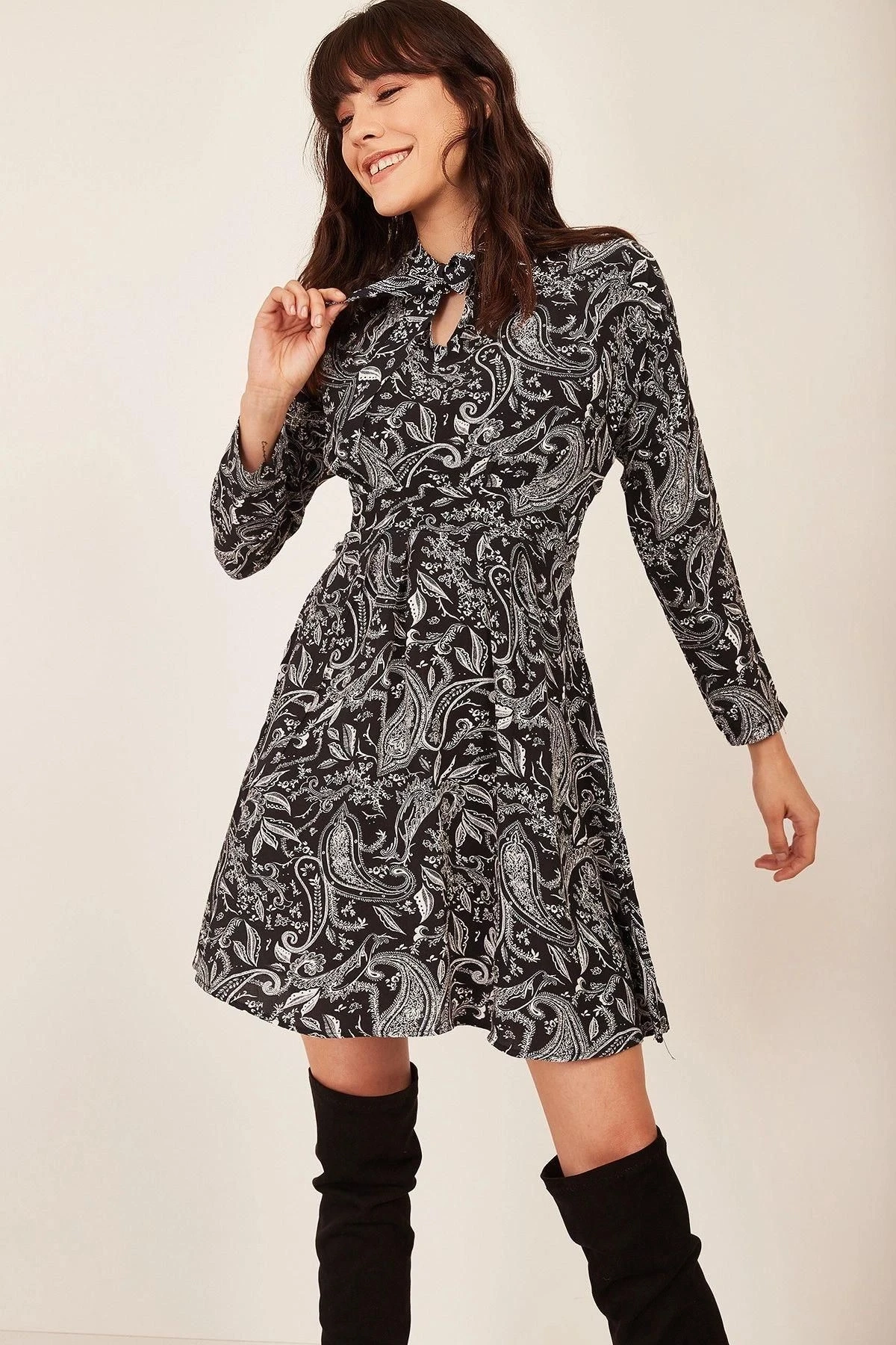 Kadın Siyah Bağlamalı Yaka Uzun Kol Desenli Regular Kesim Midi Boy Diz üstü Elbise