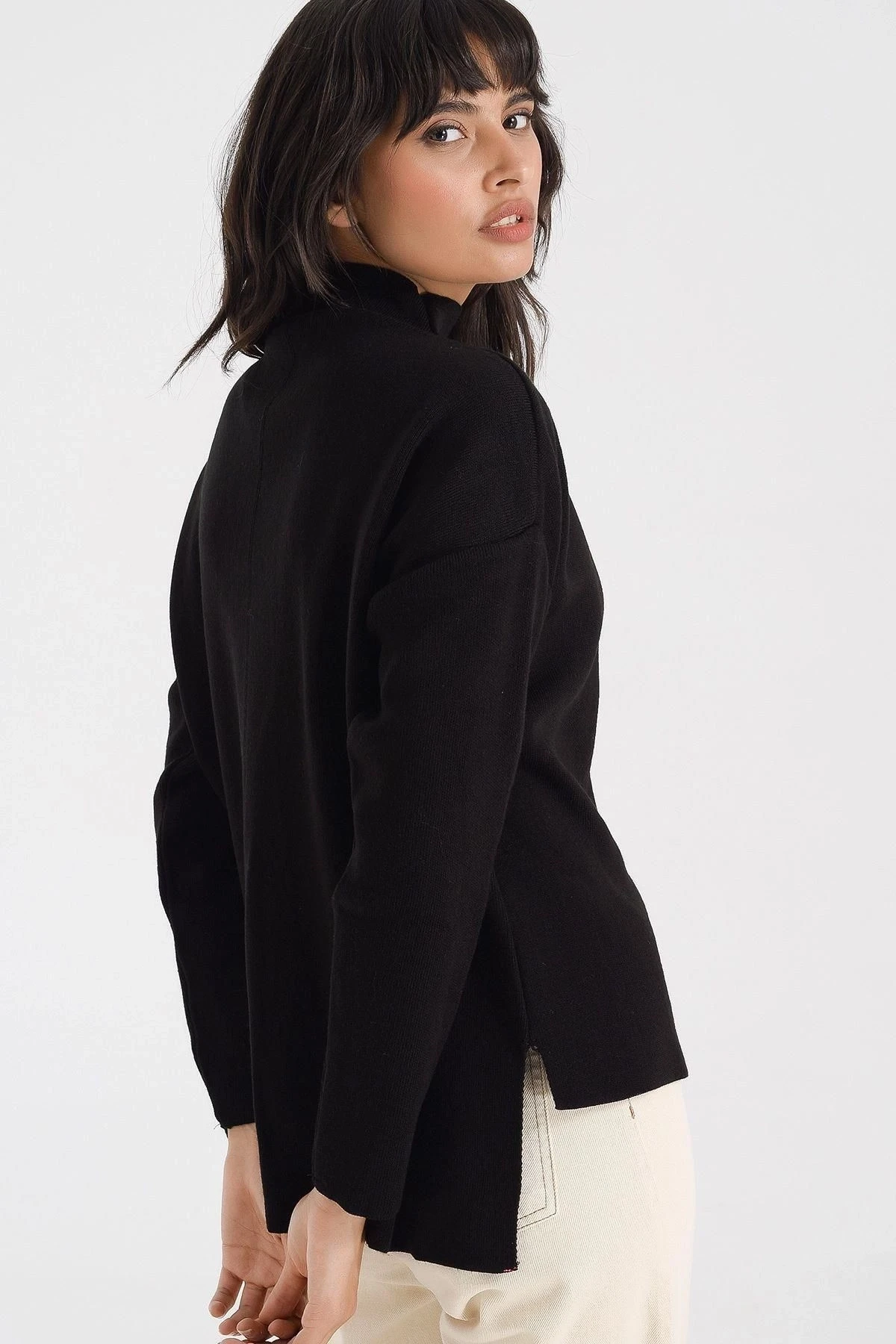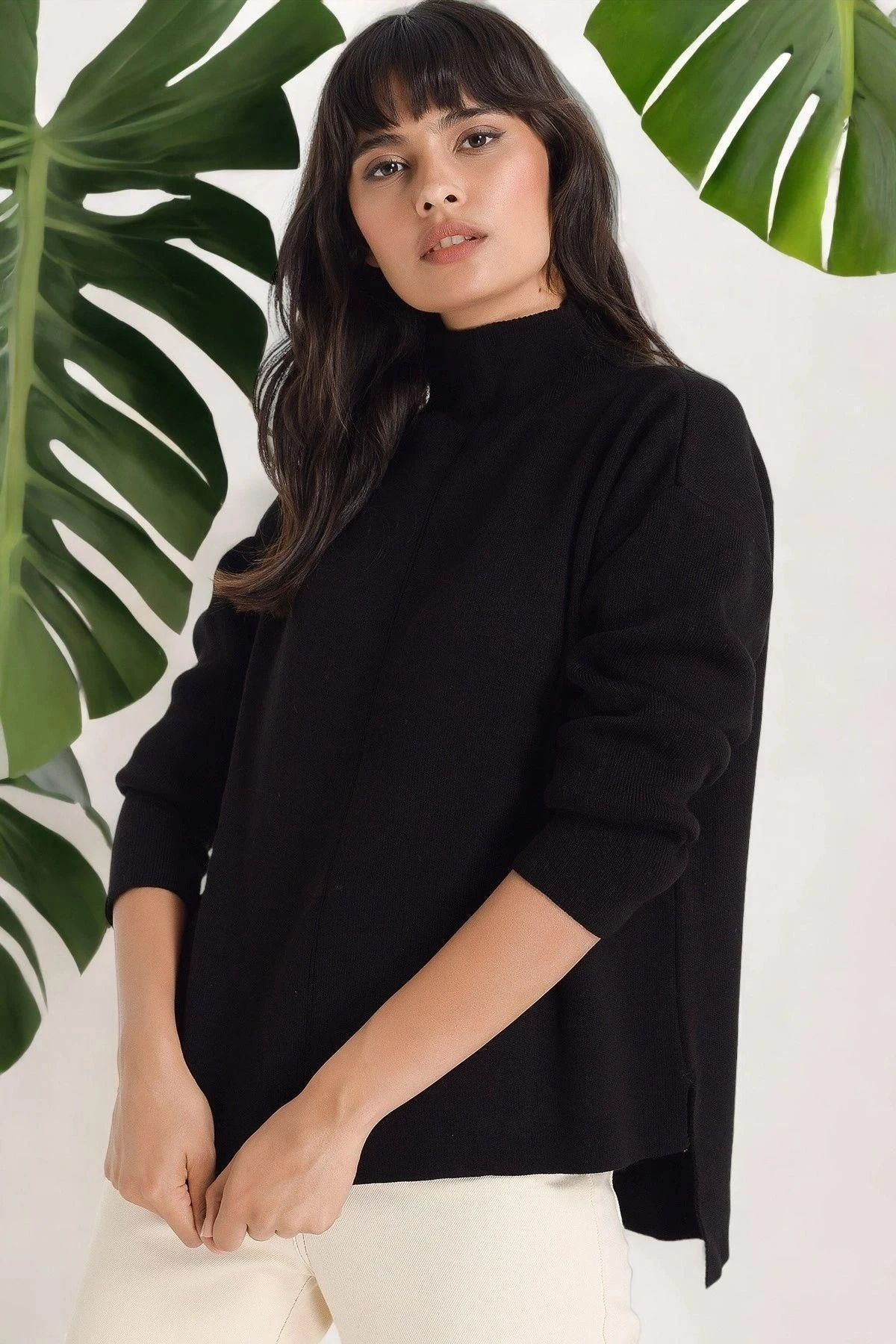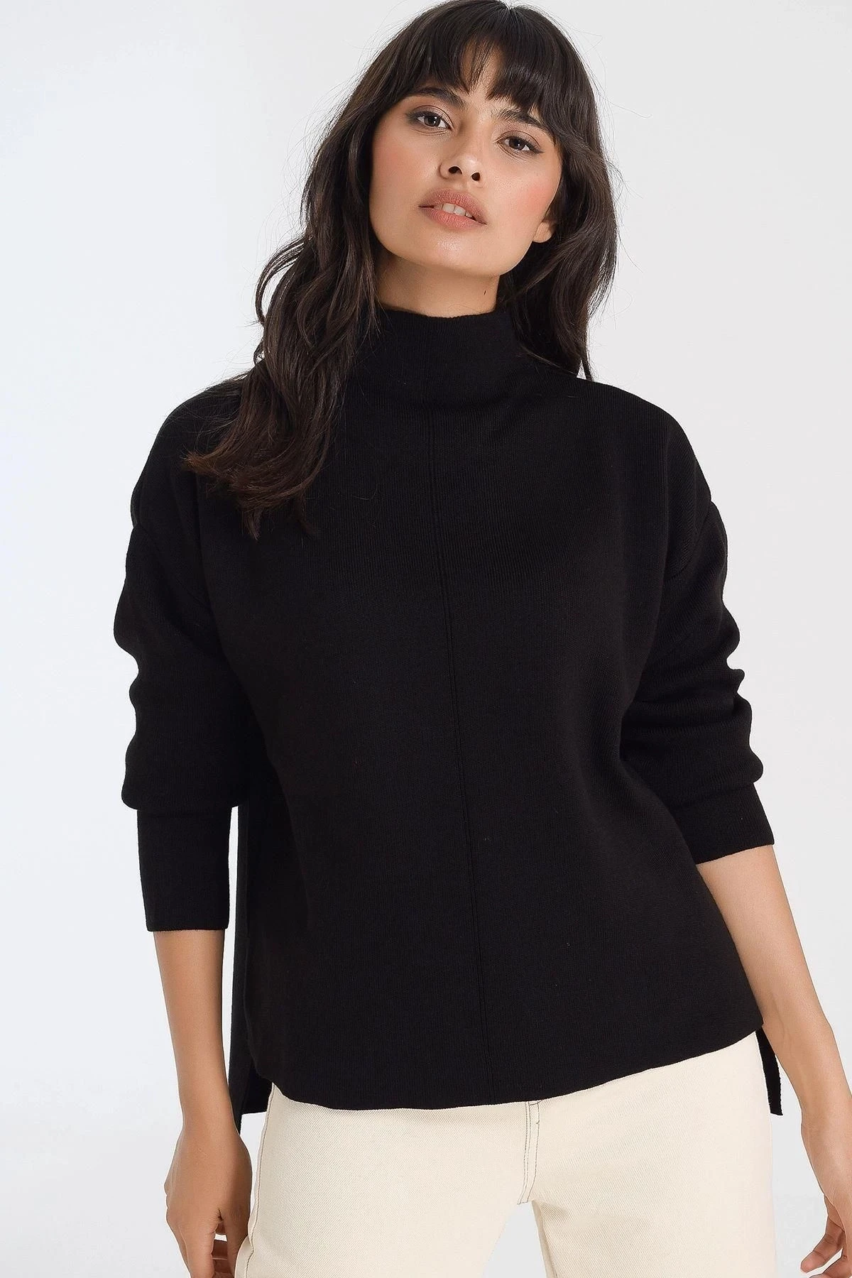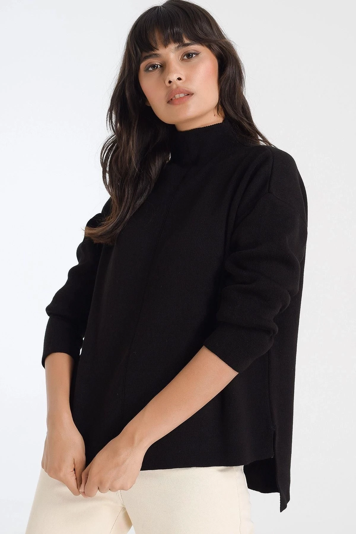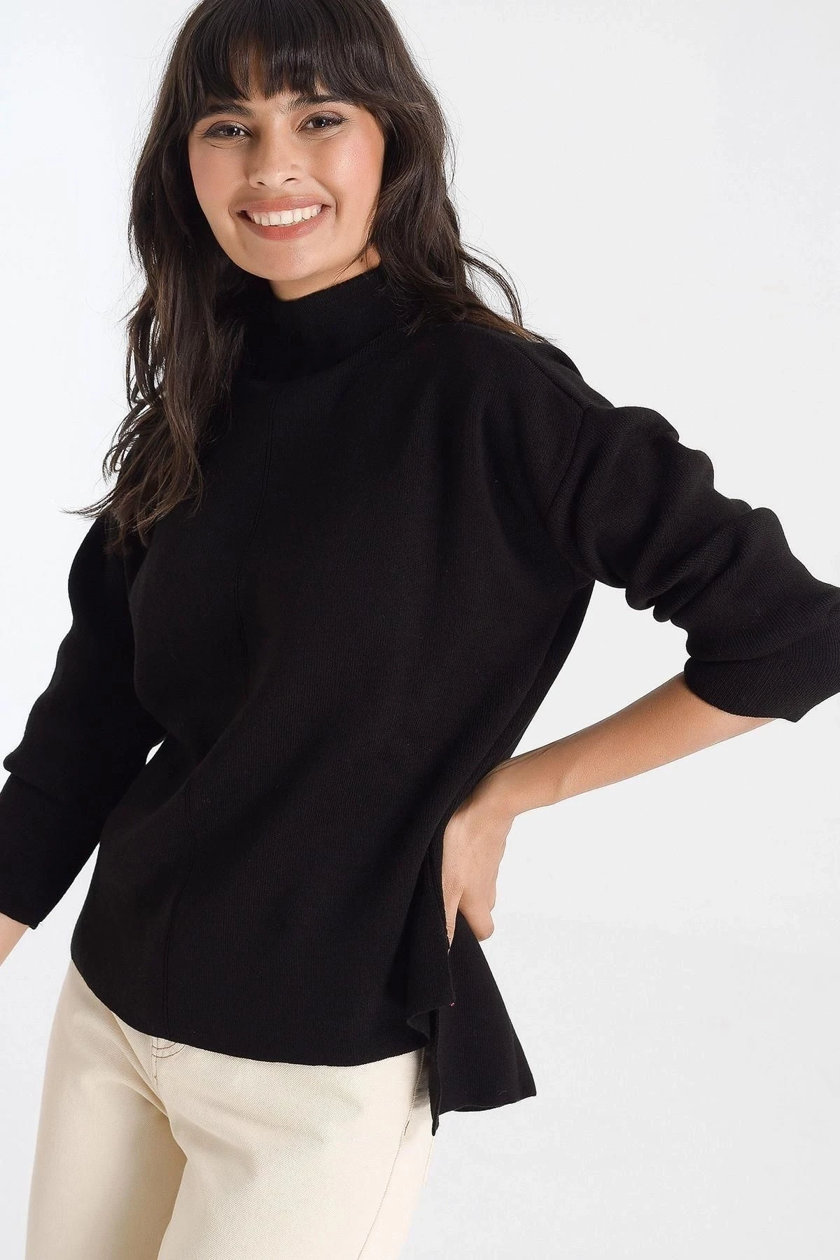 Kadın Siyah Balıkçı Yaka Uzun Kol Asimetrik Kesim Oversize Triko, Standart Boy