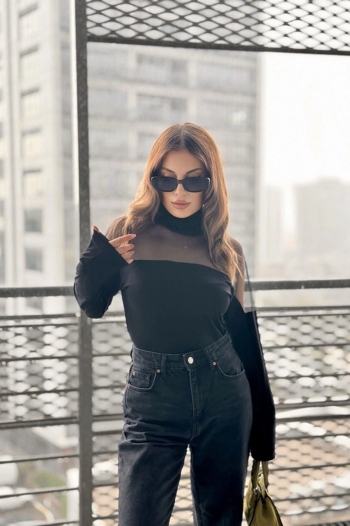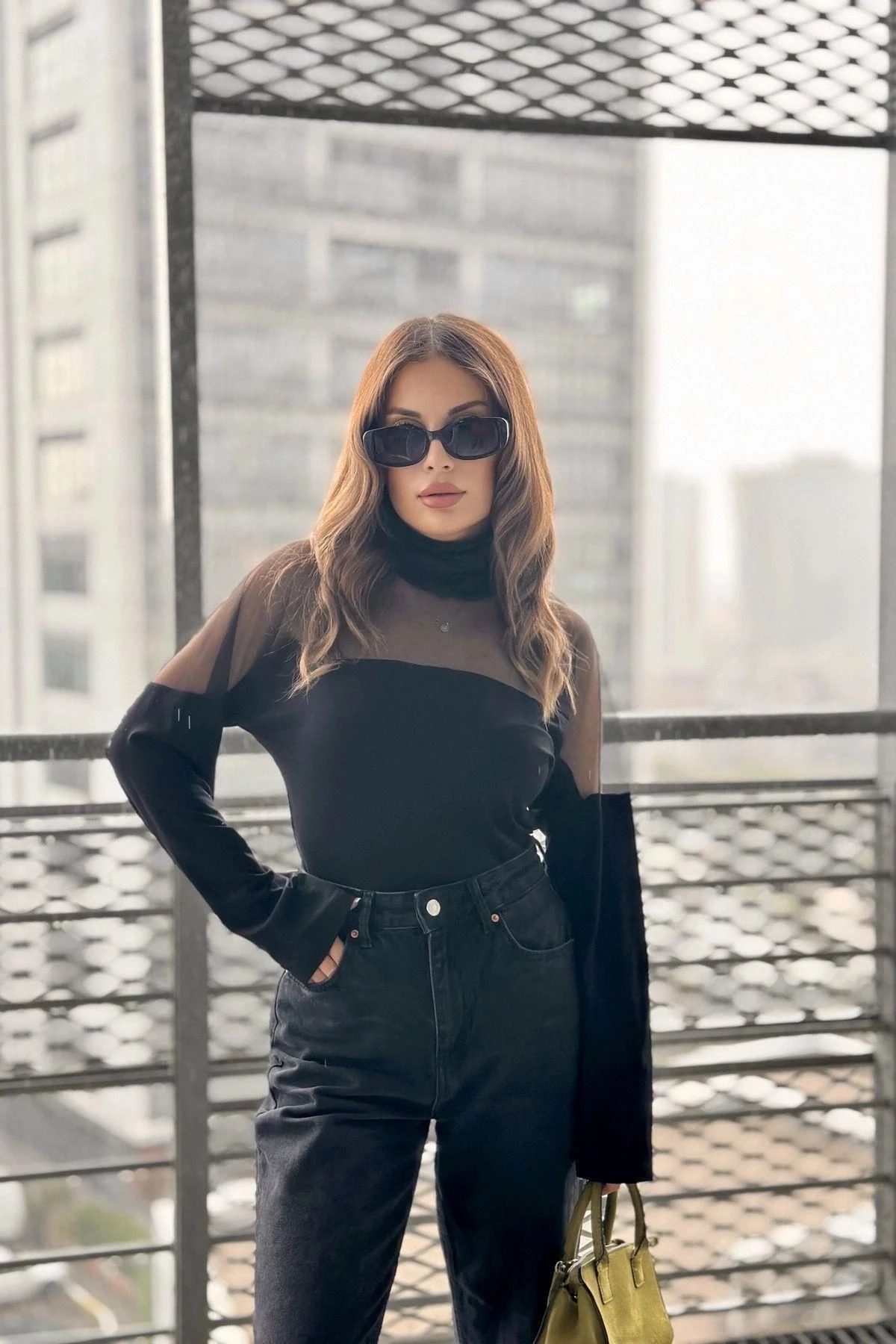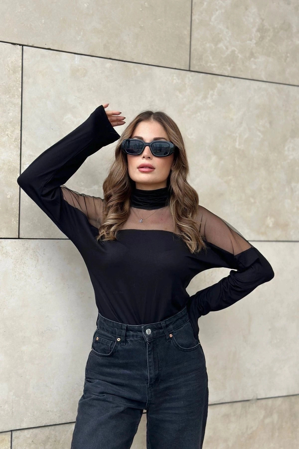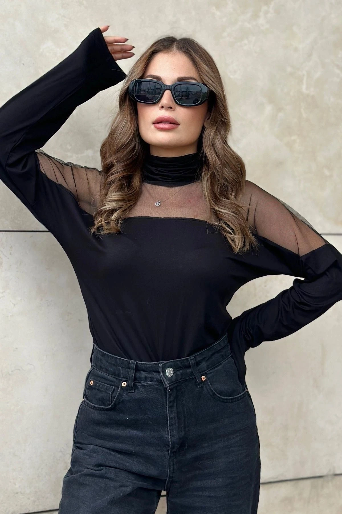 Kadın Siyah Balıkçı Yaka, Uzun Kol, Transparan Tül Detaylı, Salaş, Örme Bluz