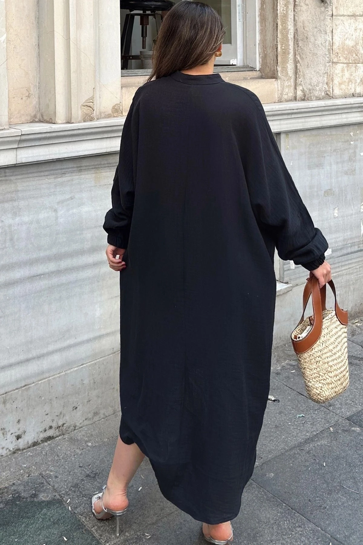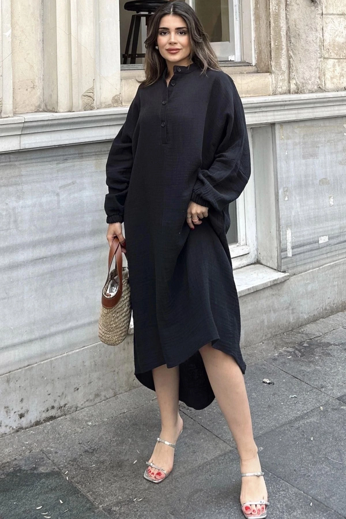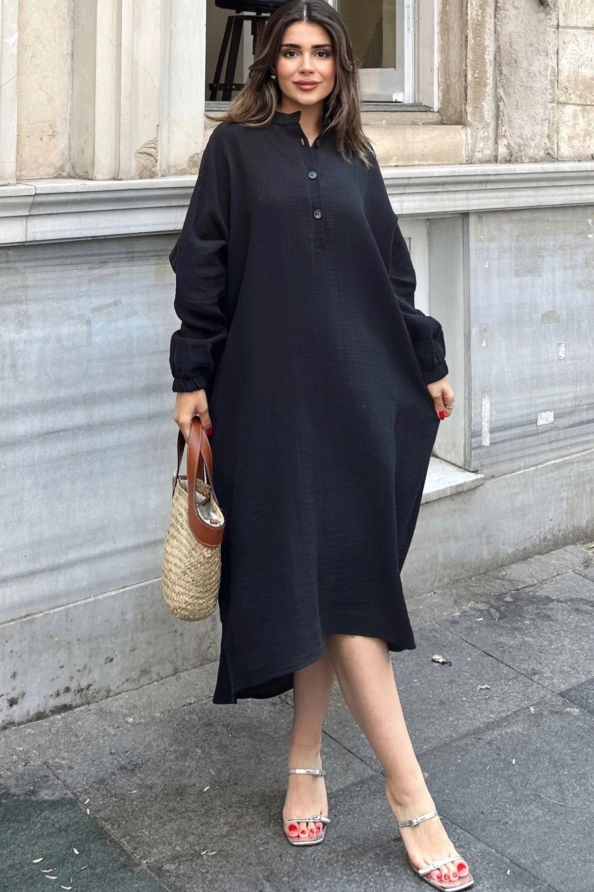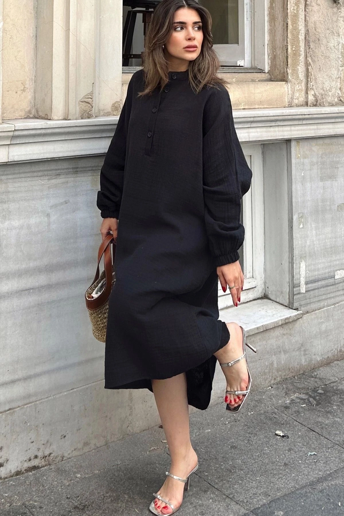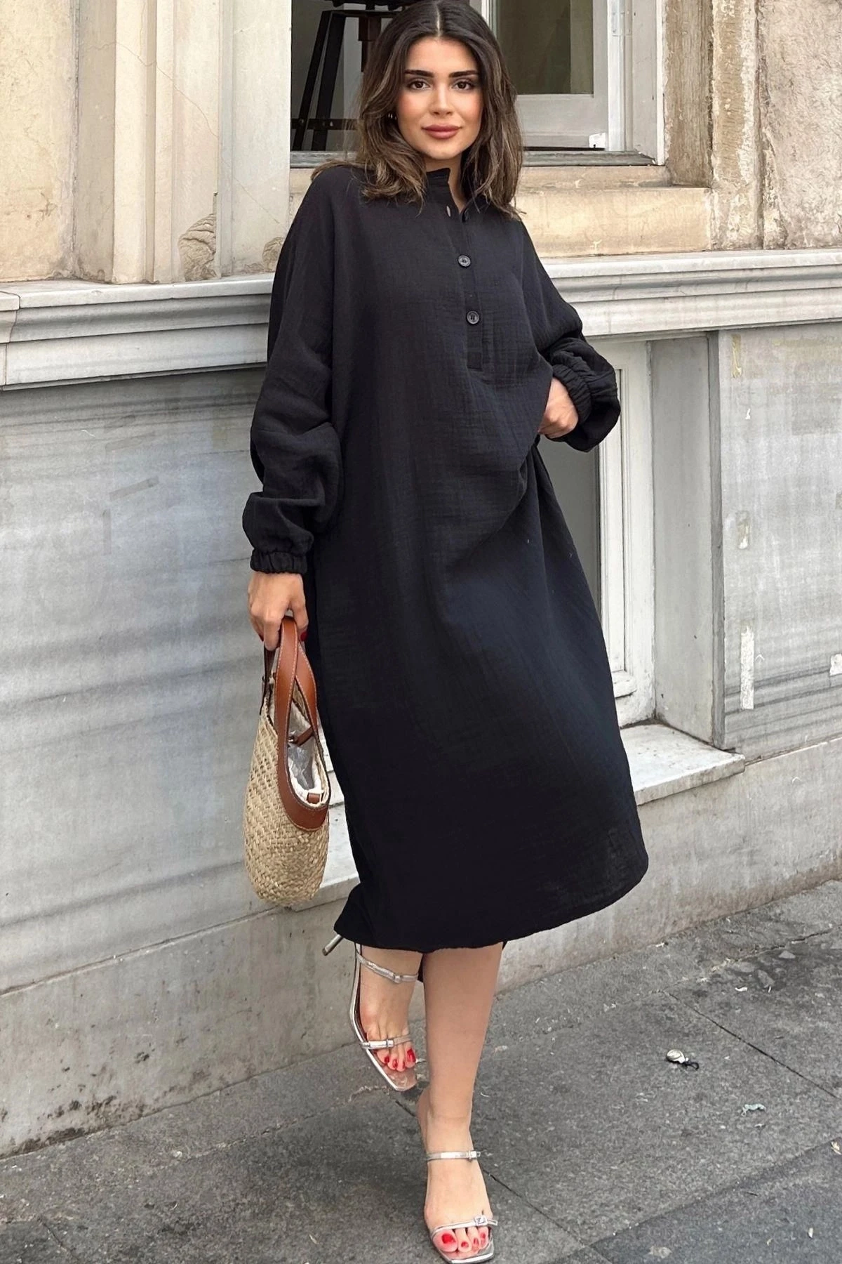 Kadın Siyah Balon Kol, Hakim Yaka, Terletmez Pamuklu, İthal Müslin Kumaş, Uzun Salaş Elbise
