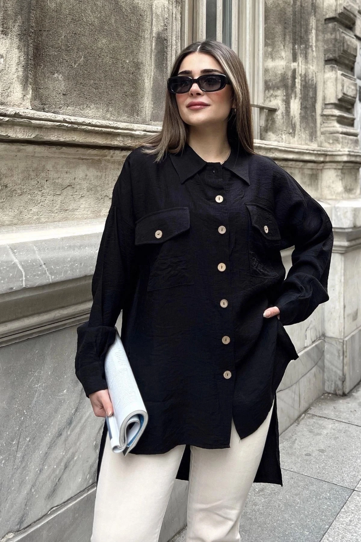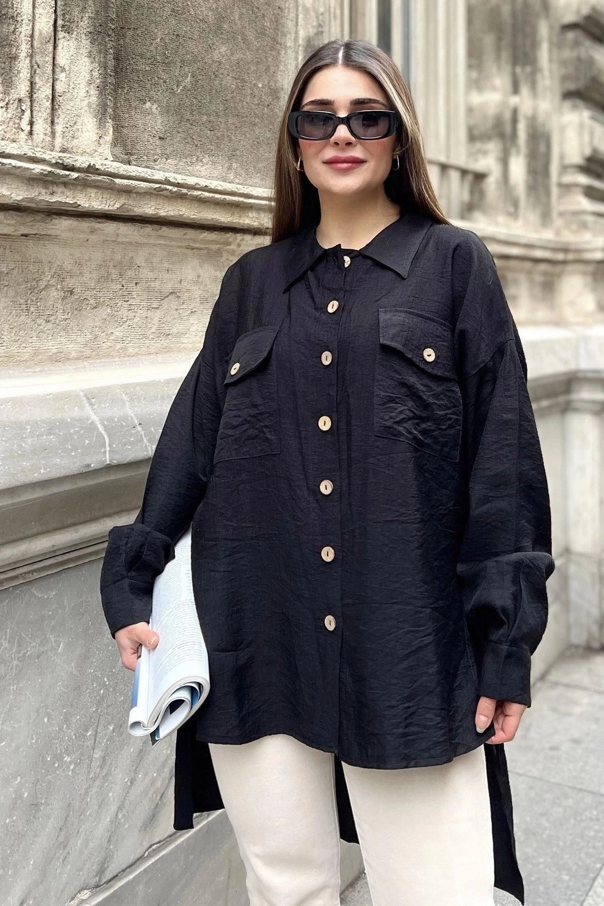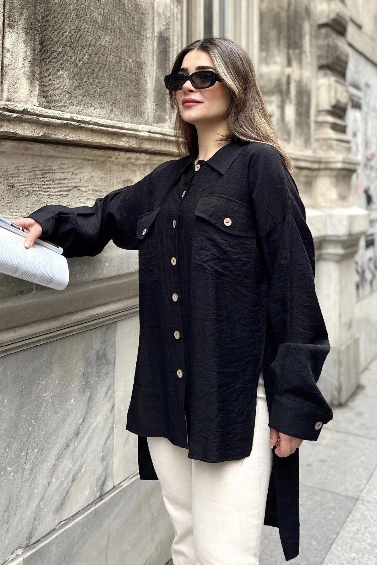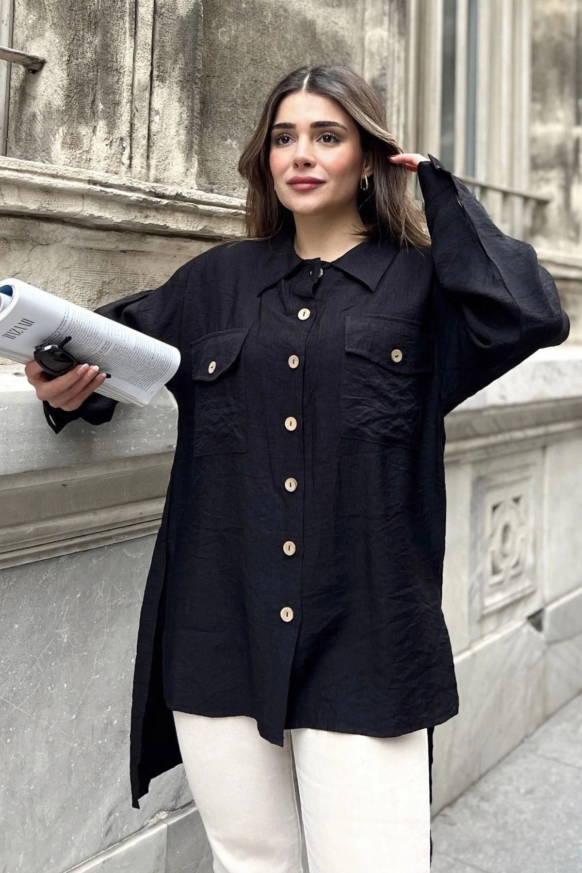 Kadın siyah Balon Kol, Pileli, Yırtmaçlı, Oversize, Keten Tunik Gömlek