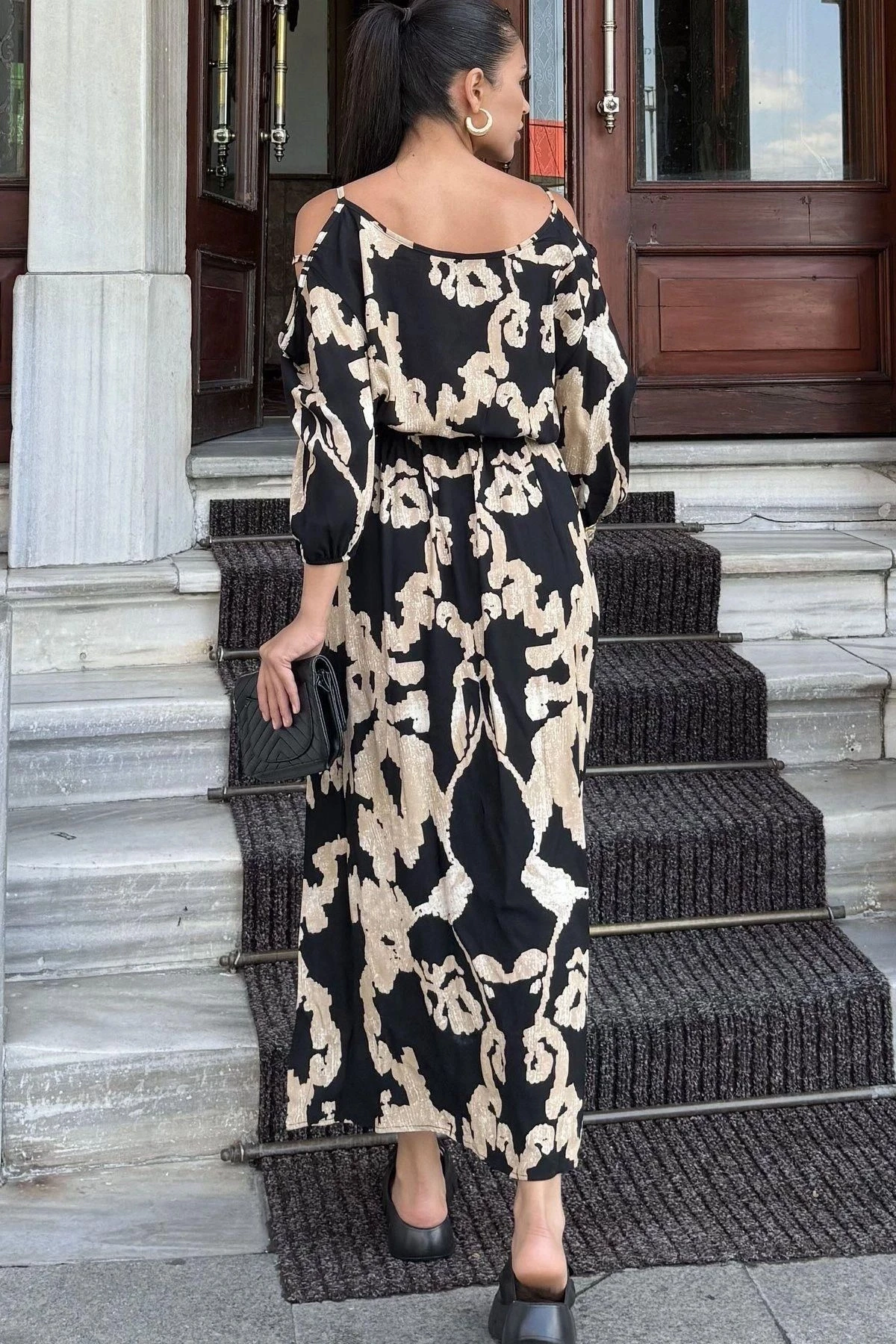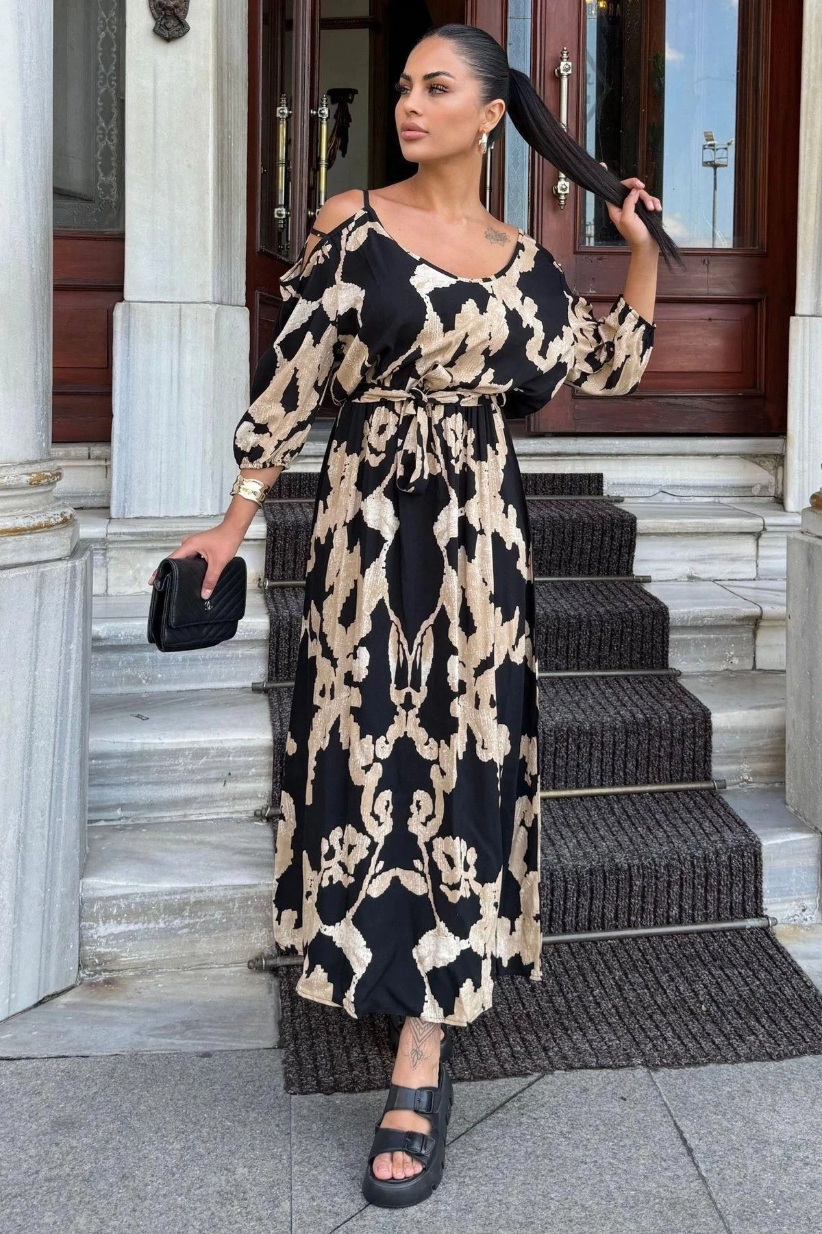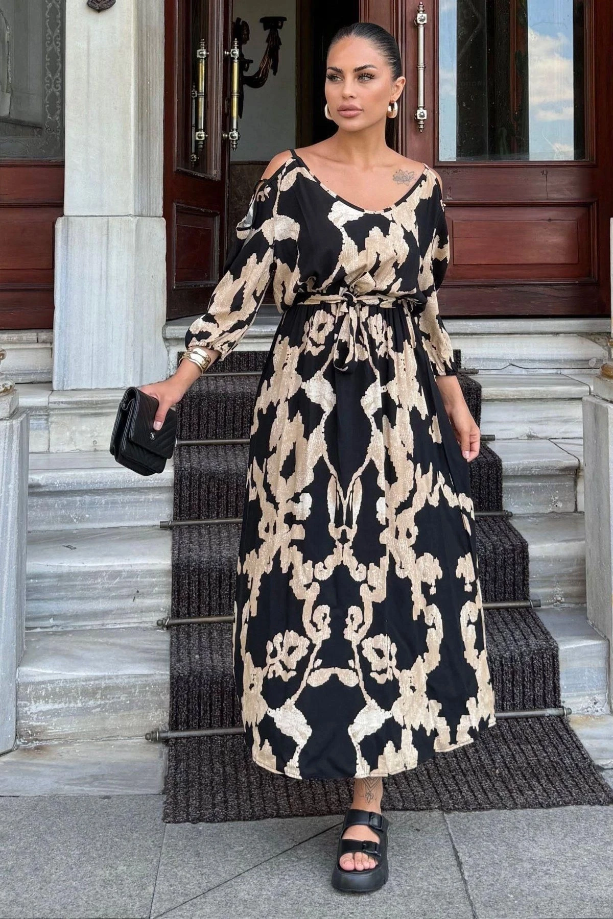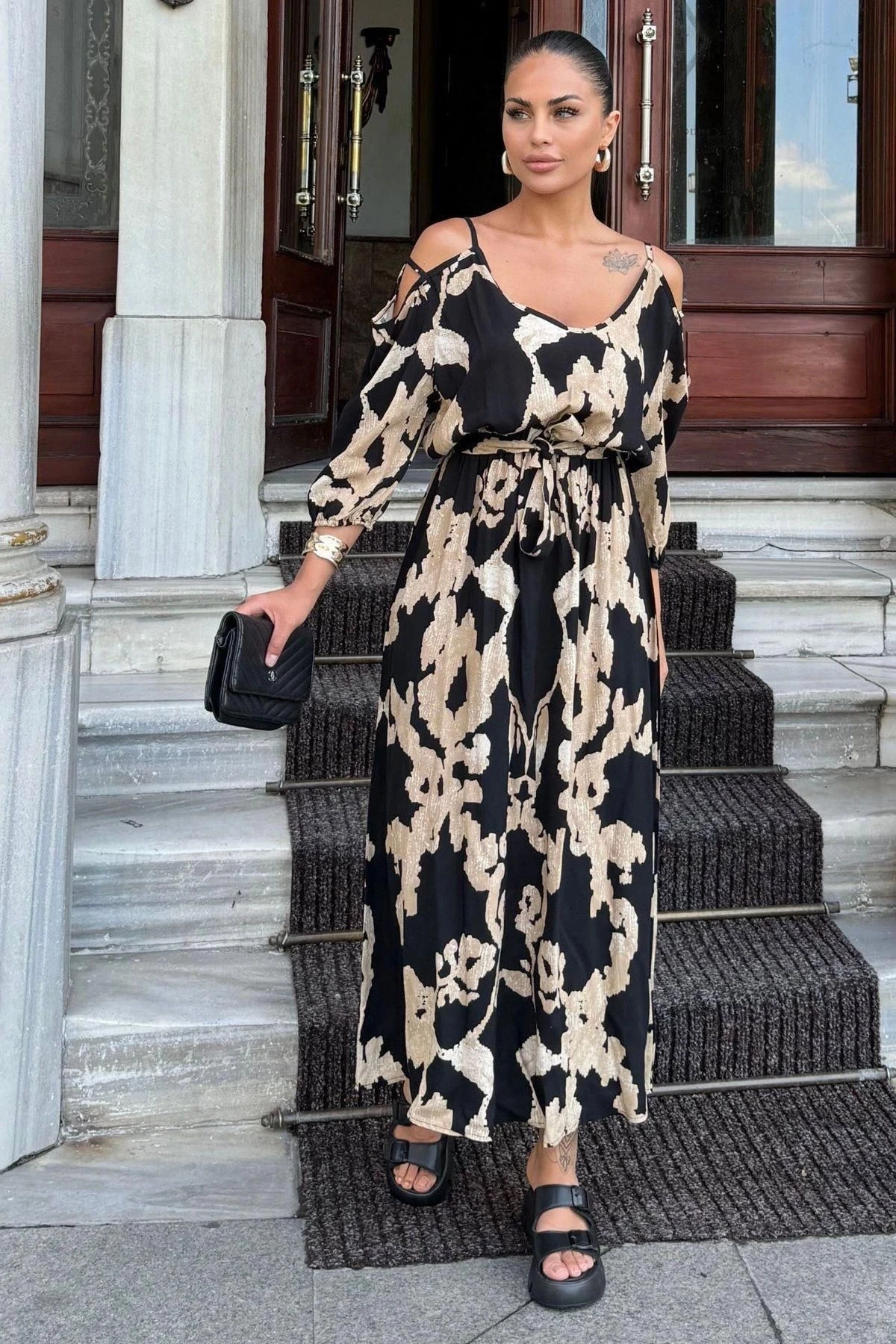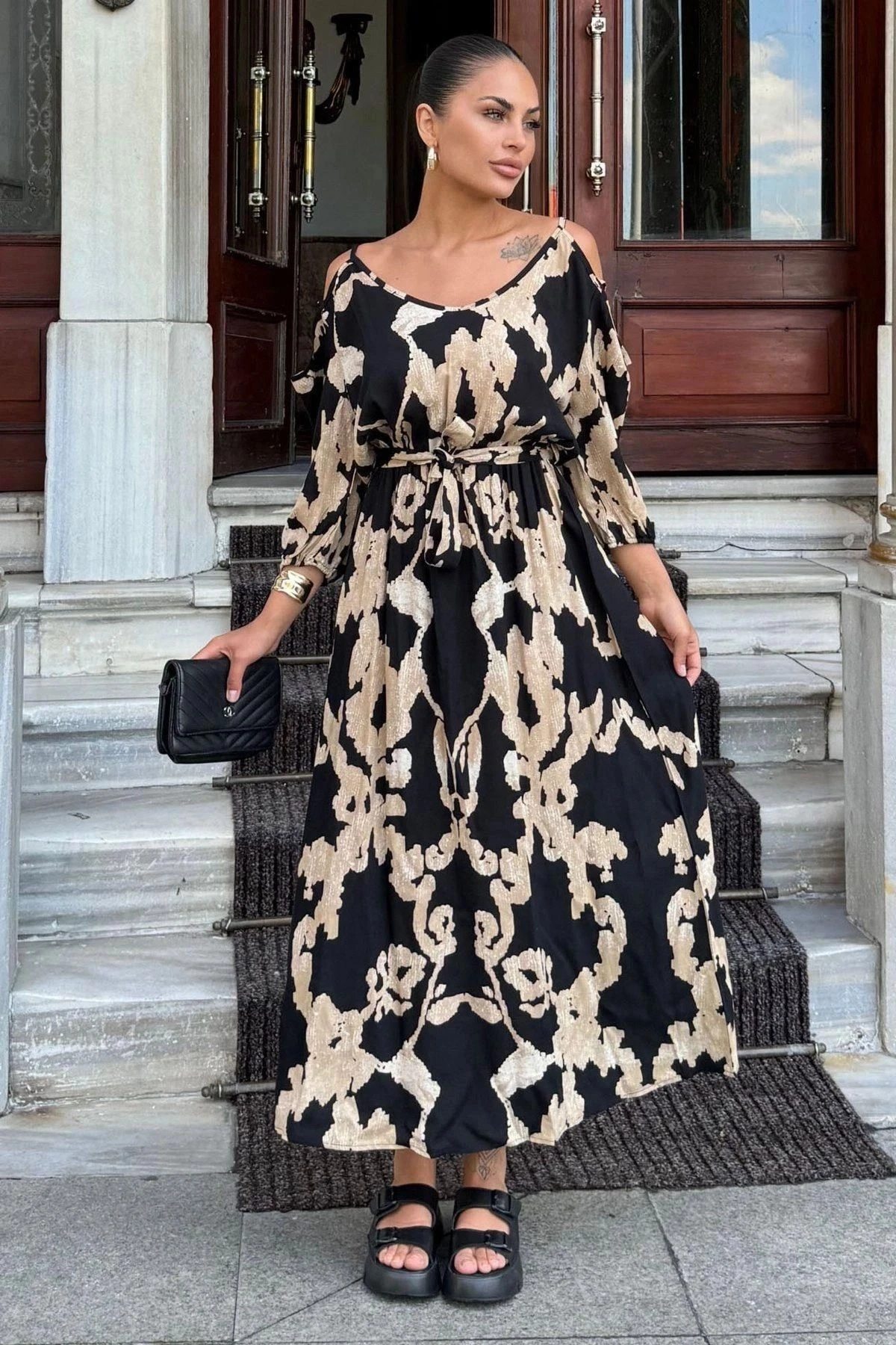 Kadın Siyah & Bej Kemerli, Omuz Detaylı, Salaş, Dökümlü Uzun Elbise