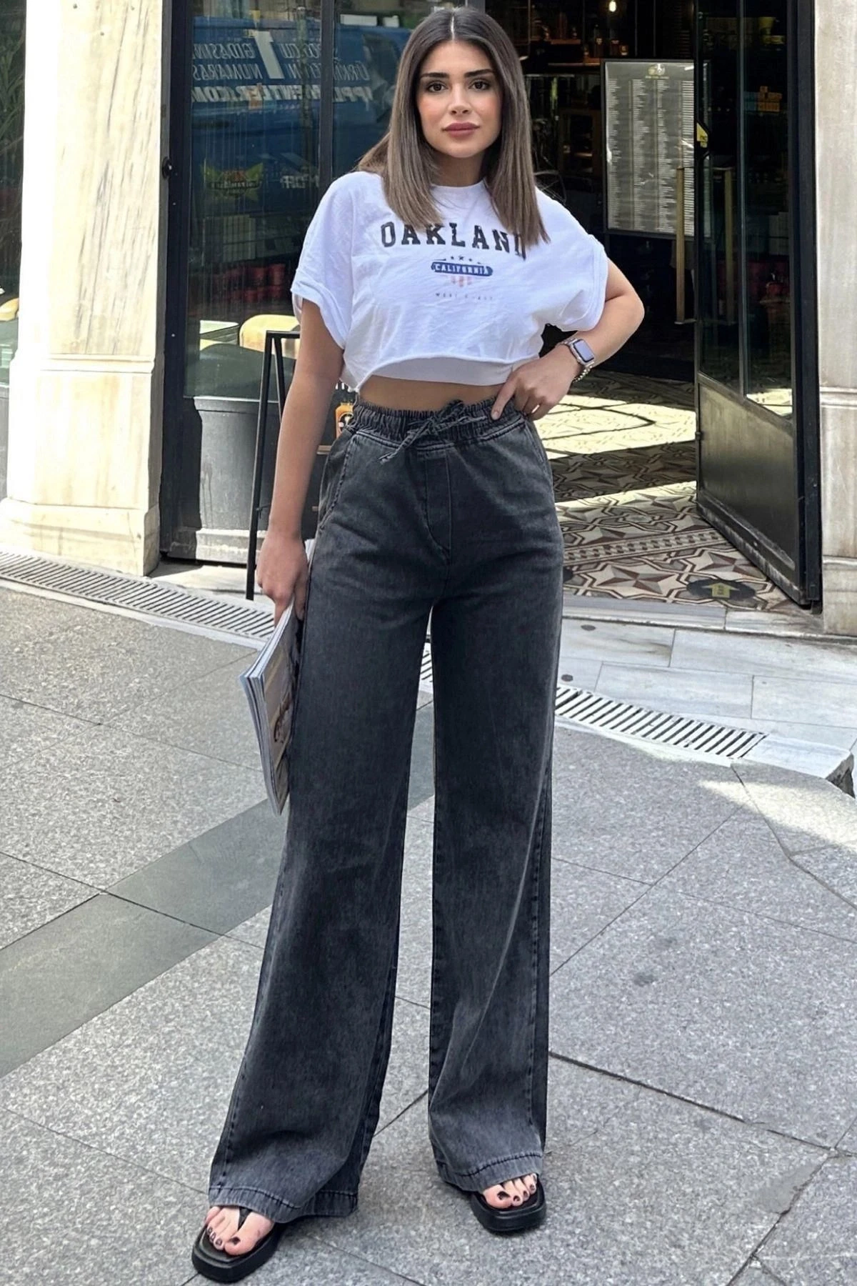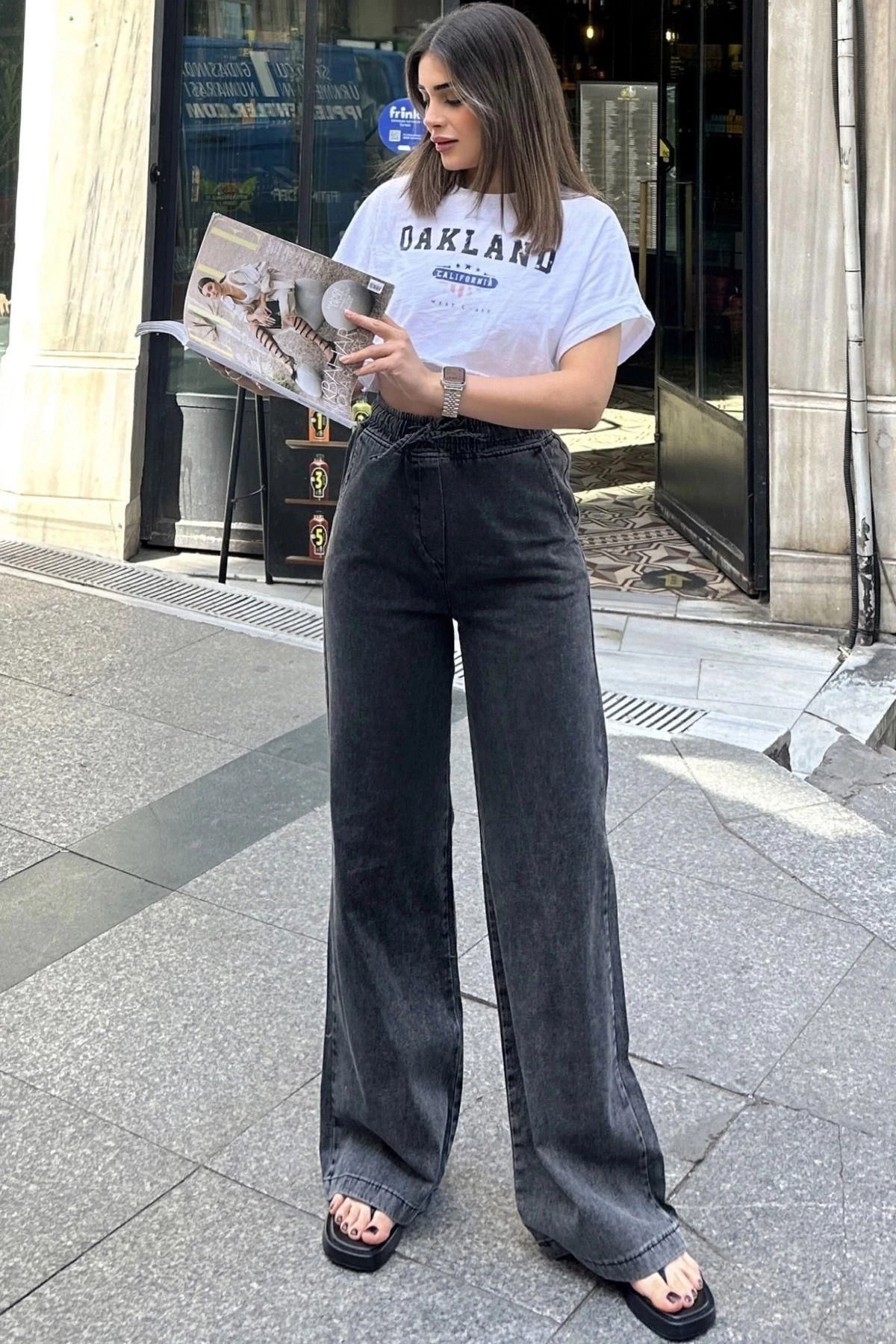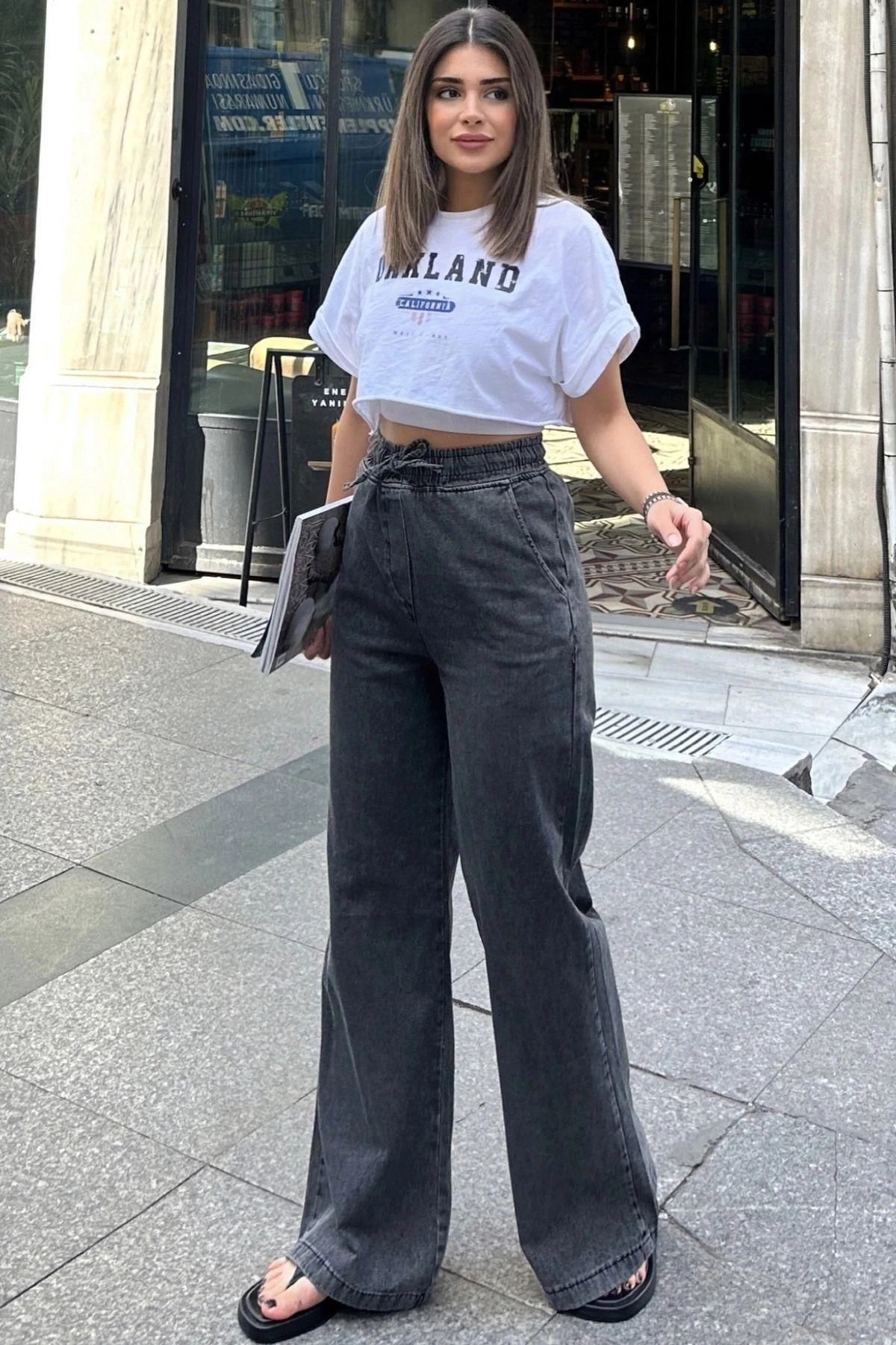 Kadın Siyah Beli Lastikli, Bagcıklı, Cepli, Bol Paça, Palazzo Kot Pantolon - Tesettüre Uygun