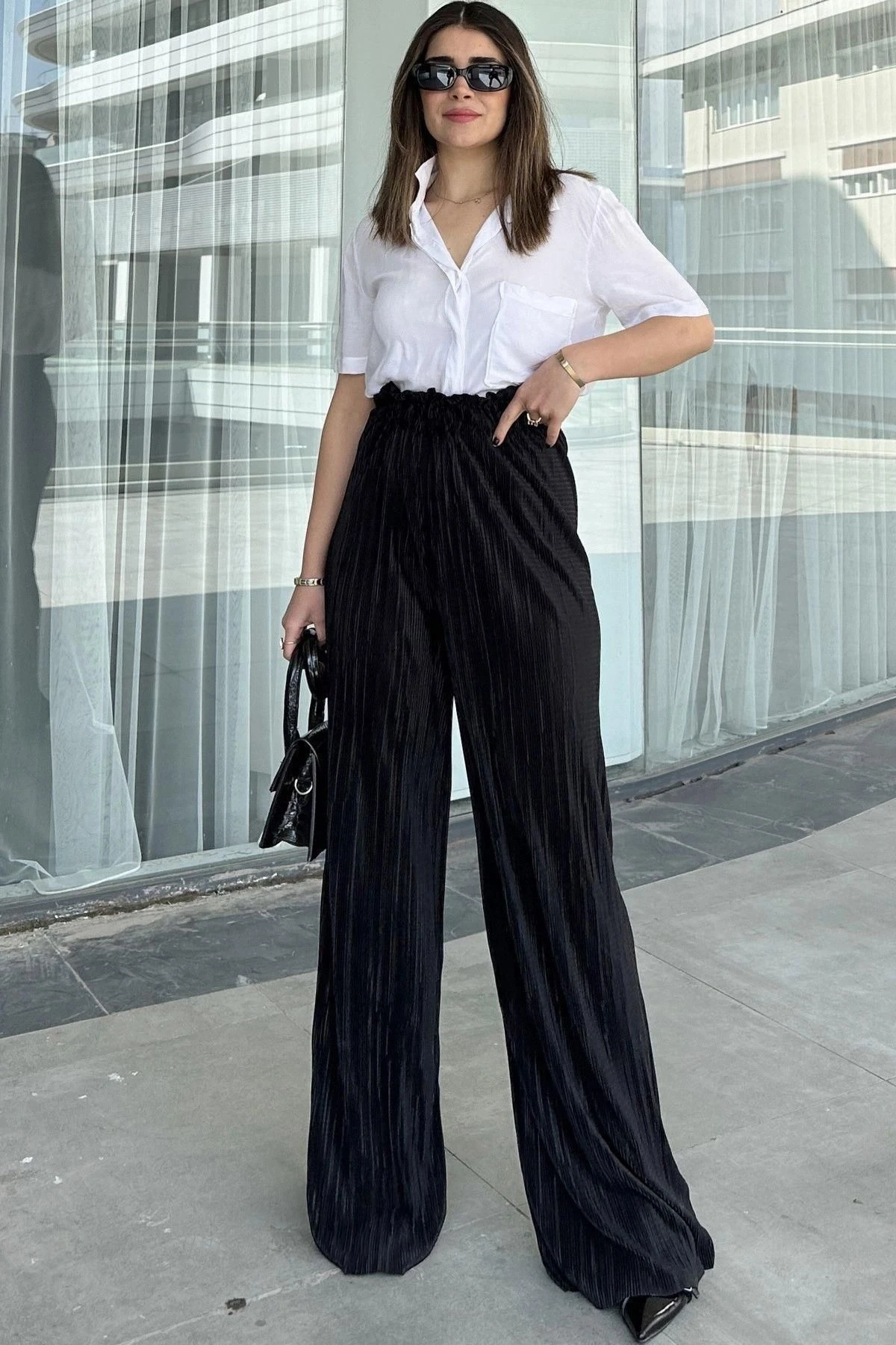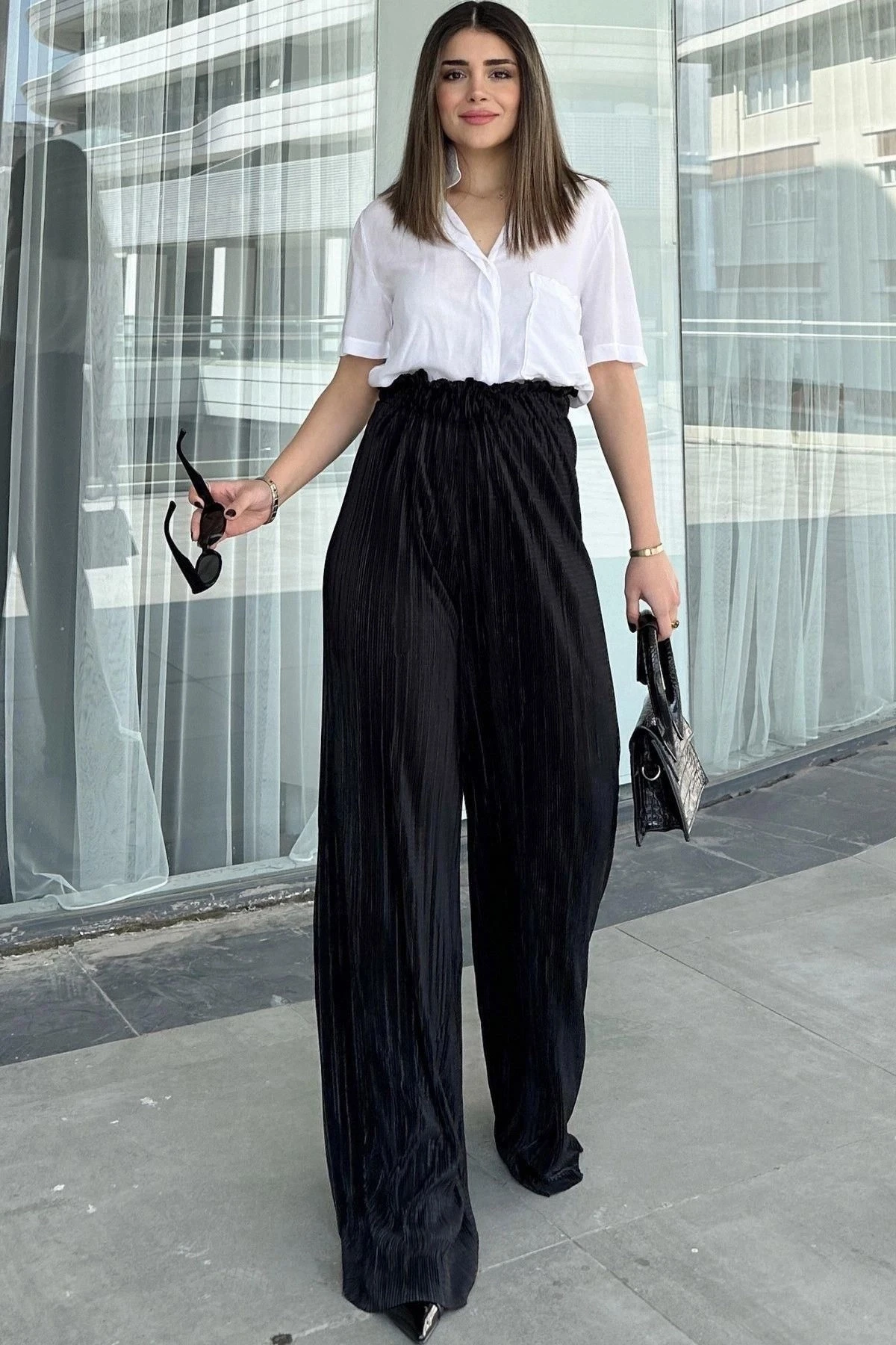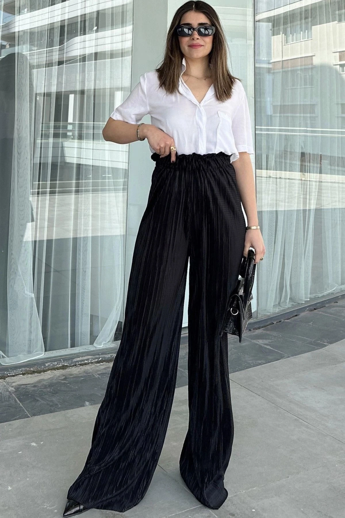 Kadın Siyah Beli Lastikli, Yüksel Bel, Salaş Kesim, Bol Paça Bürümcük Pantolon