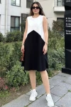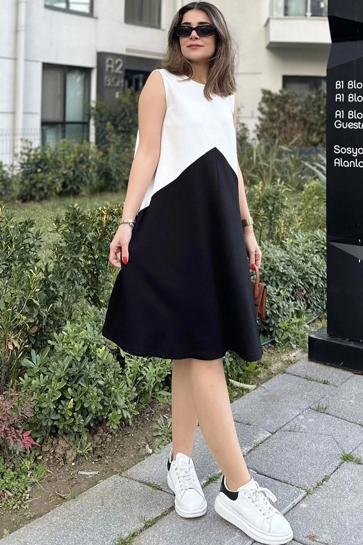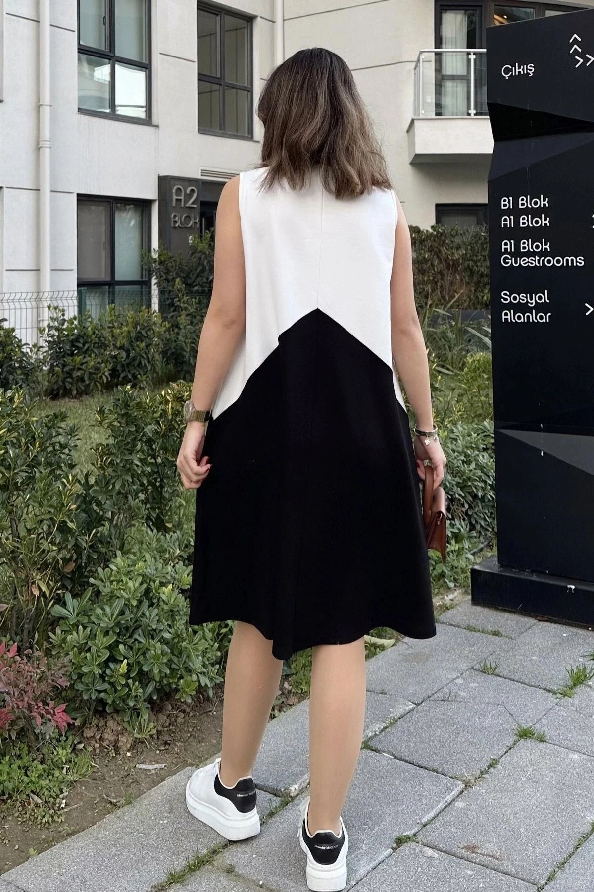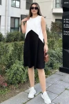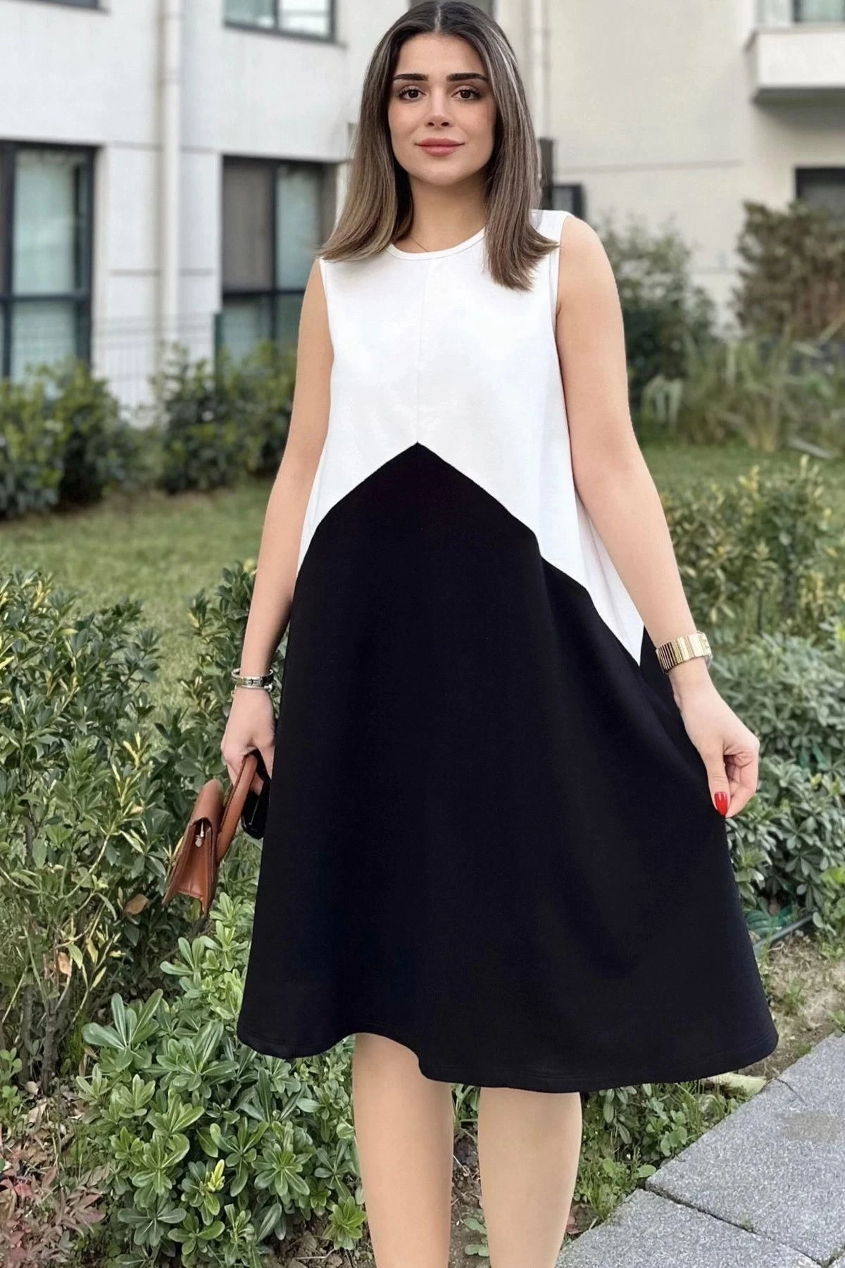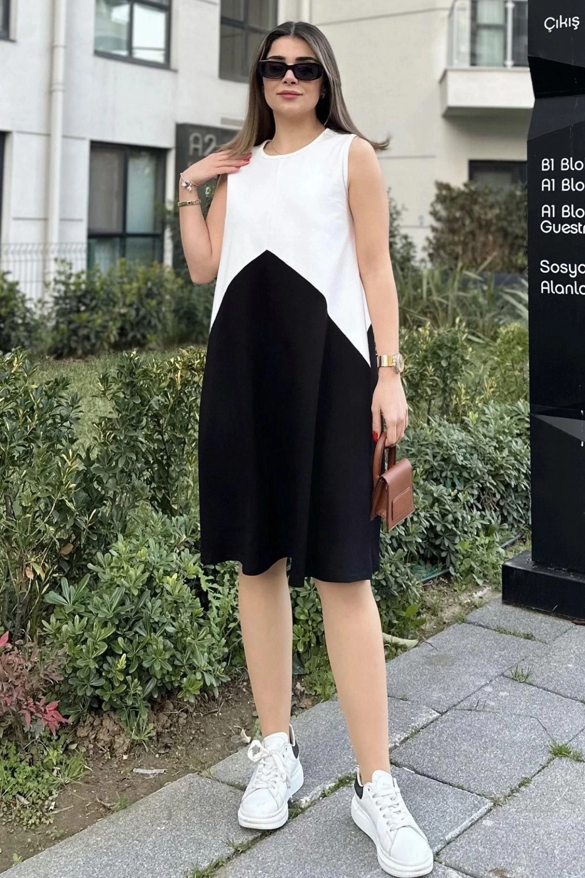 Kadın Siyah & Beyaz Color Blocklu, Kolsuz, Yuvarlak Yaka, Midi Salaş Elbise