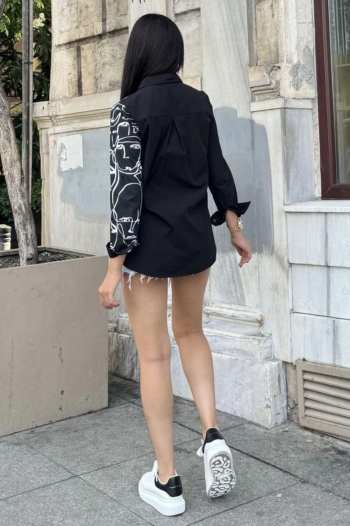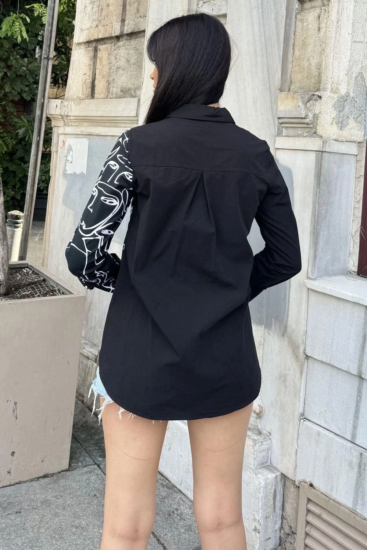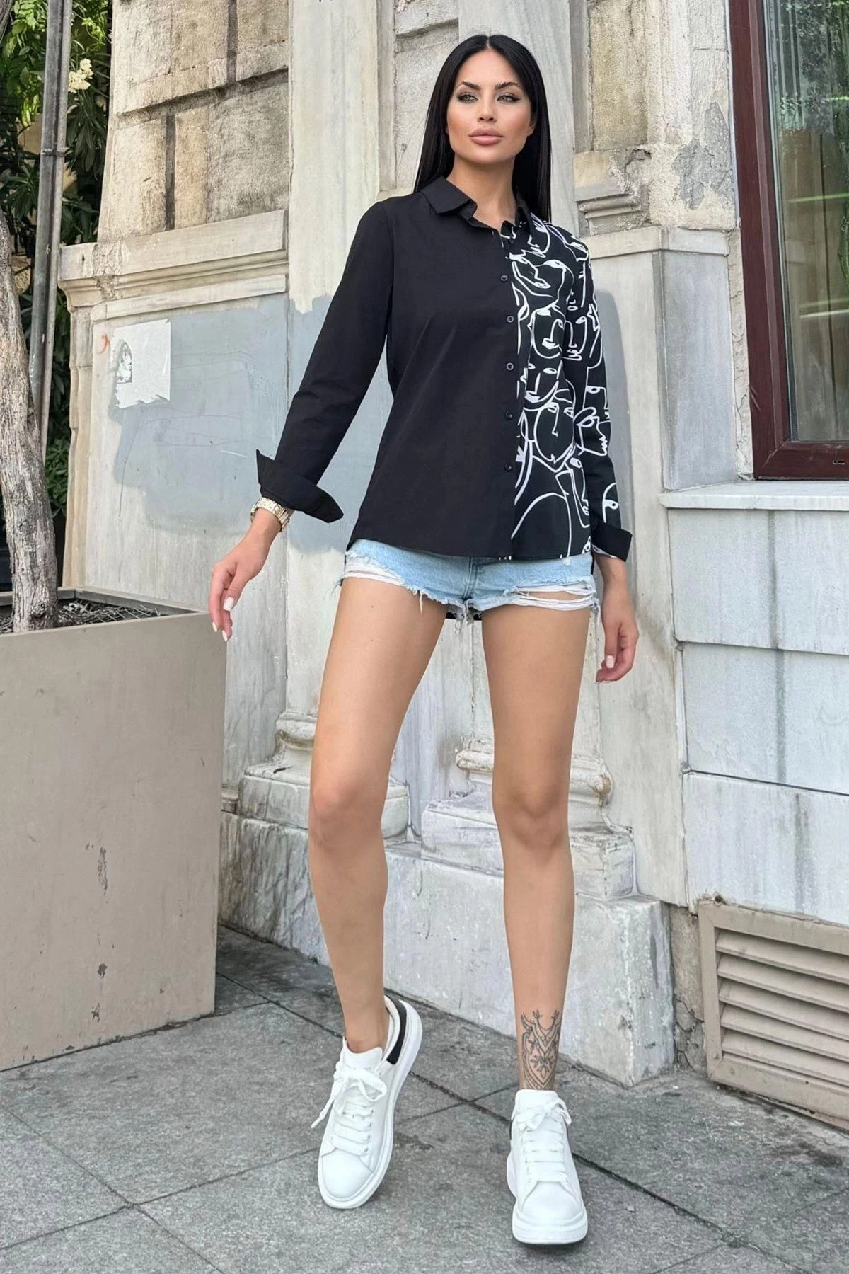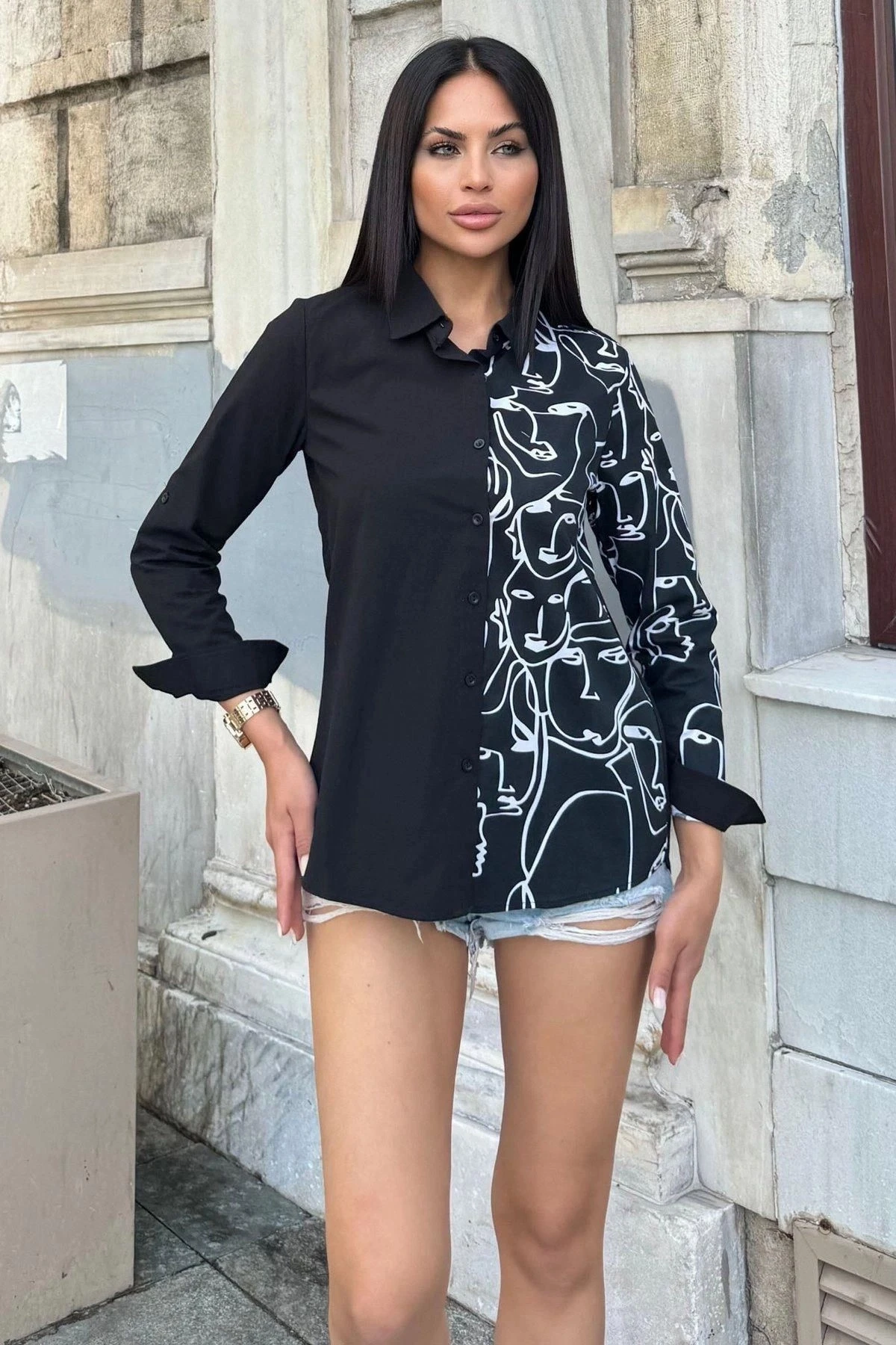 Kadın Siyah & Beyaz Desenli İki Renkli Uzun Kol Regular Kesim Standart Boy Gömlek