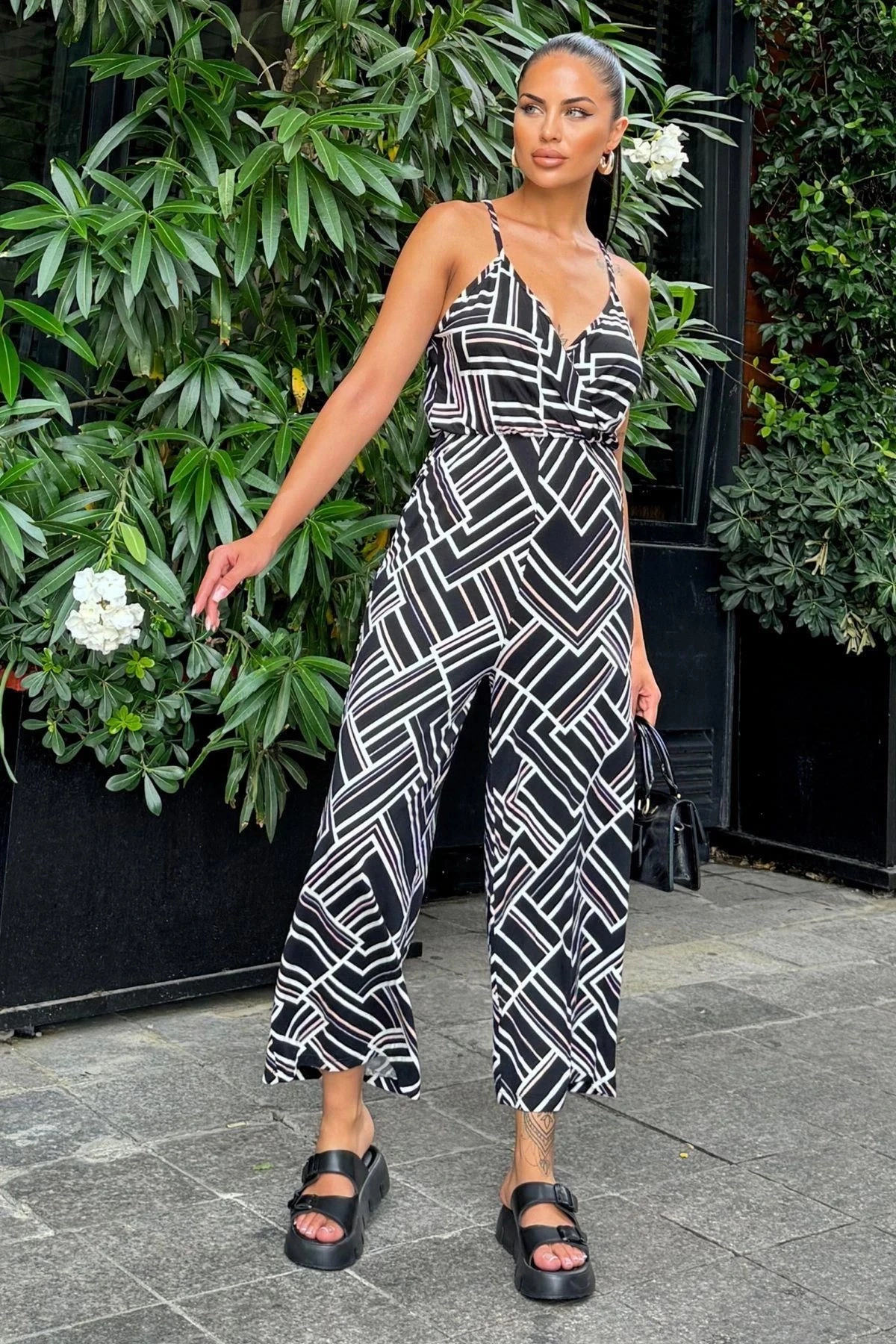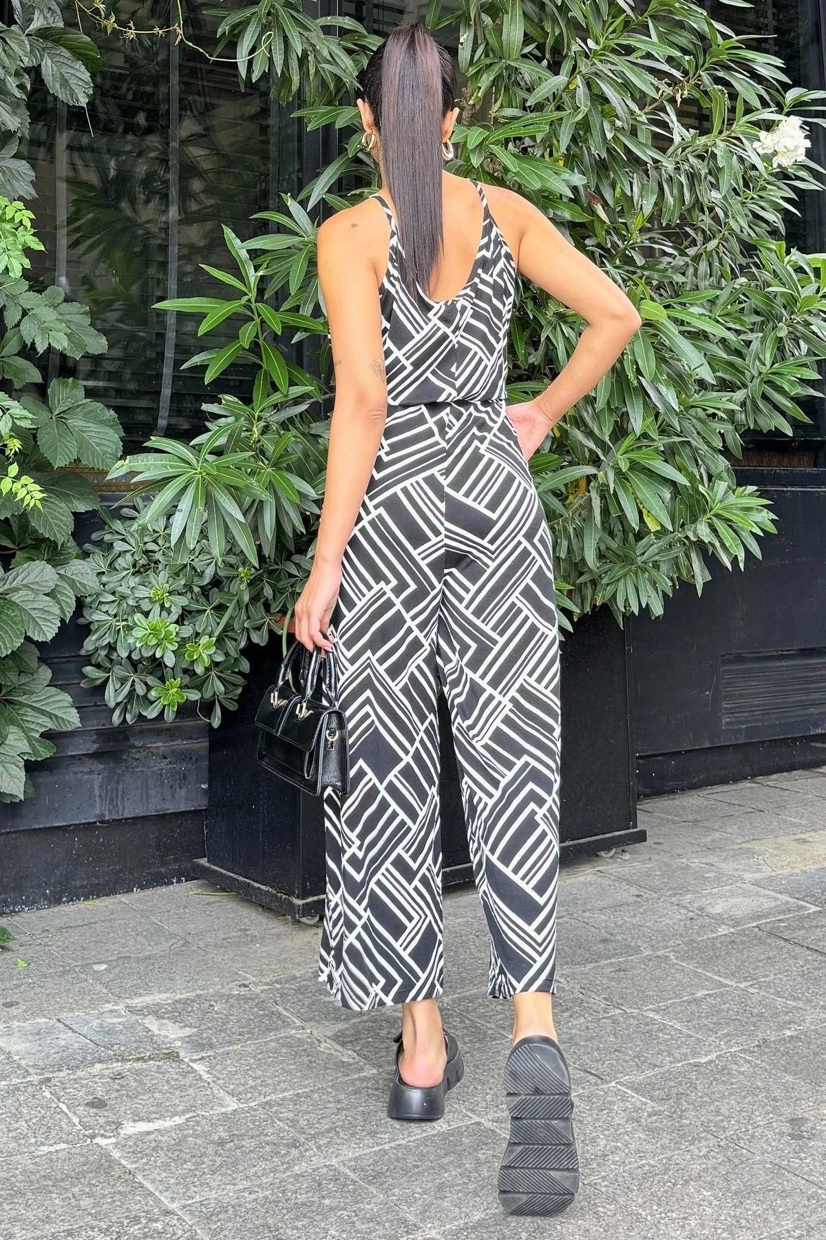Kadın Siyah & Beyaz Rahat Ve Şık Askılı Kruvaze Yazlık Beli Lastikli Cepli Tulum