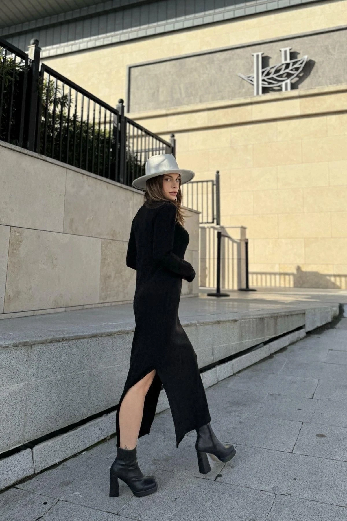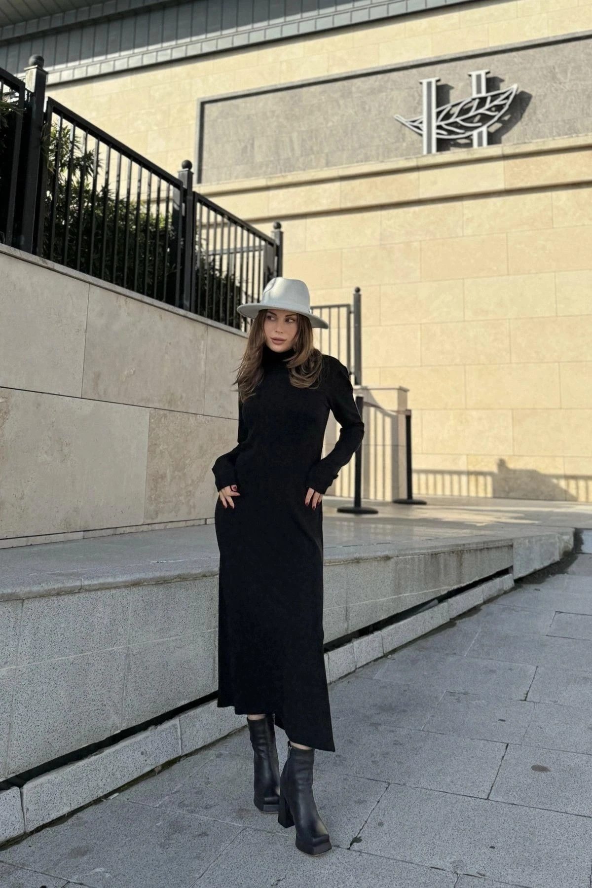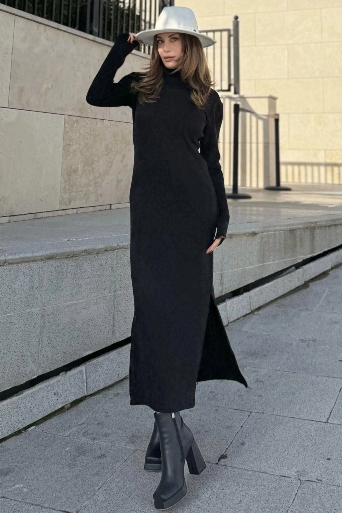 Kadın Siyah Bogazlı, Yırtmaç Detaylı, Vucuda Oturan Kalıp, Triko Elbise