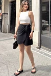 Kadın Siyah Çapraz Bağlama Detaylı, Terletmez Pamuklu, İthal Müslin Kumaş Etek Şort