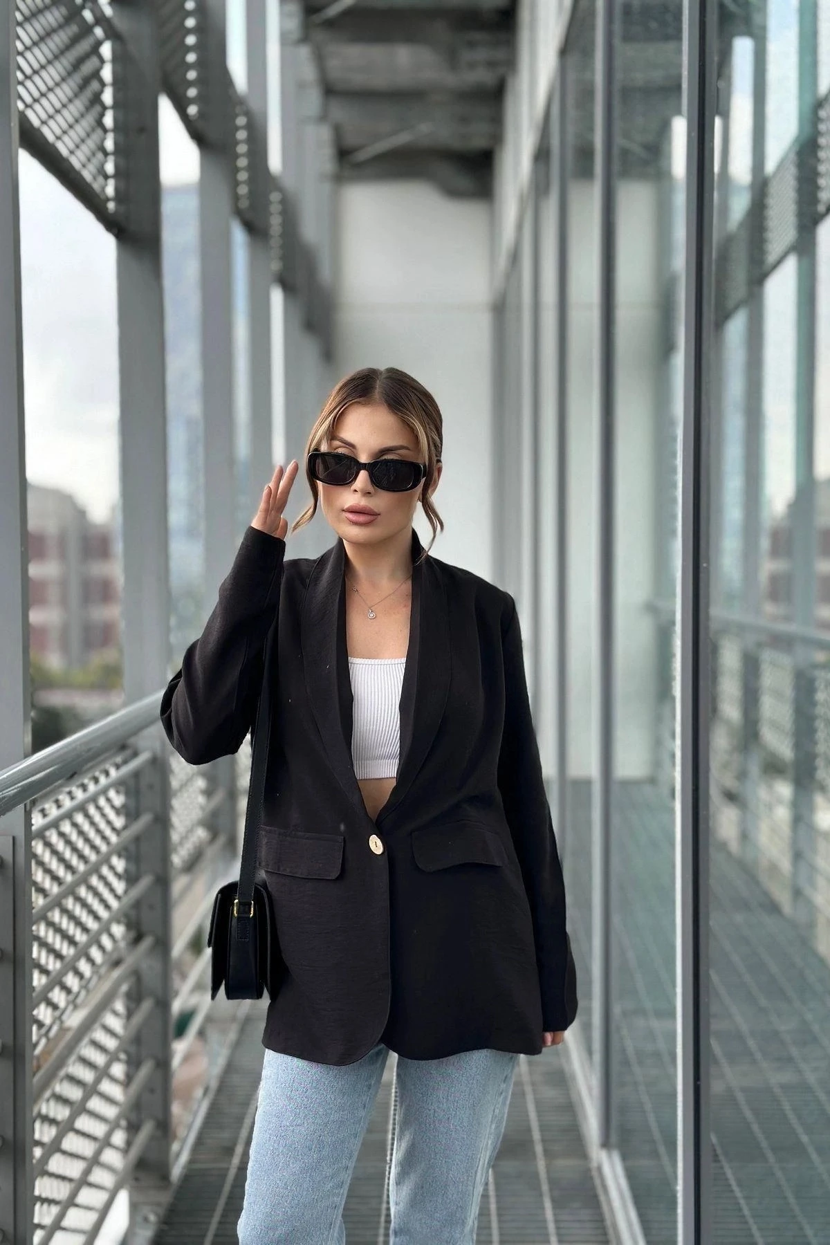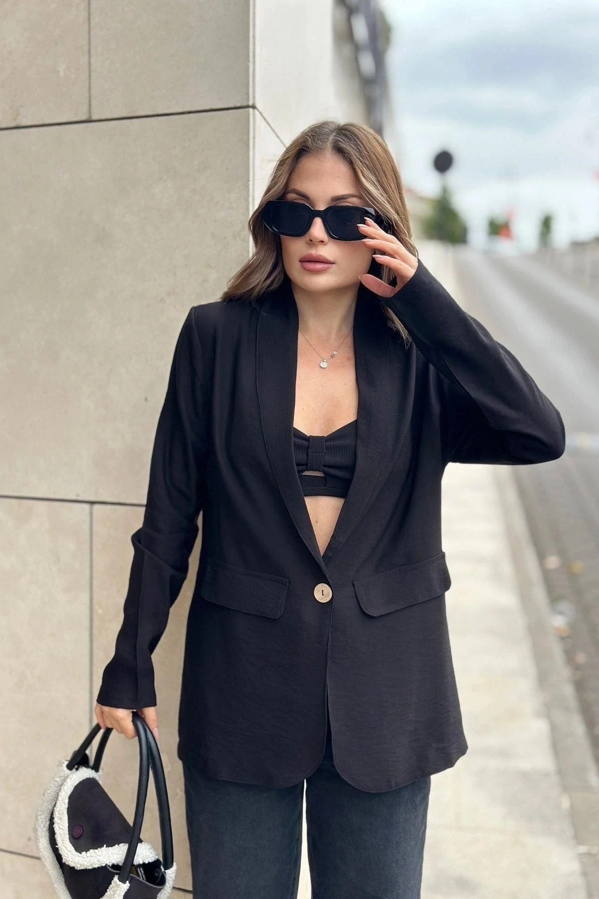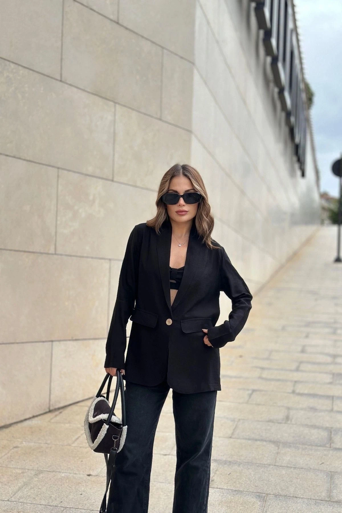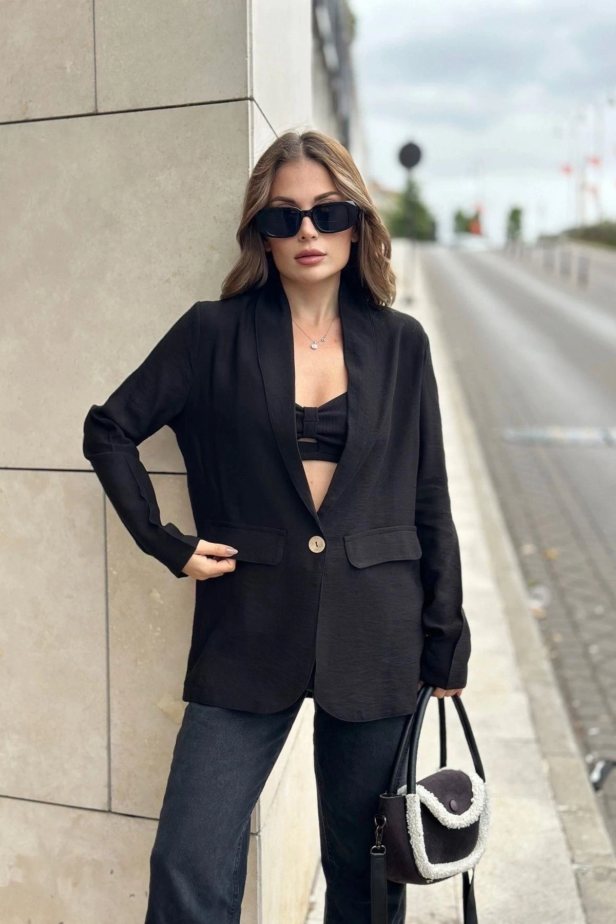 Kadın Siyah Ceket Yaka, Uzun Kol, Cep Kapak Detaylı, Keten, Tek Düğme Blazer Ceket