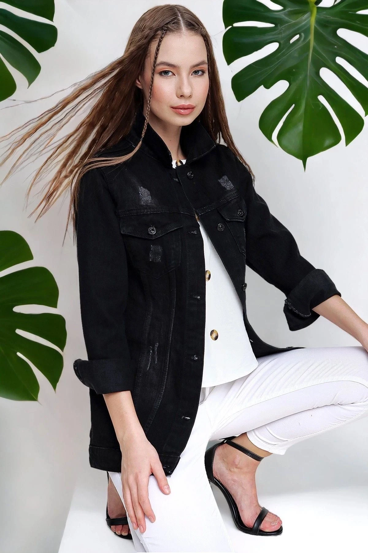 Kadın Siyah Ceket Yaka Uzun Kol Kot Jean Kot Kaliteli Kumaş Düz Kesim Ceket