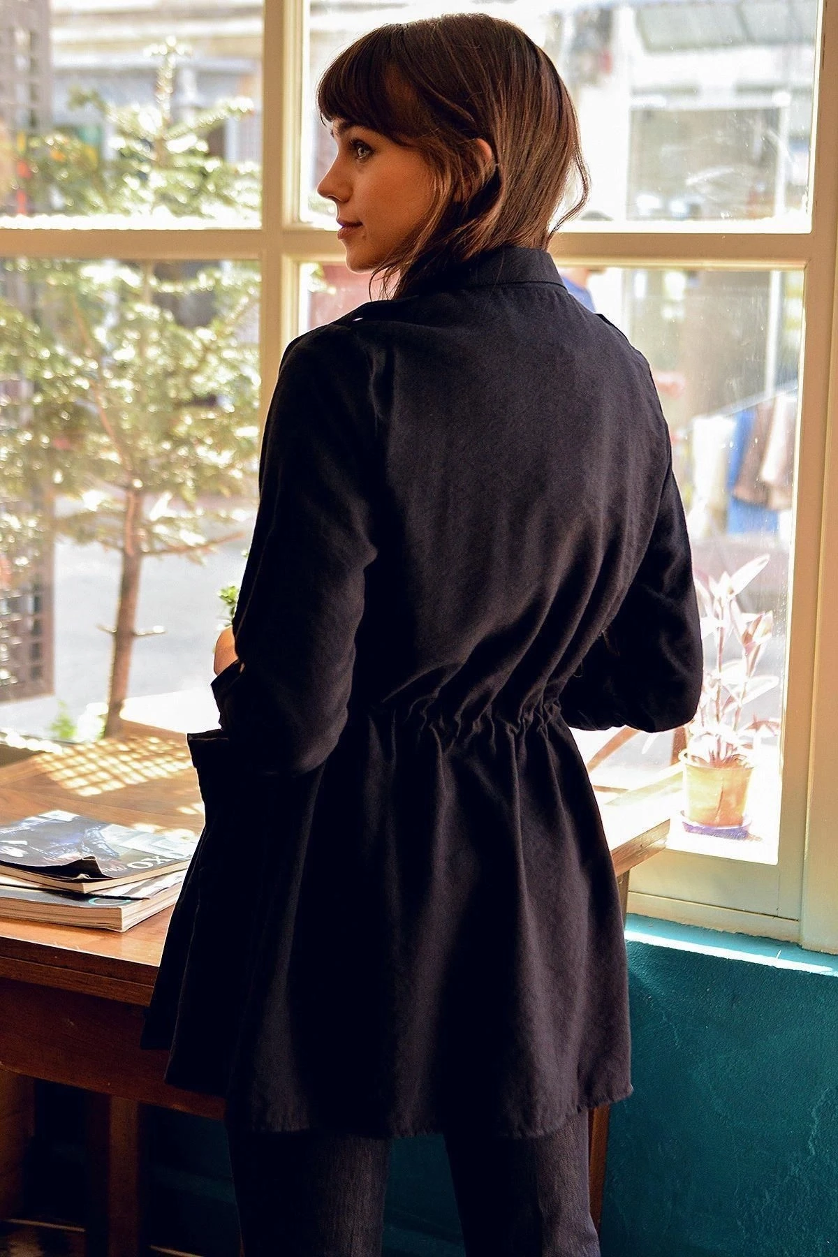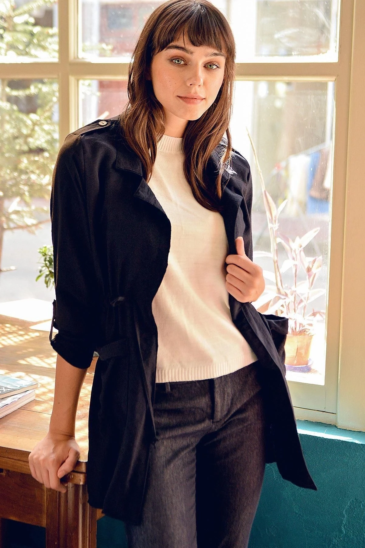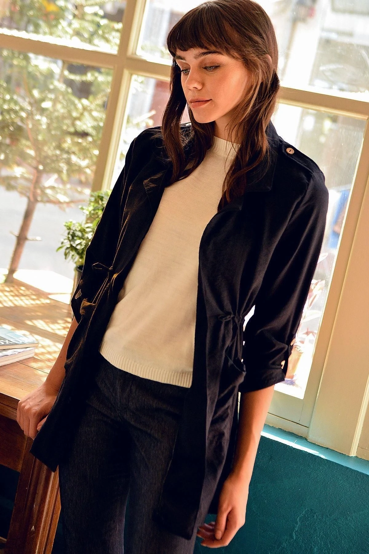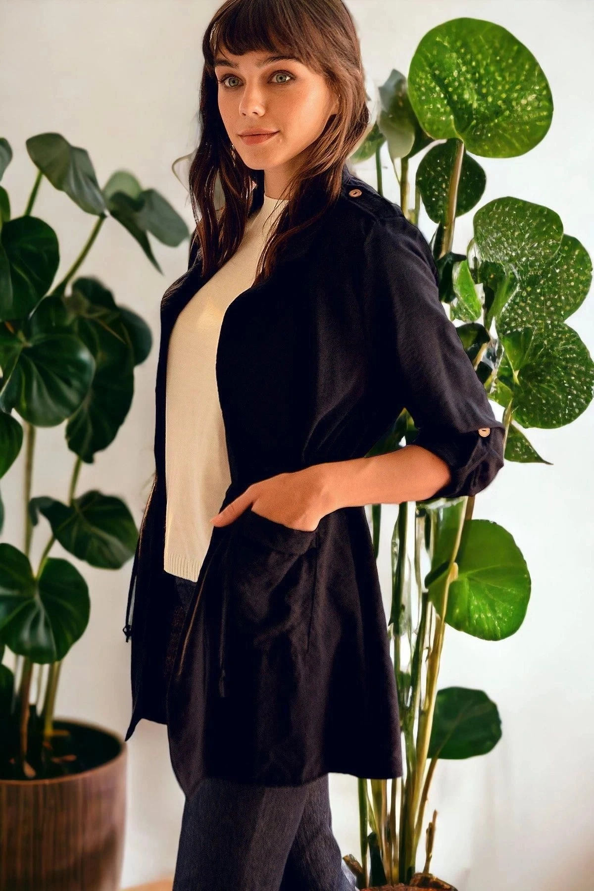 Kadın Siyah Cep Detaylı Uzun Kol Ceket Yaka Regular Kesim Standart Boy Ceket