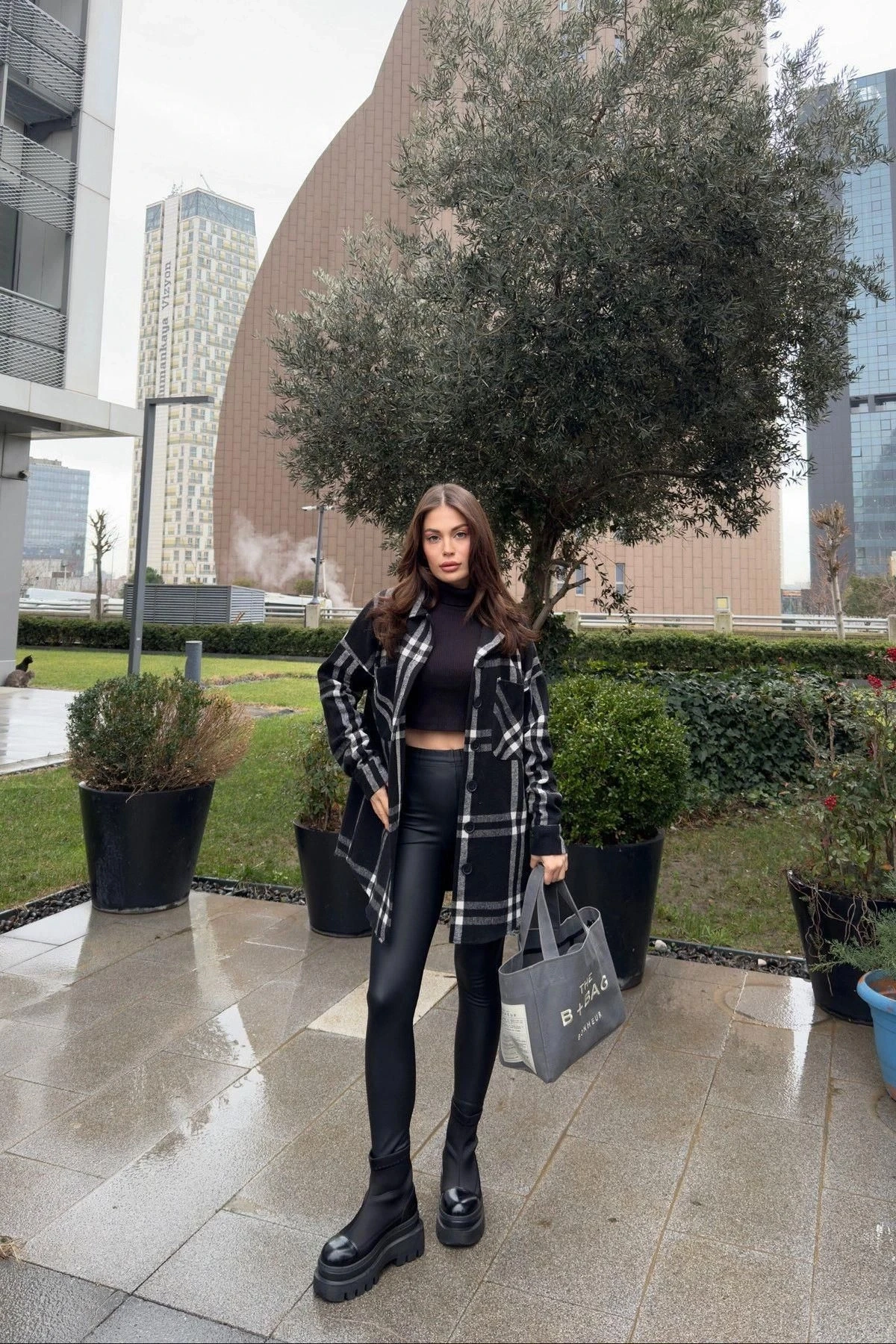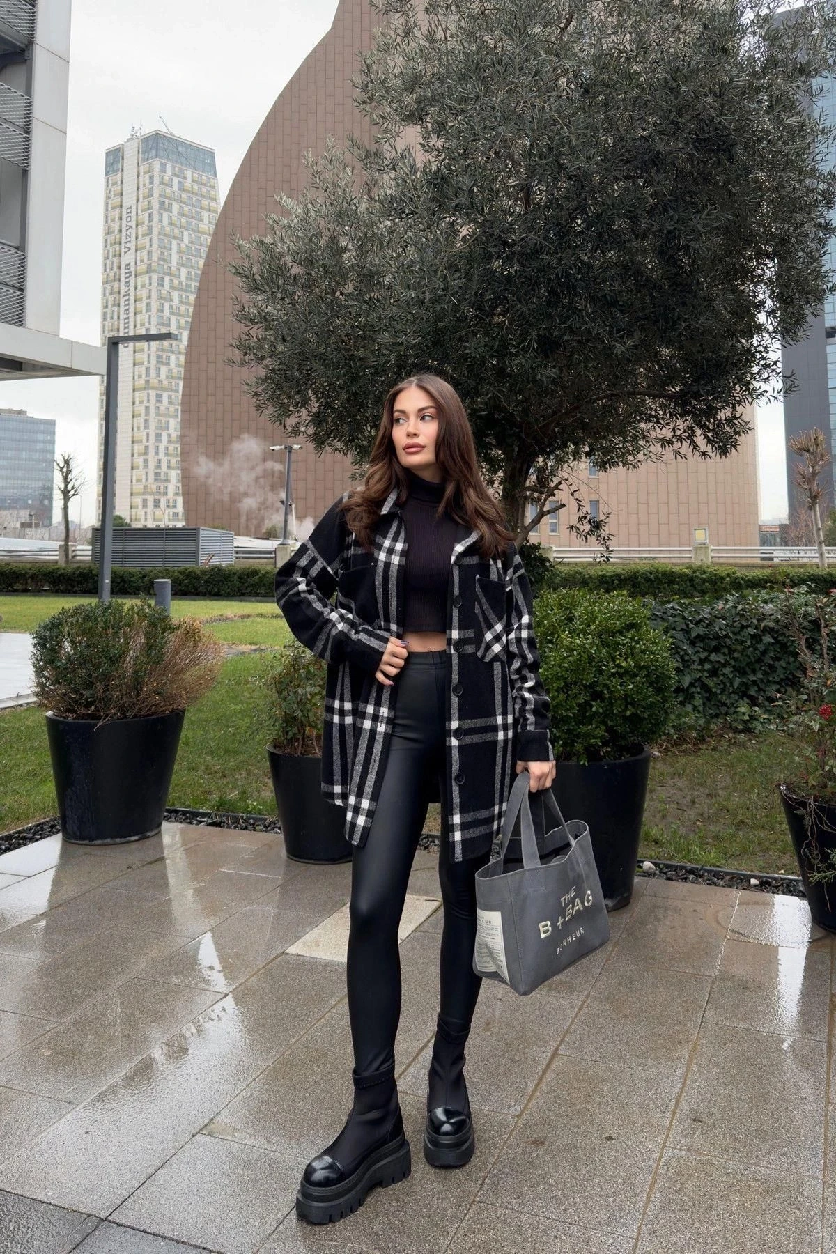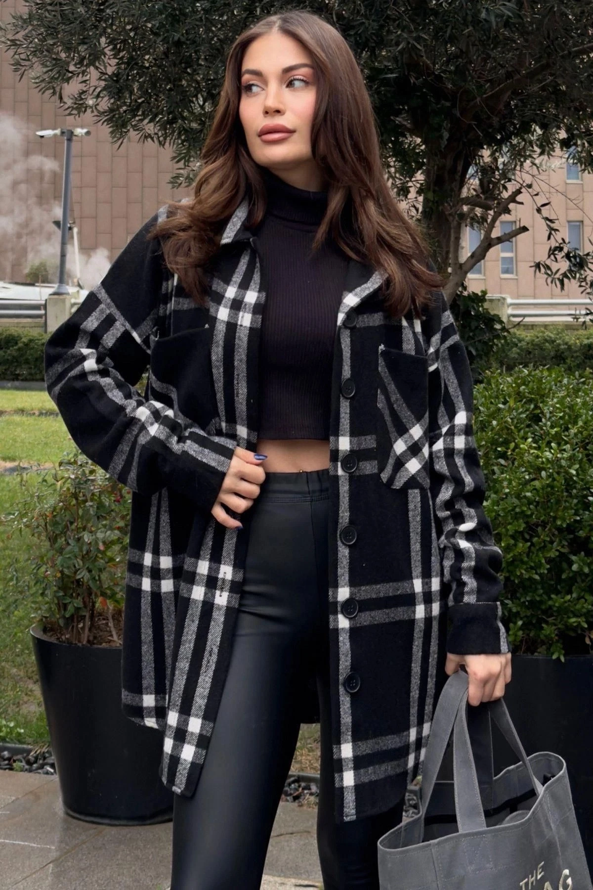 Kadın Siyah Çift Cepli, Ekose Desenli, Rahat Kalıp, Uzun Kaşe Gömlek