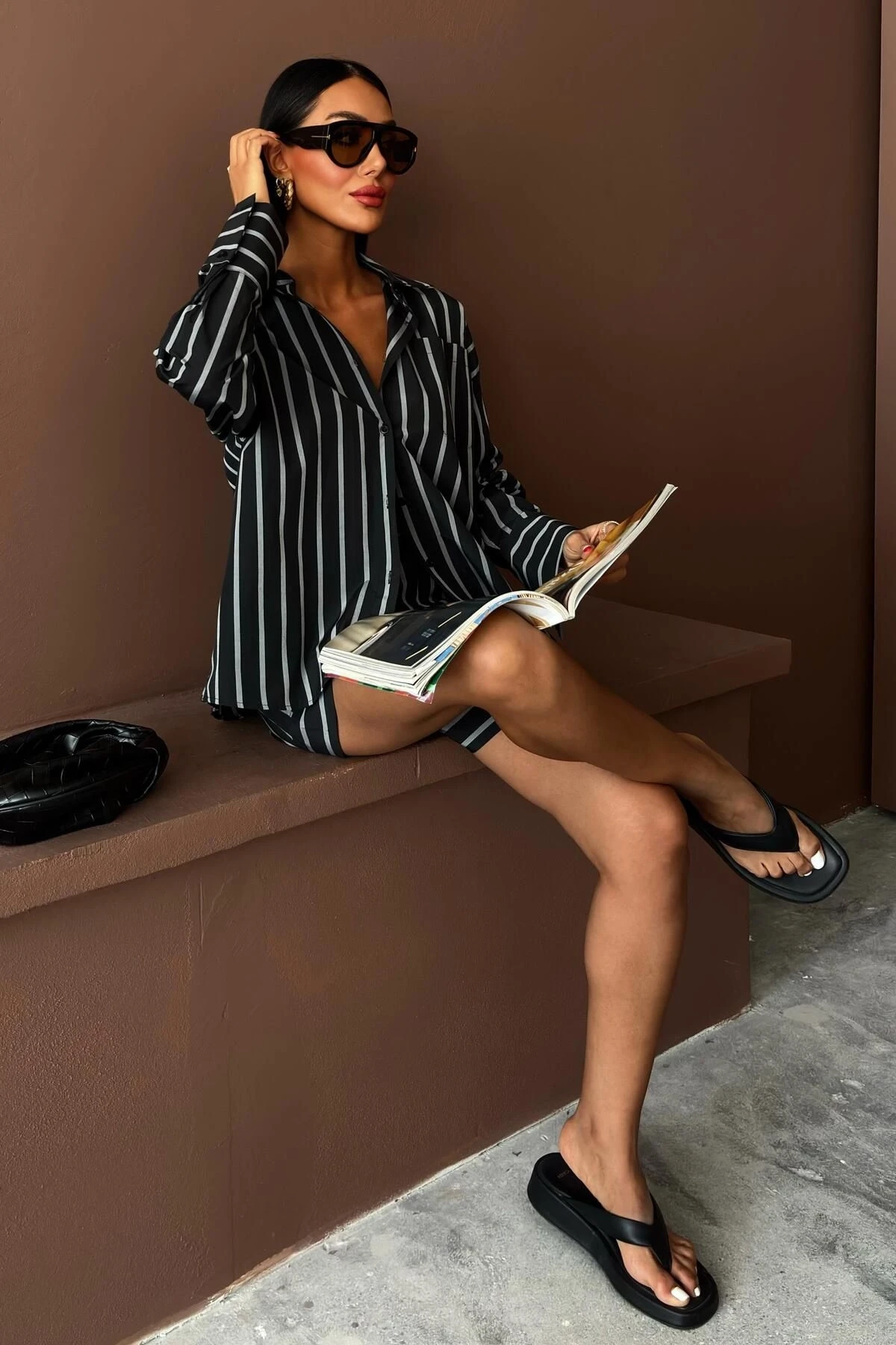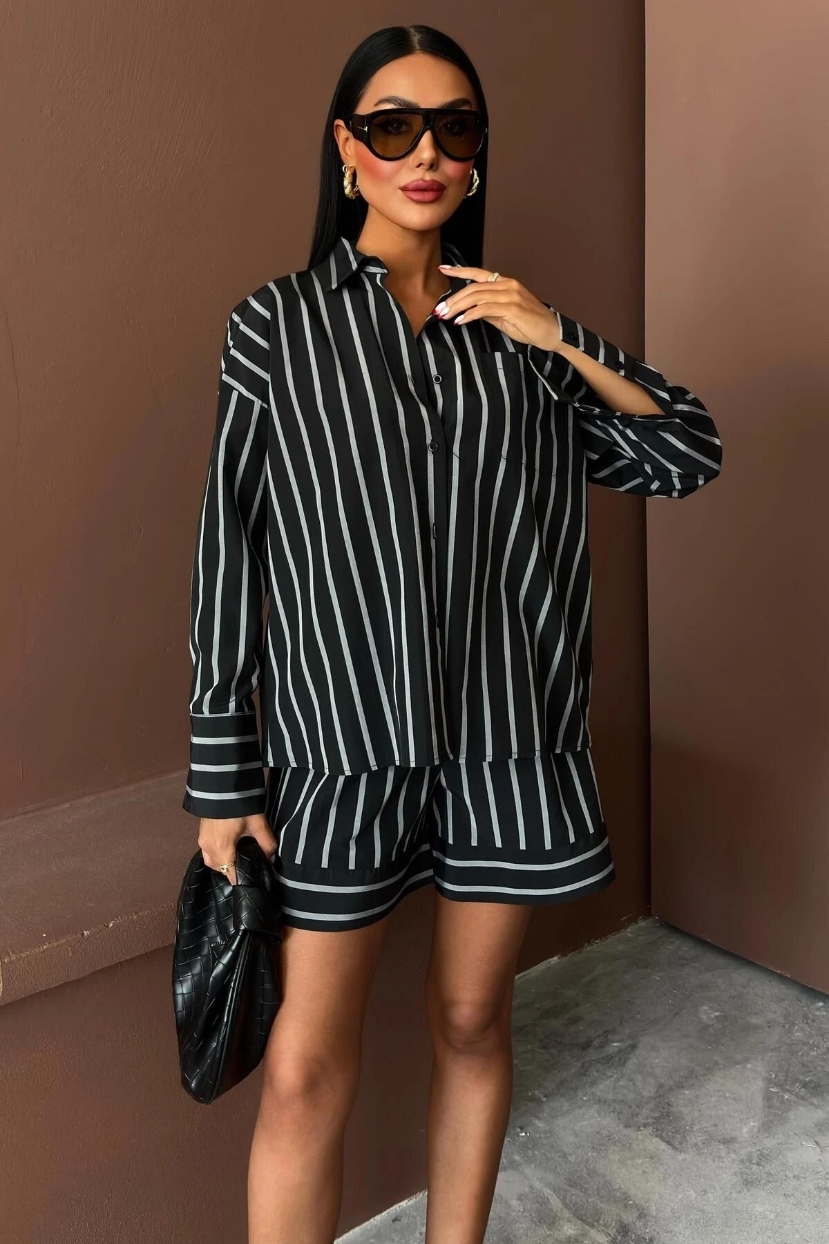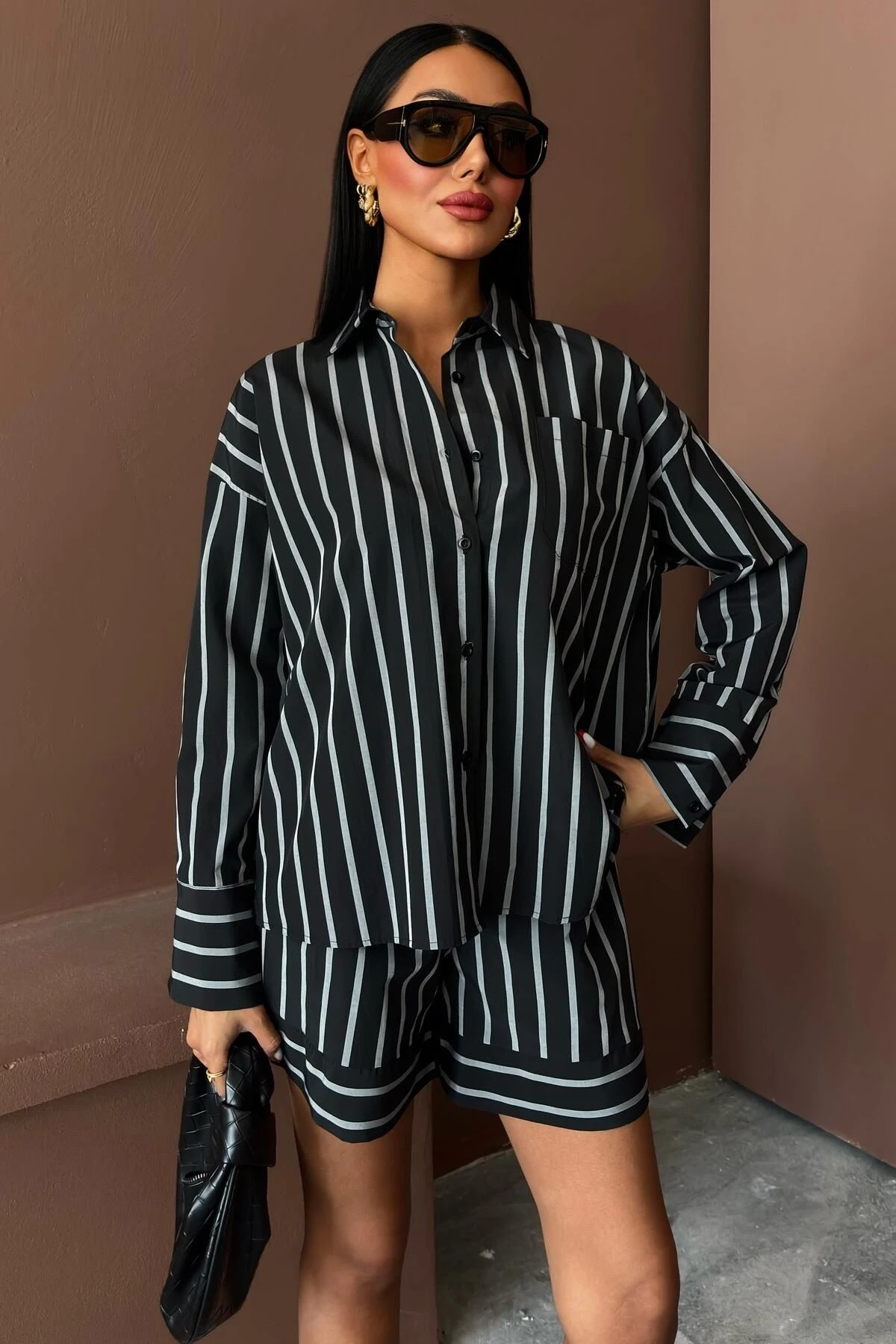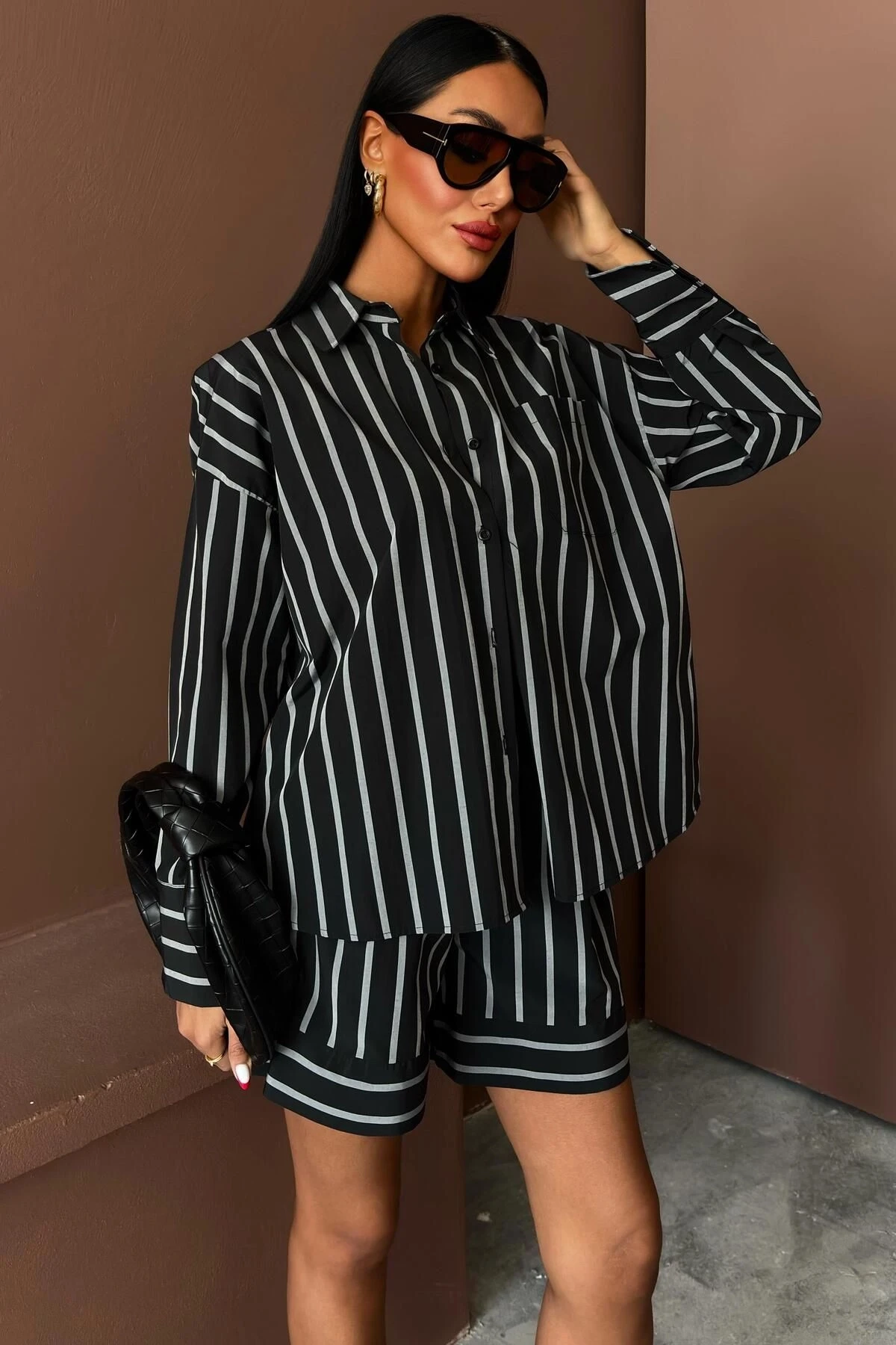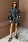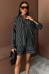 Kadın Siyah Çizgili Dokuma Uzun Kol Gömlek Yaka İkili Takım