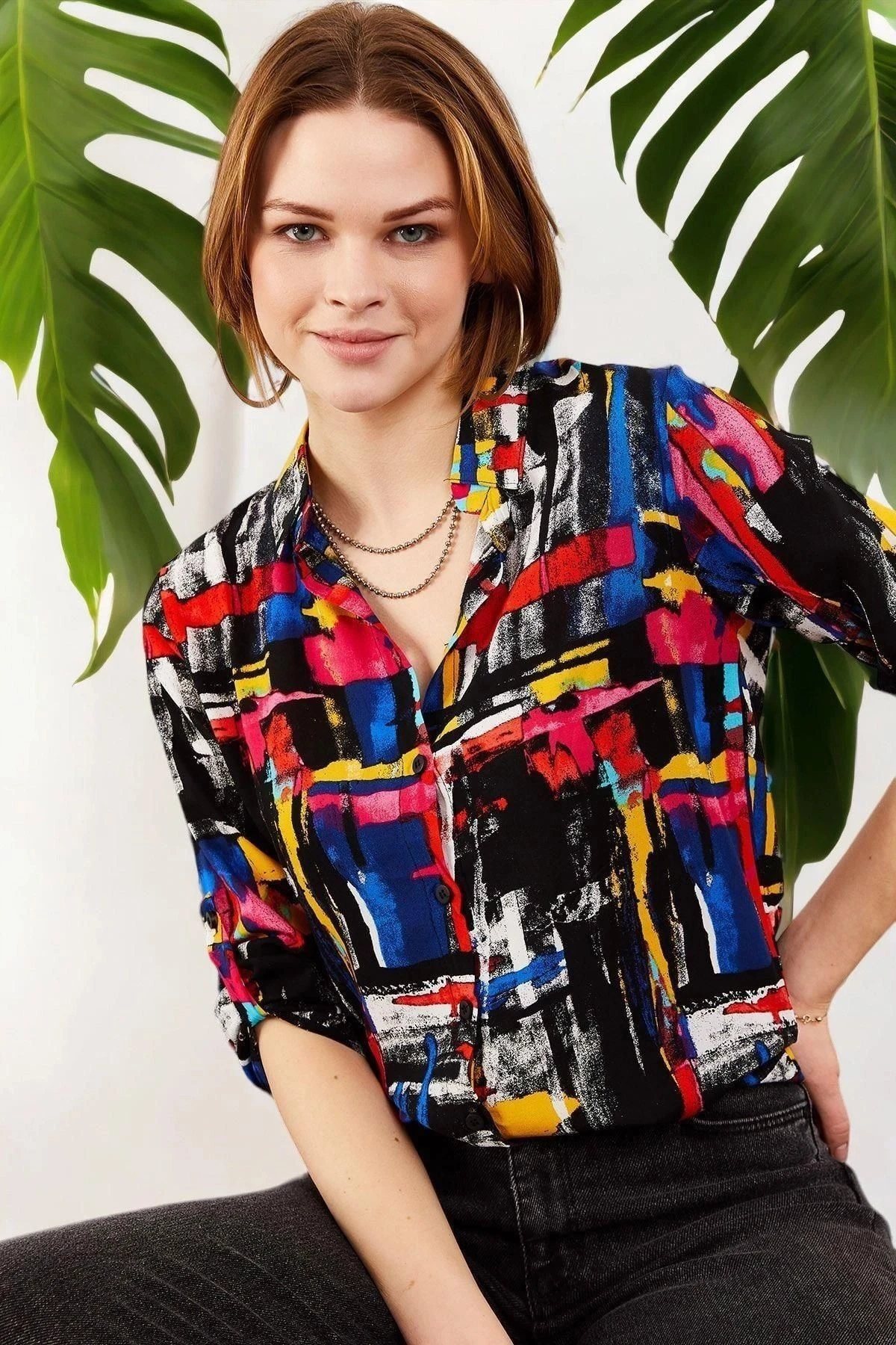 Bu siyah renkli, çok renkli desenli klasik yaka uzun kol gömlek, sadece şıklığa değil aynı zamanda rahatlığa da önem veren bir seçenektir.; Regular kesimi ve standart boyuyla her bedene uyum sağlar.; Ürünün kumaş içeriği %100 viscone'dan oluşur, bu da mükemmel bir yumuşaklık ve nefes alabilirlik sağlar.; Bu gömleğin en dikkat çekici özelliği, siyah renginin zarafeti ile birleşen çok renkli desenleridir.; Desenler, gömleğe enerjik bir görünüm kazandırırken aynı zamanda şıklığı da tamamlar.; Bu benzersiz tasarım, sıradanlıkta sıkışıp kalmak istemeyenler için mükemmel bir seçimdir.; Klasik yaka tasarımı, gömleğe biraz formalite katarken aynı zamanda şık bir görünüm sunar.; Bu detay, hem resmi etkinliklerde hem de günlük yaşamda tarzınızı yansıtmanızı sağlar.; Regular kesim ve standart boyu, her beden için mükemmel bir uyum sağlar.; Rahat bir giyim deneyimi sunarken, vücut hatlarınızı zarif bir şekilde vurgular.; Gömleğin ölçüleri, çoğu kişiye mükemmel bir uyum sağlayacak şekilde tasarlanmıştır.; Bu gömlek, %100 viscone kumaşıyla üretilmiştir.; Viscone, yumuşak dokusu ve nefes alabilme özelliği ile bilinen bir malzemedir.; Bu sayede, gömlek vücudunuzda rahatça hareket etmenizi sağlar ve gün boyu ferahlık hissi sağlar.; Şıklık ve rahatlık arayanlar için mükemmel bir seçenek olan siyah renkli, çok renkli desenli klasik yaka uzun kol gömlek, gardırobunuzun vazgeçilmez bir parçası olmaya aday.; Herhangi bir sosyal veya özel durumda şık ve özgün bir görünüm elde etmek için bu gömleği tercih edebilirsiniz.