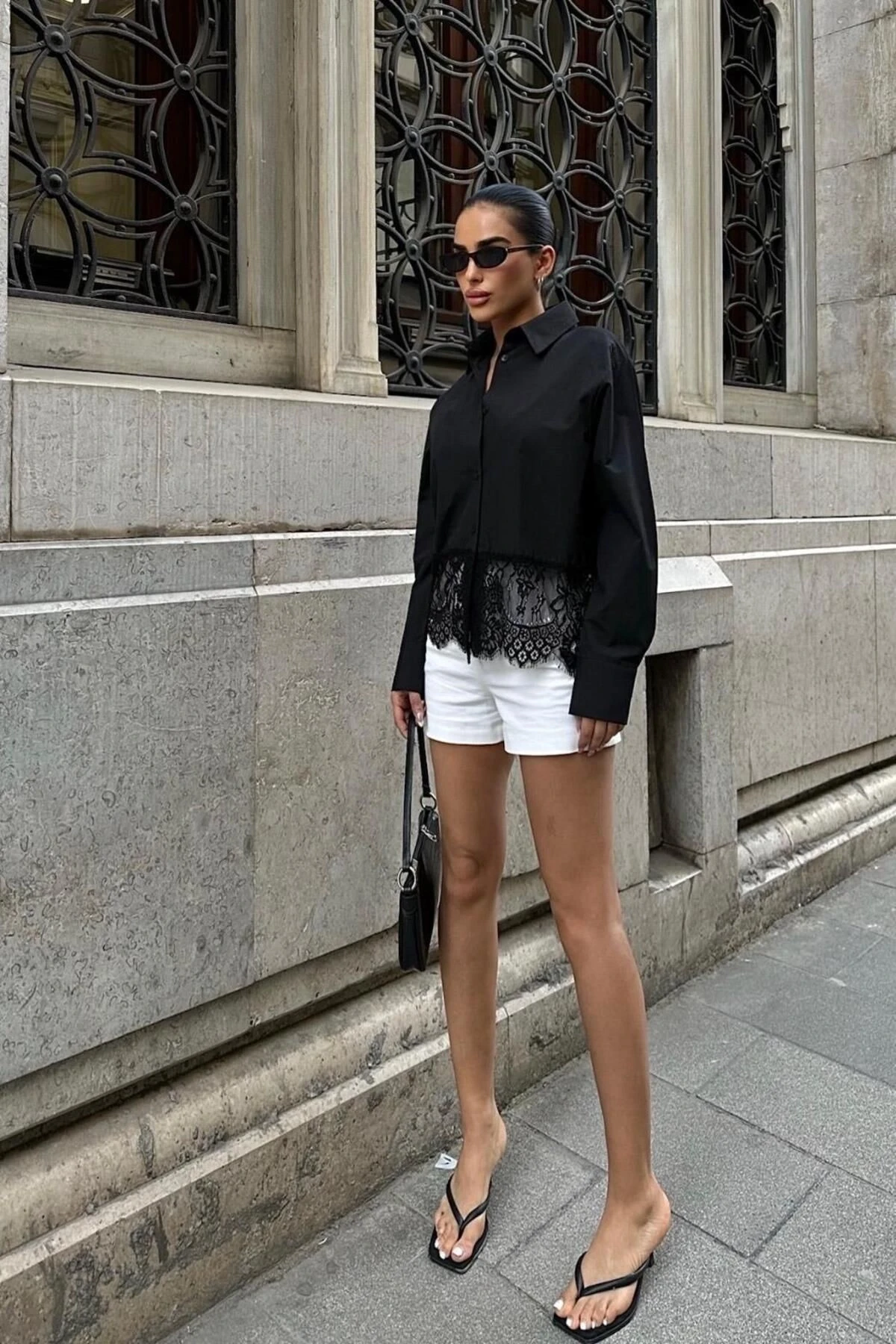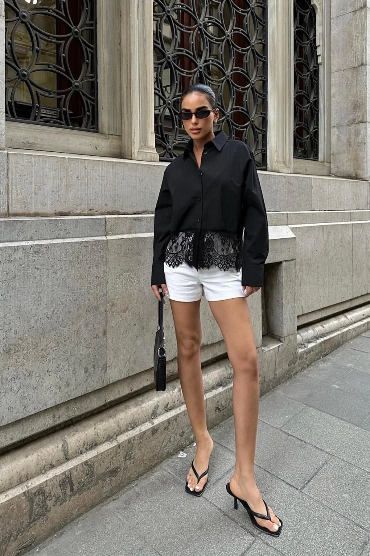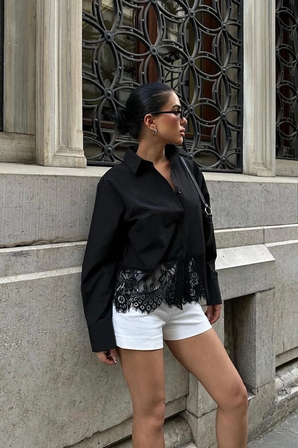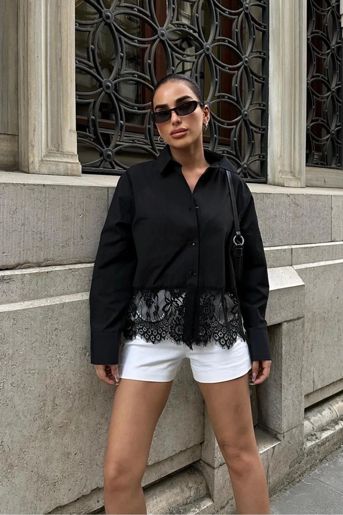 Kadın Siyah Dantel Detaylı Dokuma Kısa Gömlek