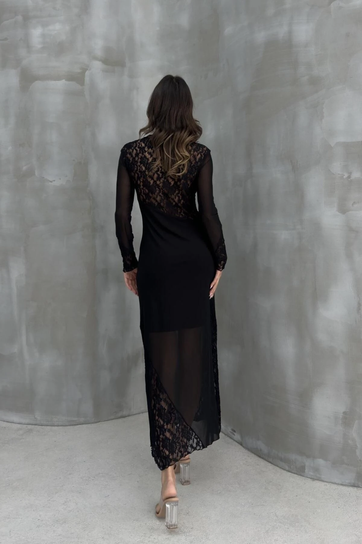 Kadın Siyah Dantel Detaylı Lycra Tül Uzun Elbise