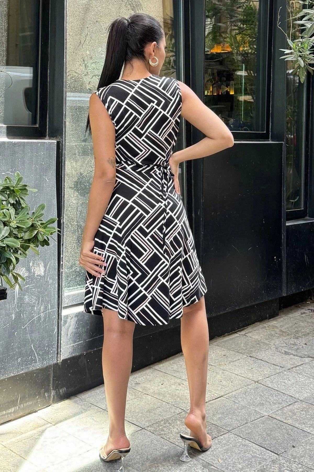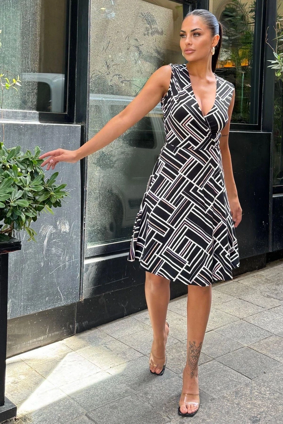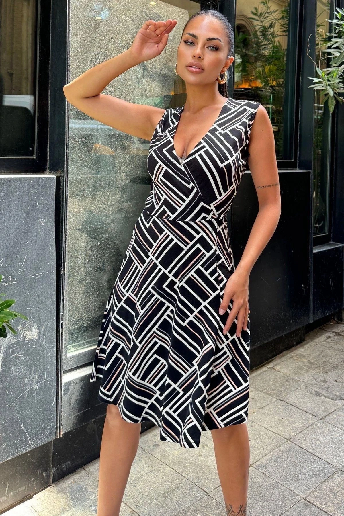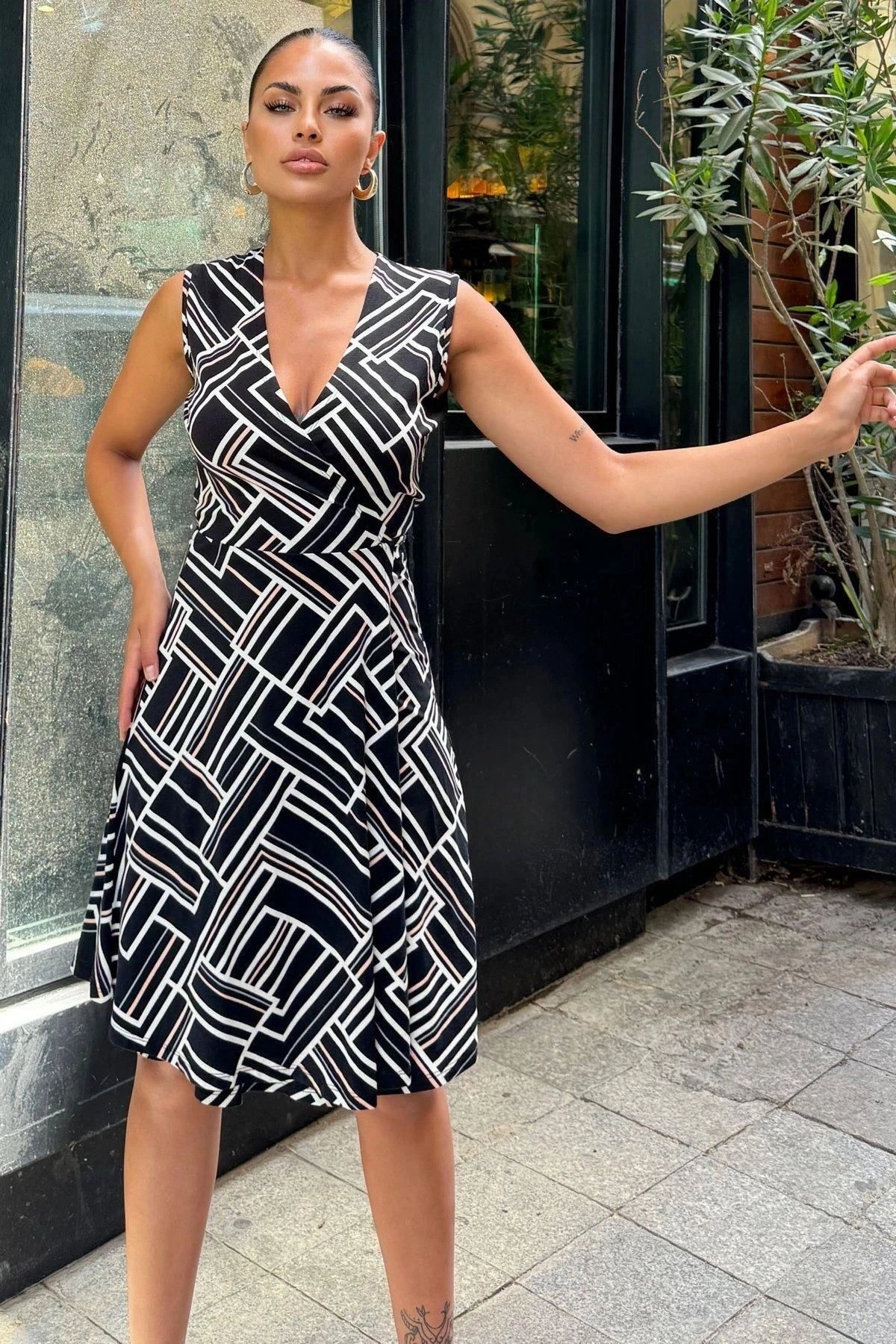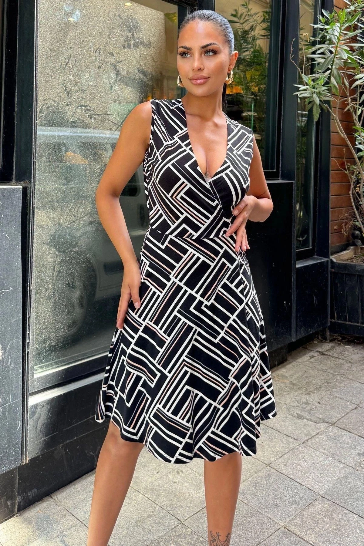 Kadın Siyah Desenli, Dekolte Kruvaze Yaka, A Kesim, Kolsuz Midi Elbise