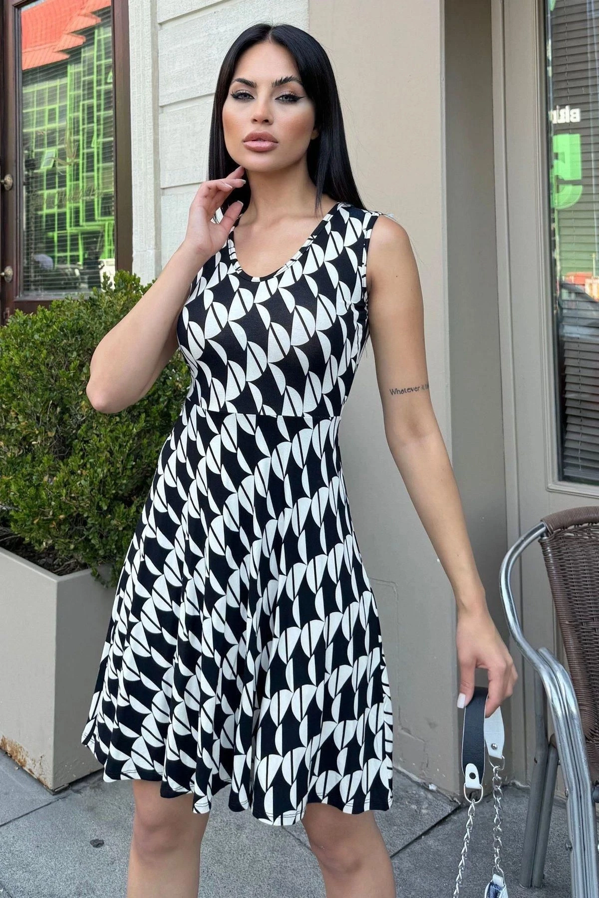 Kadın Siyah Desenli, Kolsuz, V Yaka, Kolsuz, Midi Kloş Elbise