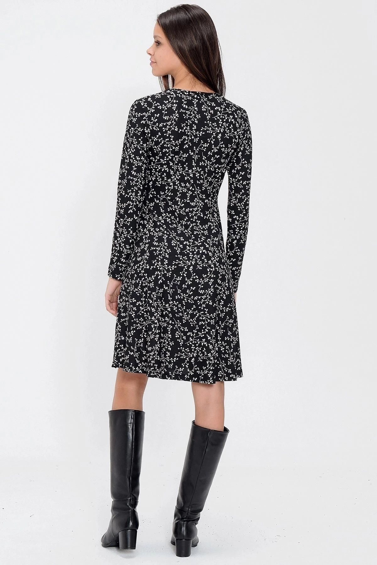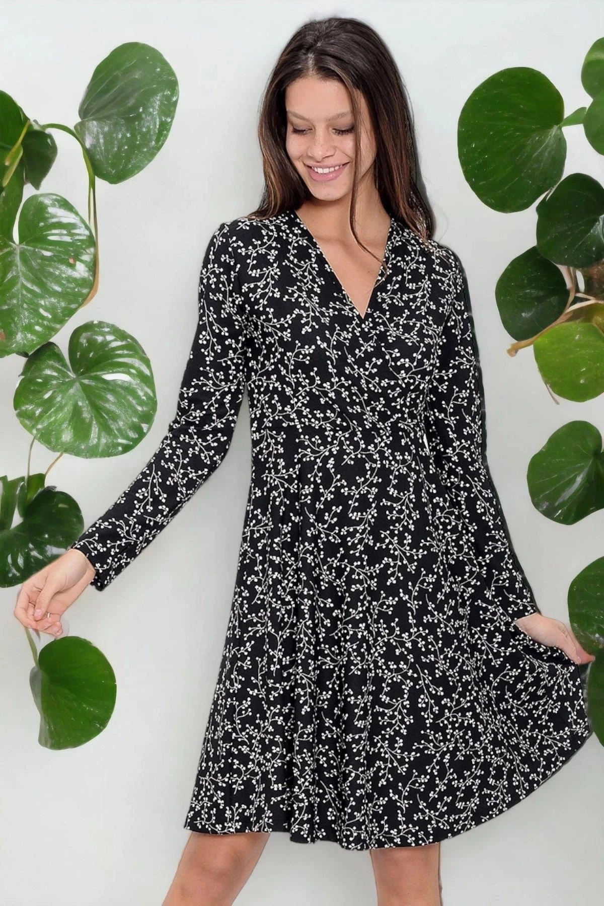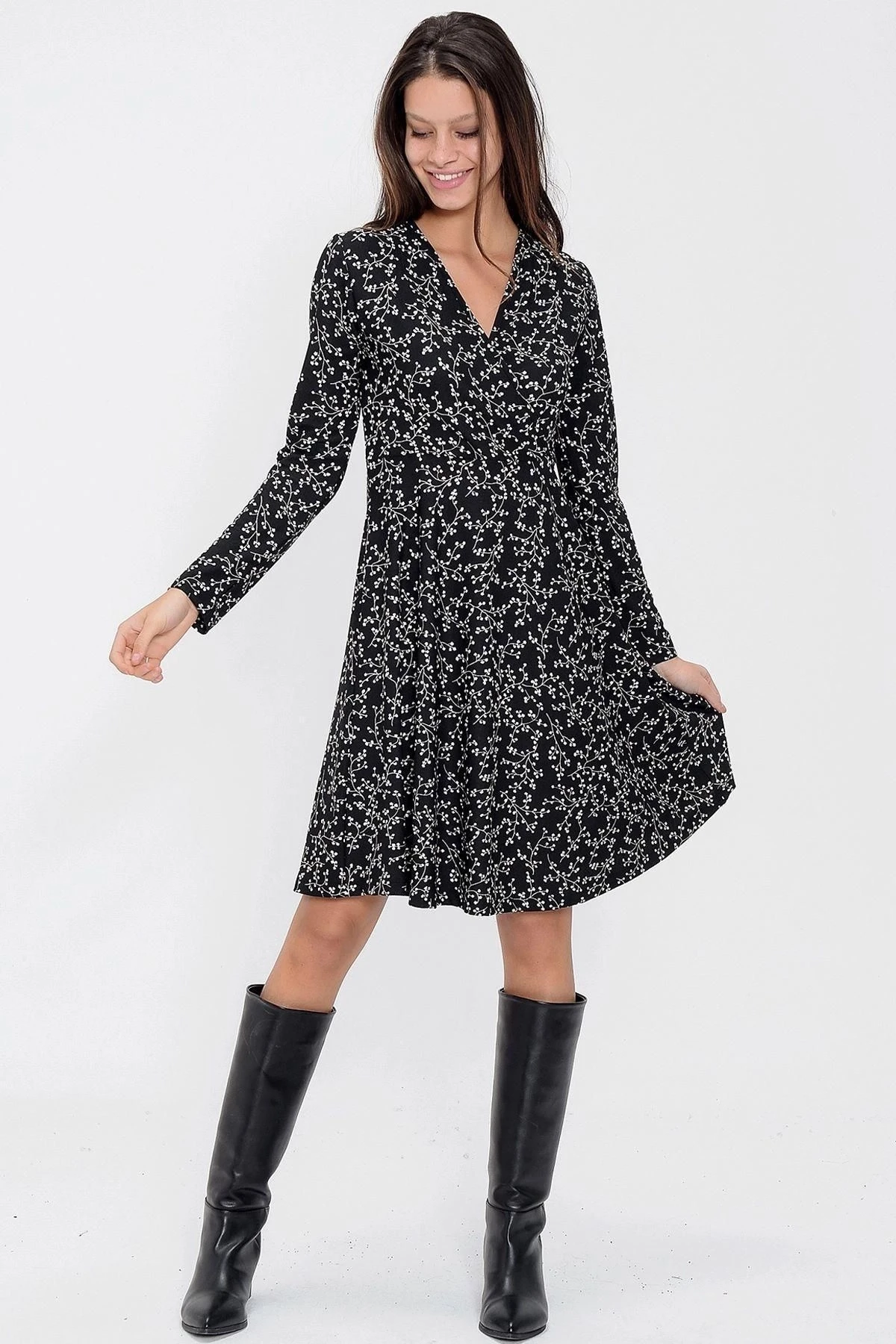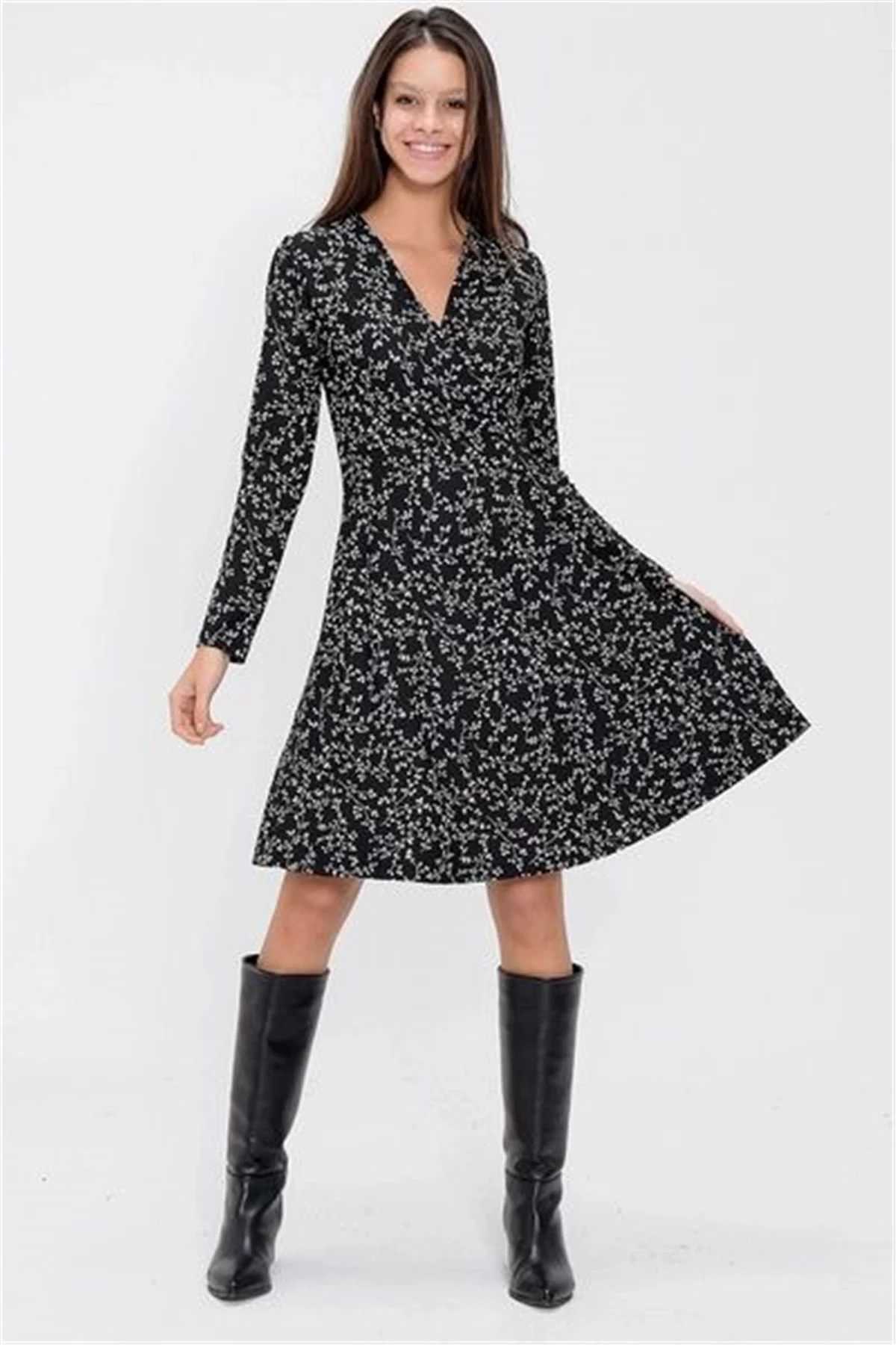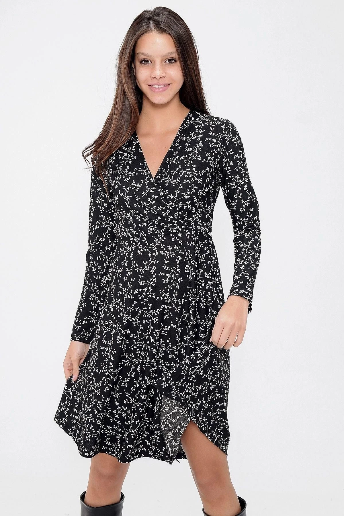Kadın Siyah Desenli Uzun Kol Kruvaze Yaka Dizüstü Elbise