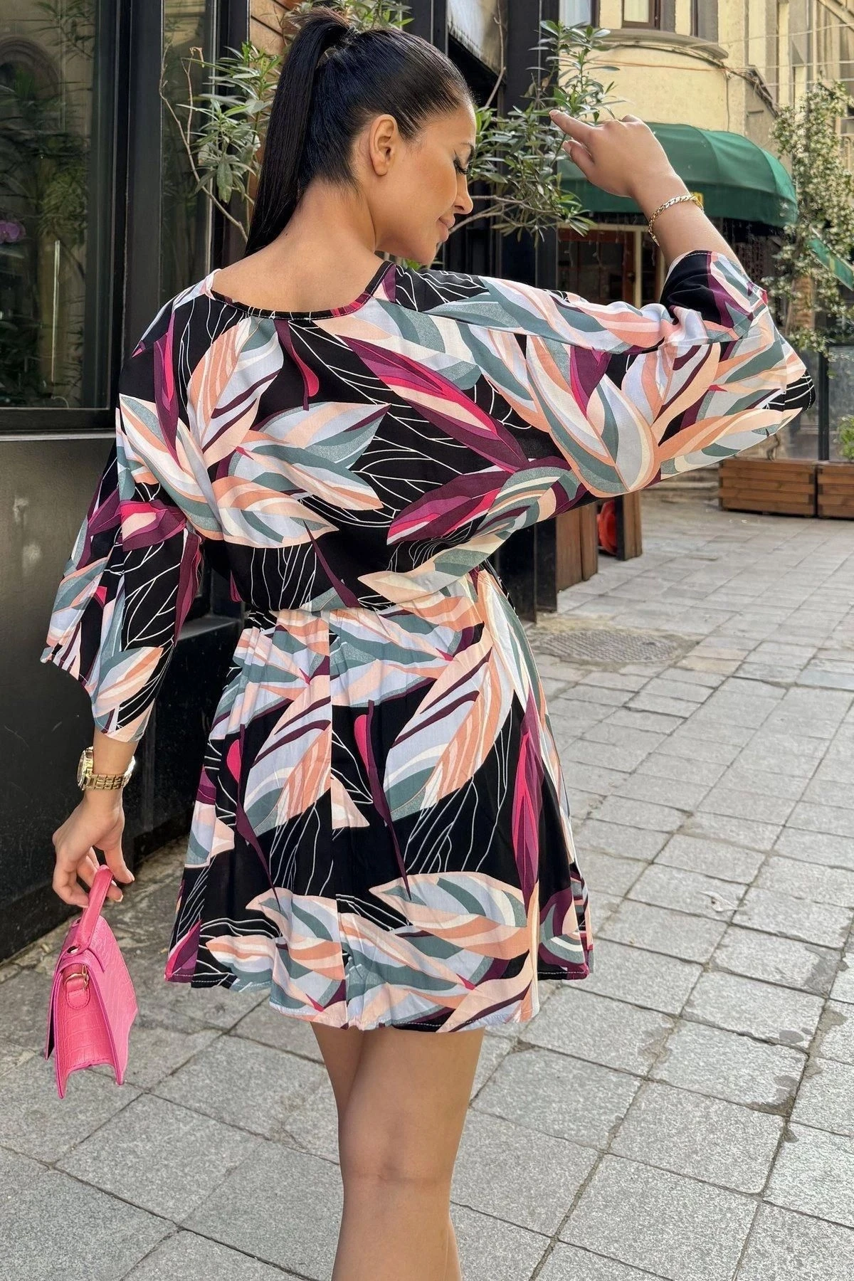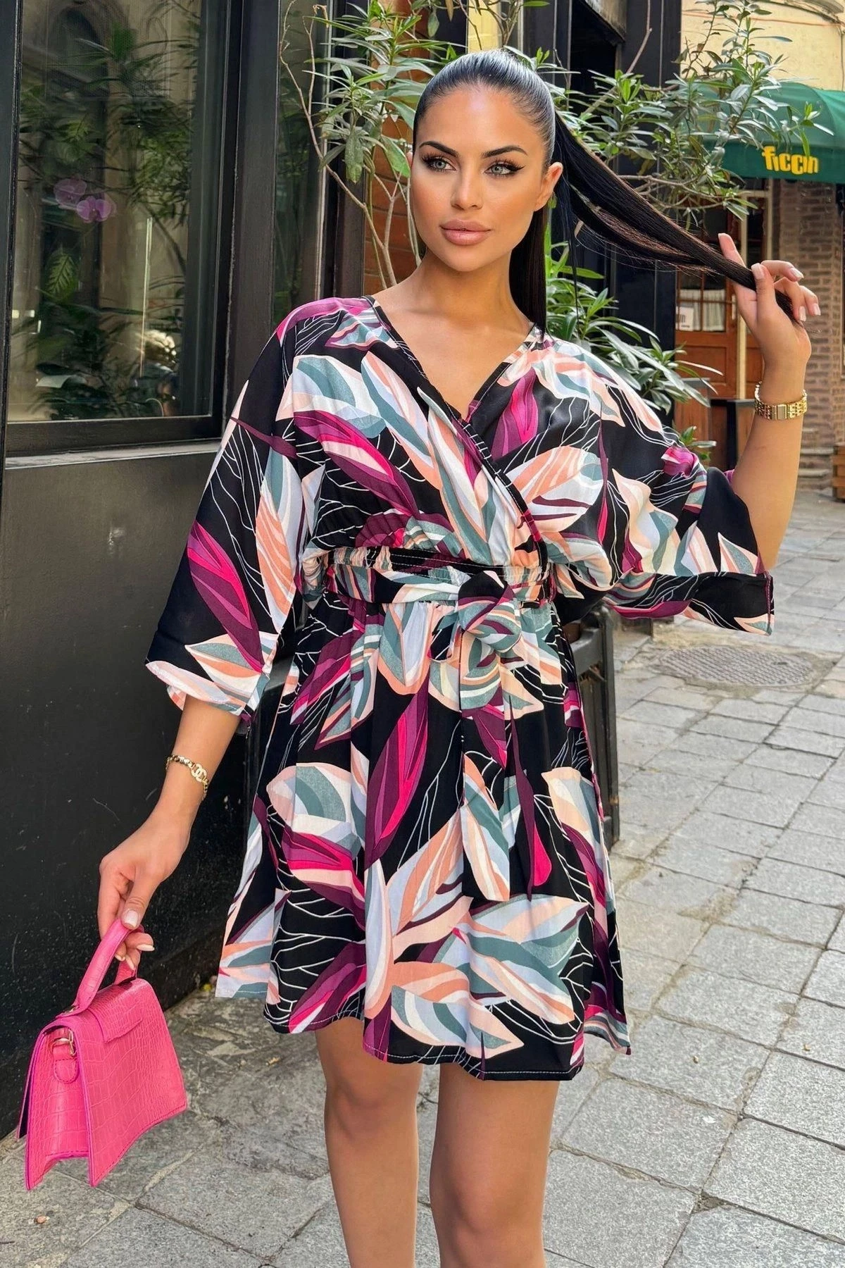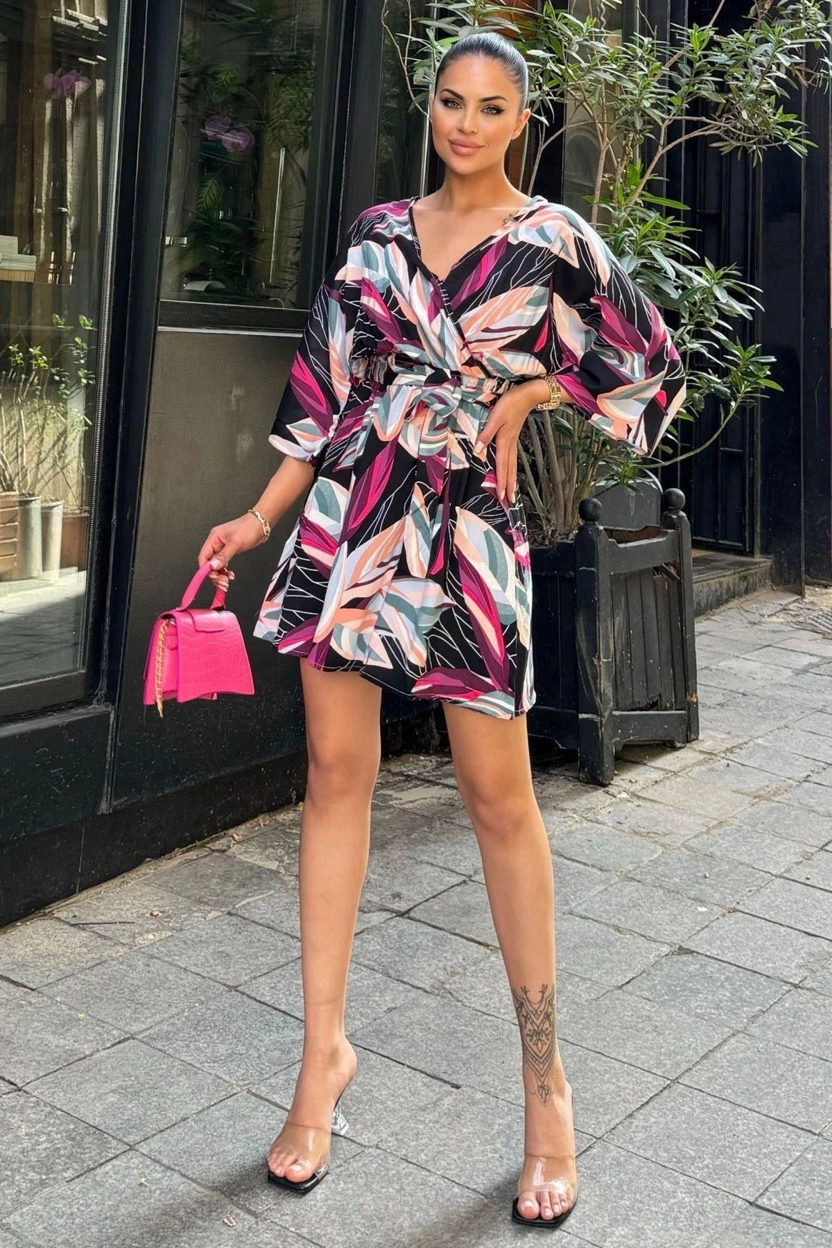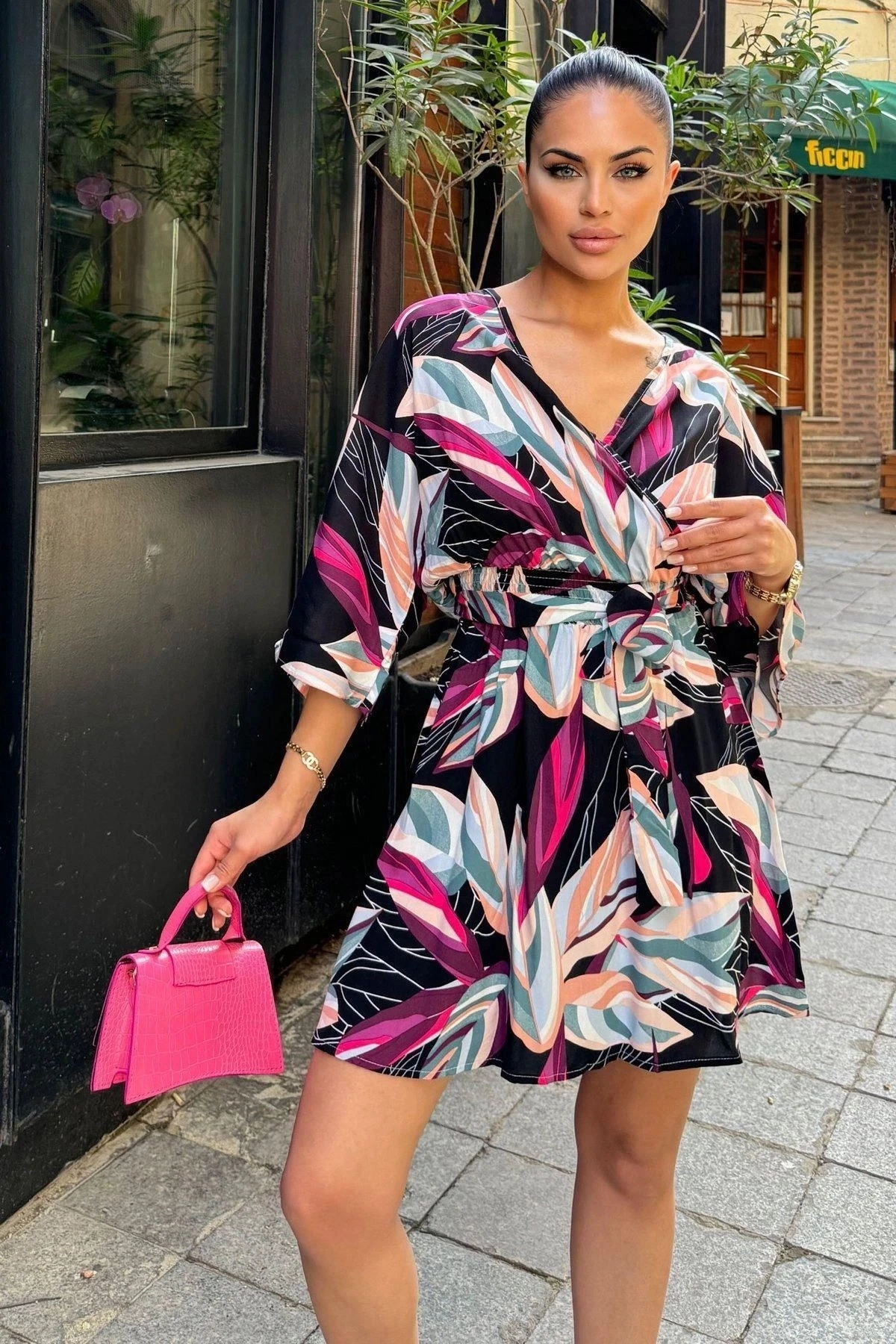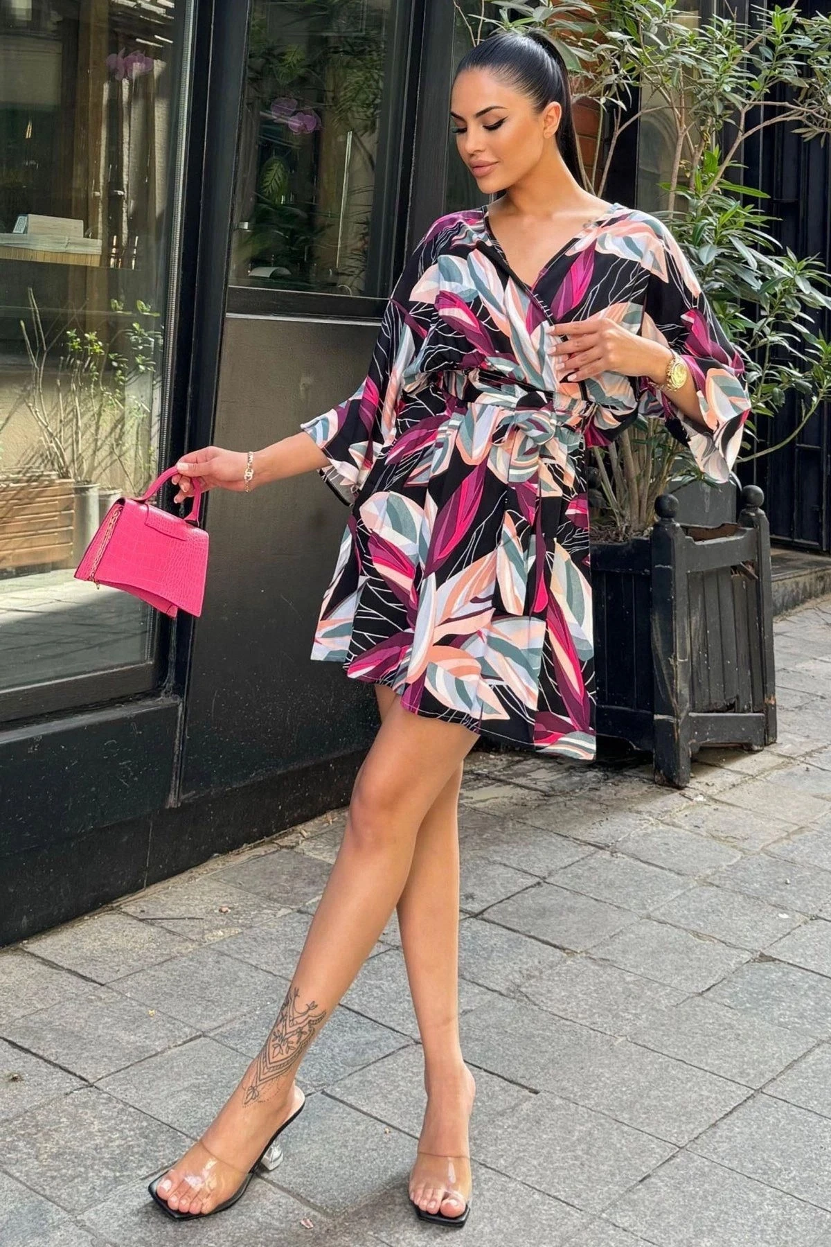 Kadın Siyah Desenli Viskon, Yarasa Kol, Kruvaze Mini Kimono - Kloş Kısa Elbise