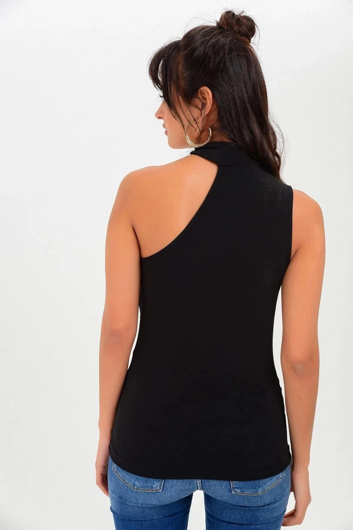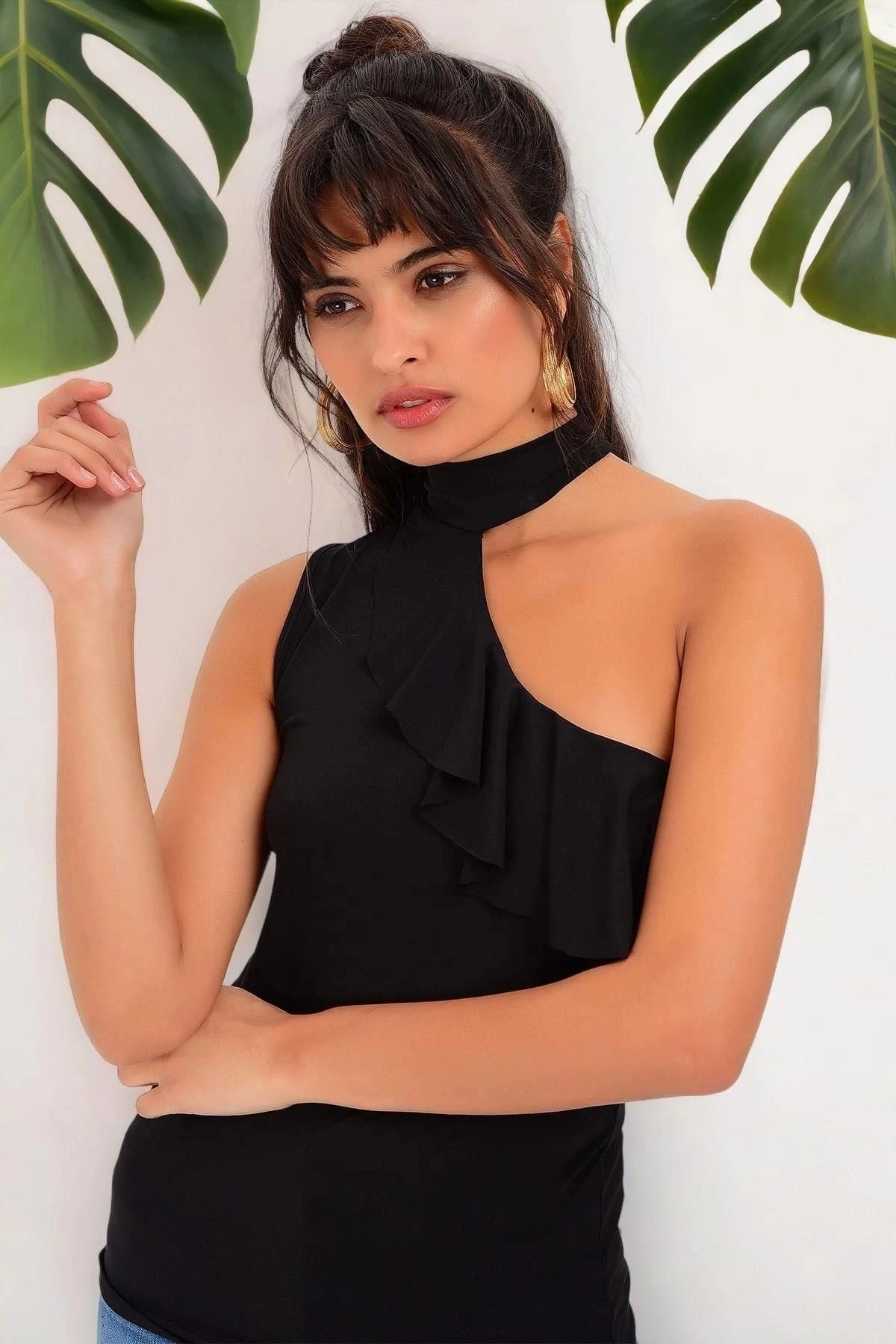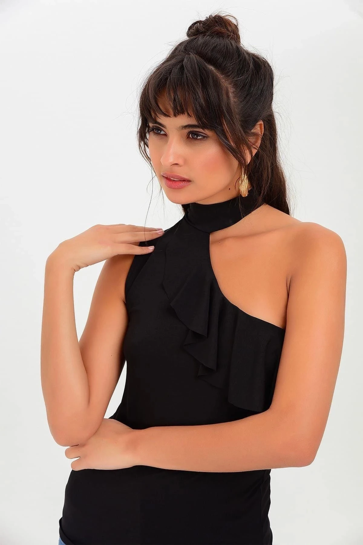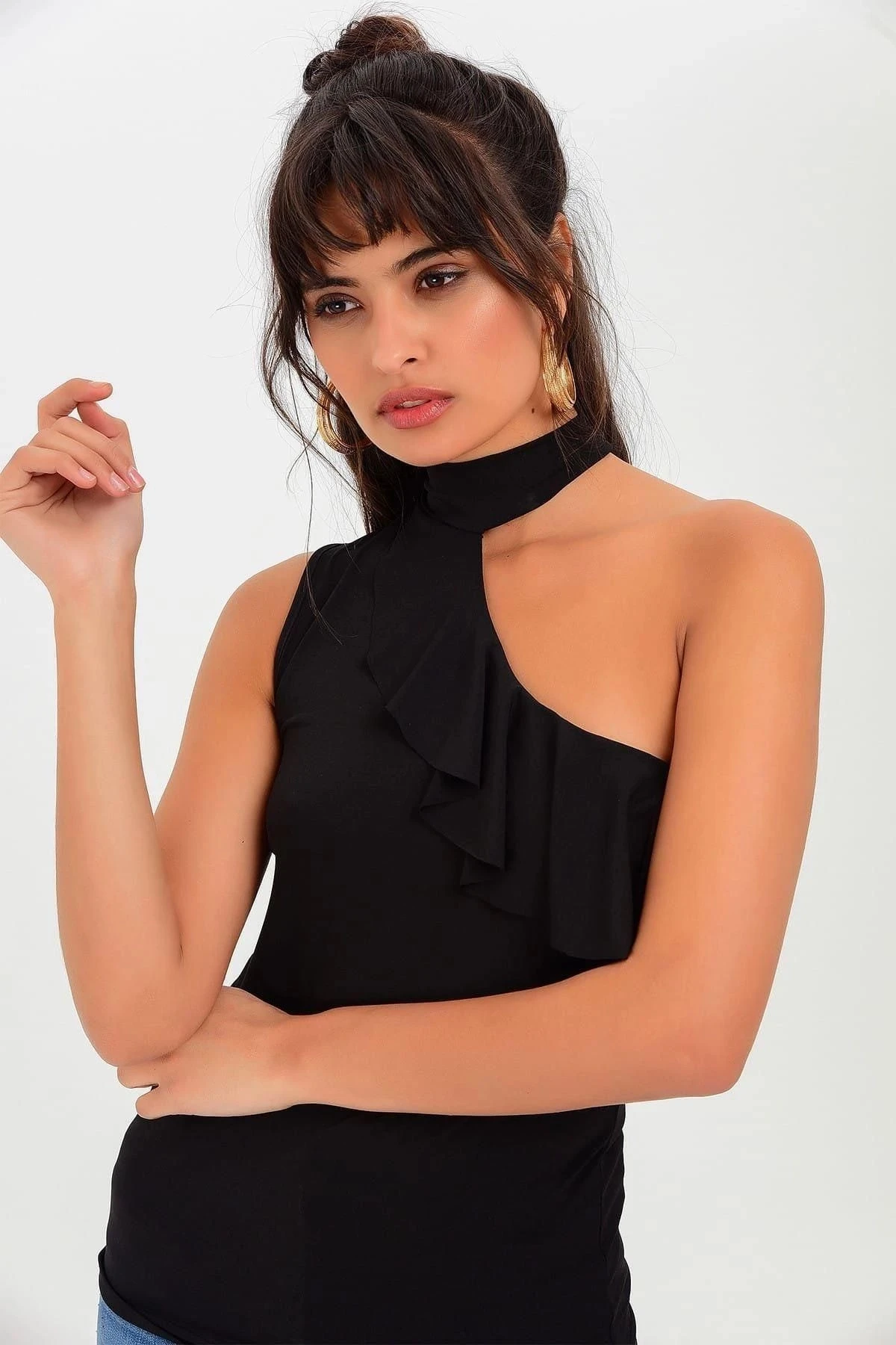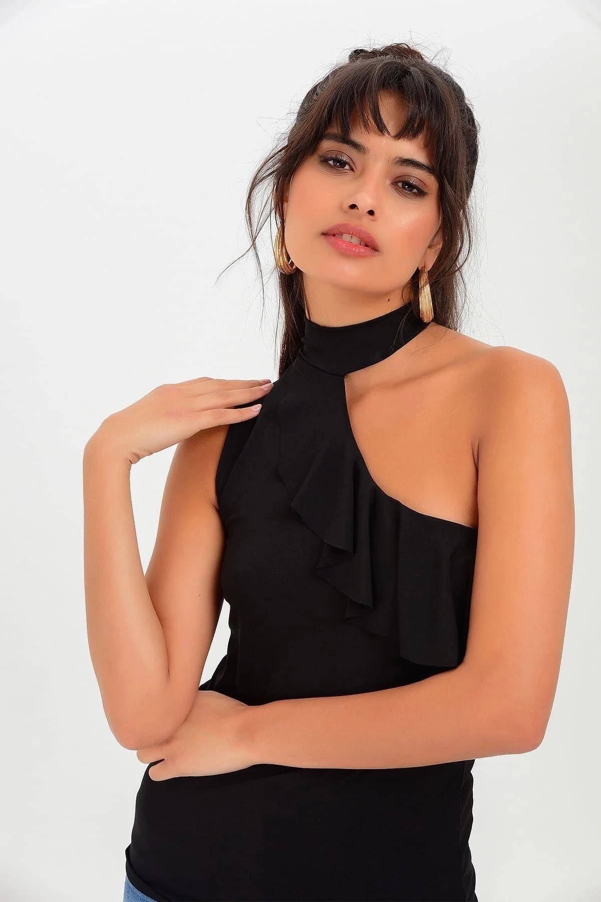 Kadın Siyah Dik Yaka Sıfır Kol Pencere Detaylı, Fırfırlı Regular Kesim Standart Boy Bluz
