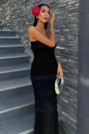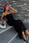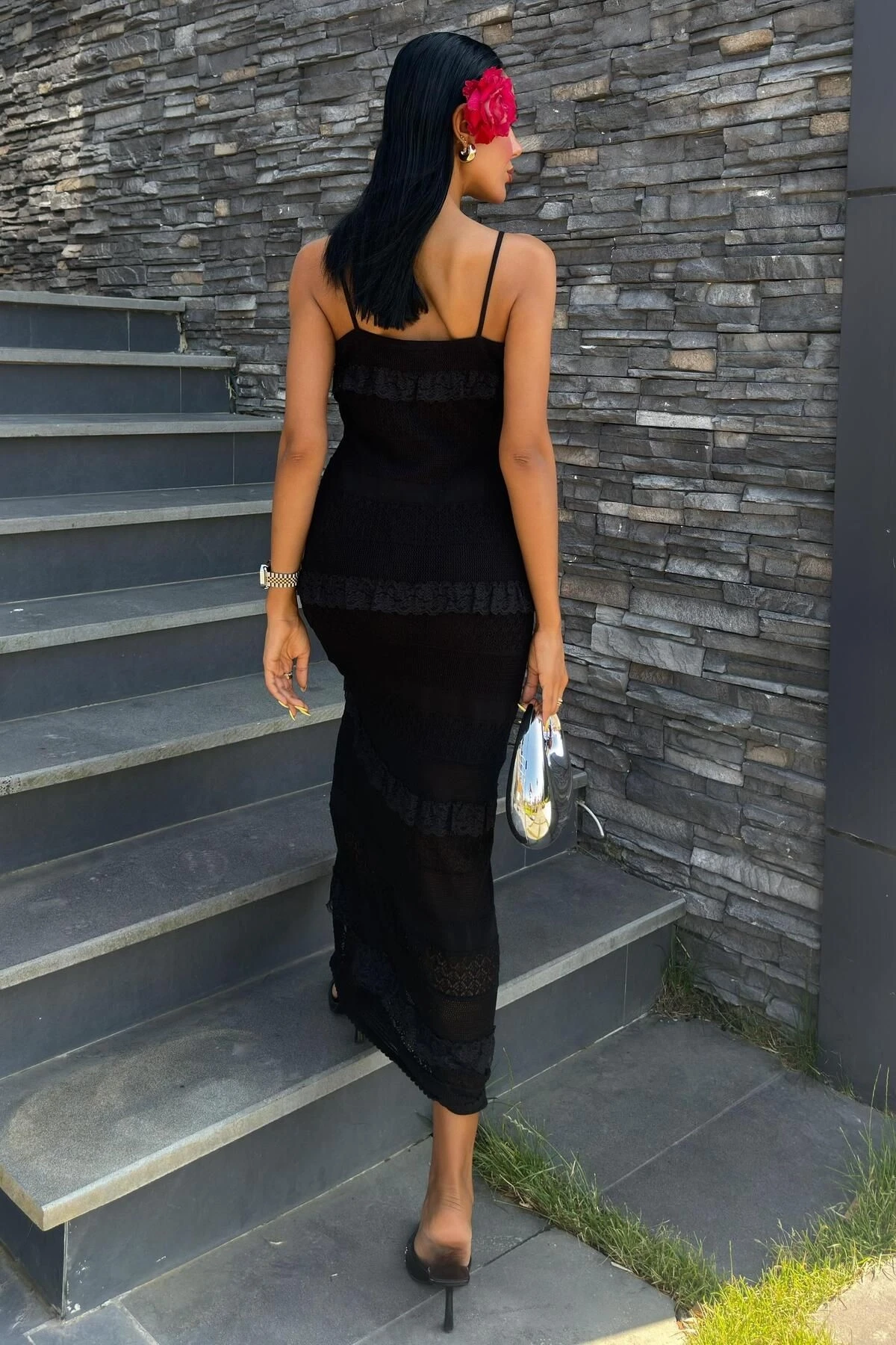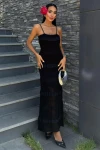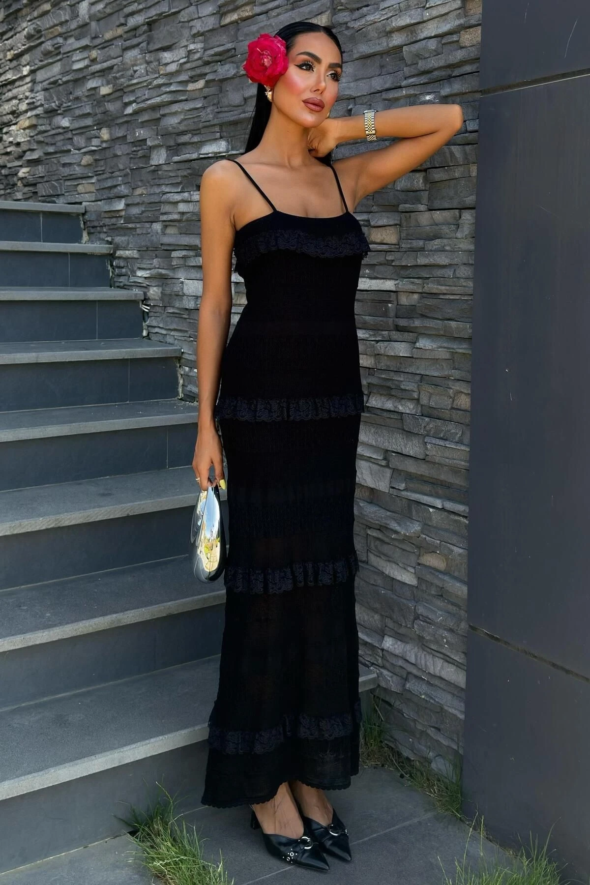 Kadın Siyah Dokuma Dantel Askılı Maxi Elbise
